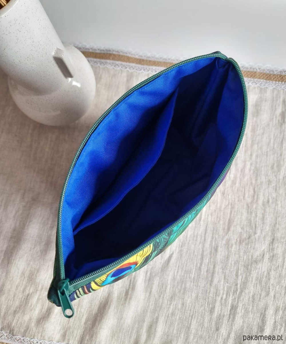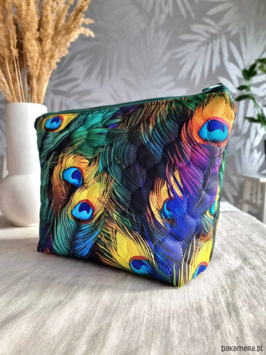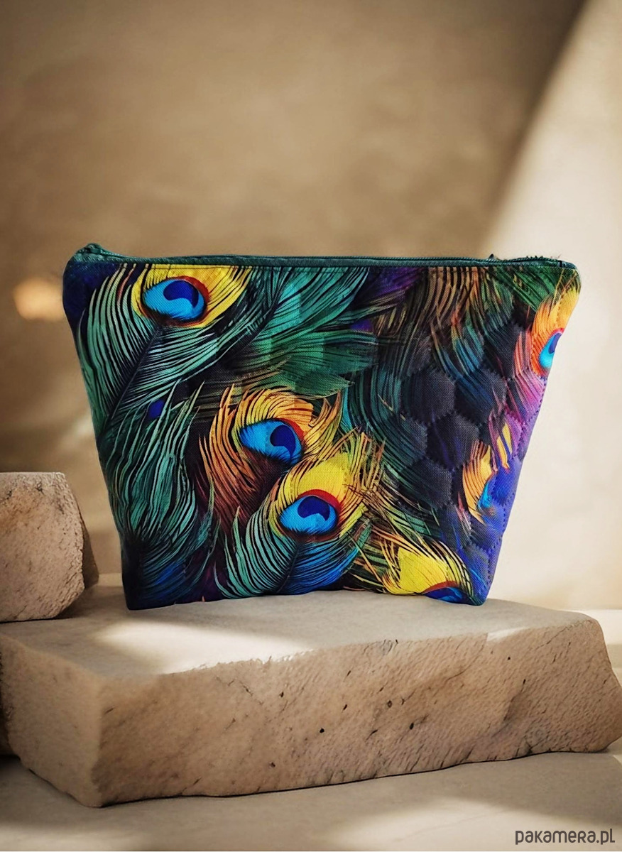 Elegancka i funkcjonalna duża kosmetyczka z serii Ofelia, zdobiona pięknym wzorem pawich piór. Wykonana z pikowanego wodoodpornego materiału, zapewnia ochronę Twoim kosmetykom przed wilgocią. Wewnątrz znajduje się również wodoodporna podszewka z praktyczną kieszonką idealną na tusze czy szminki. Ta kosmetyczka to nie tylko stylowy dodatek, ale także doskonały pomysł na prezent.