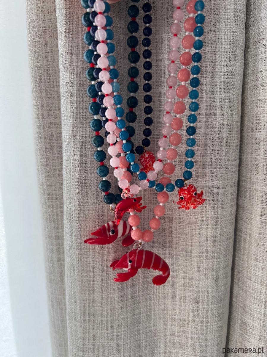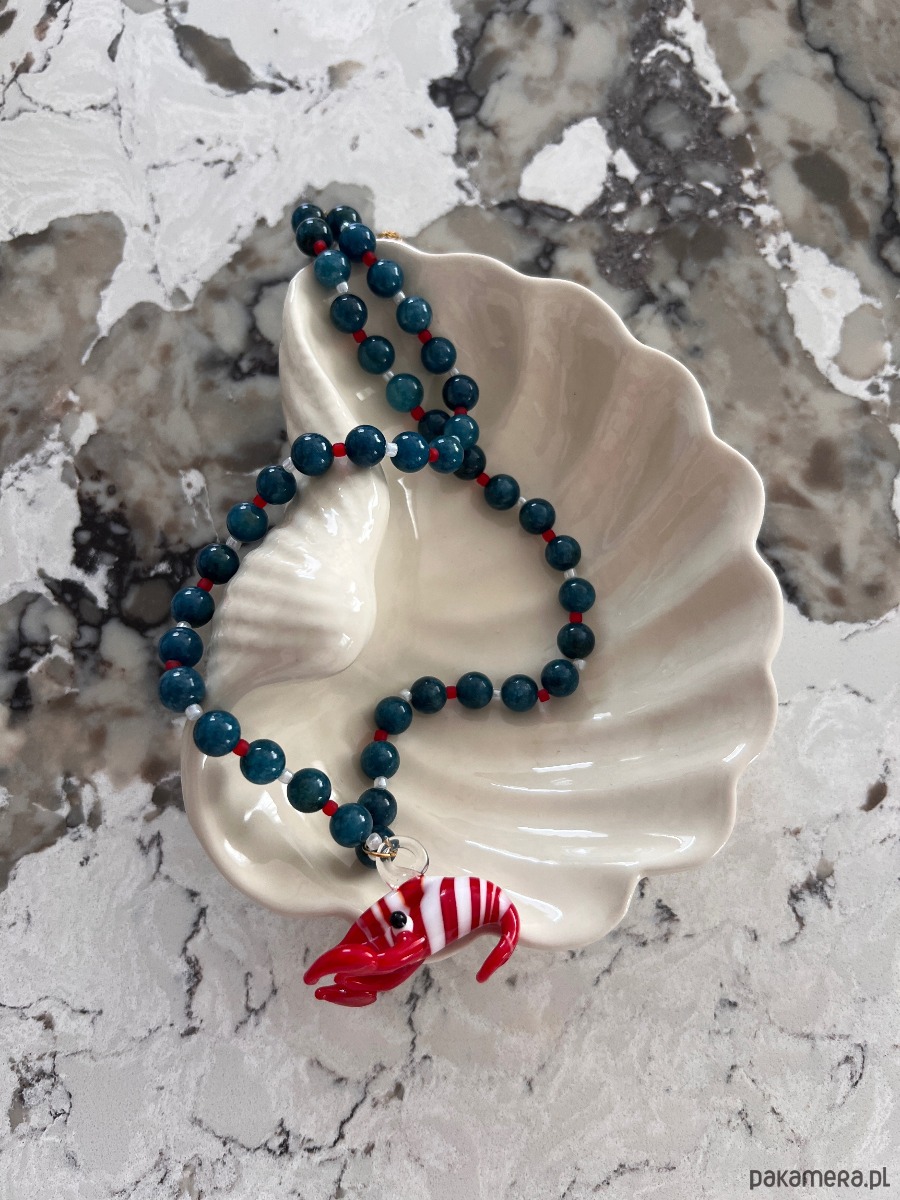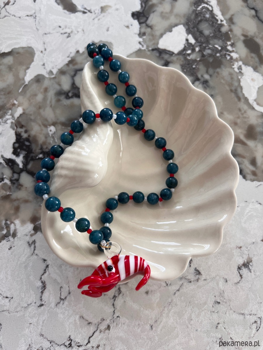 Ręcznie robiony naszyjnik ze szklaną krewetką oraz niebieskich kamieni agatu, przeplatanego japońskimi koralikami toho.