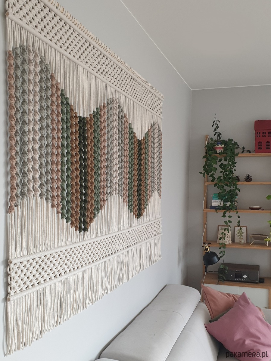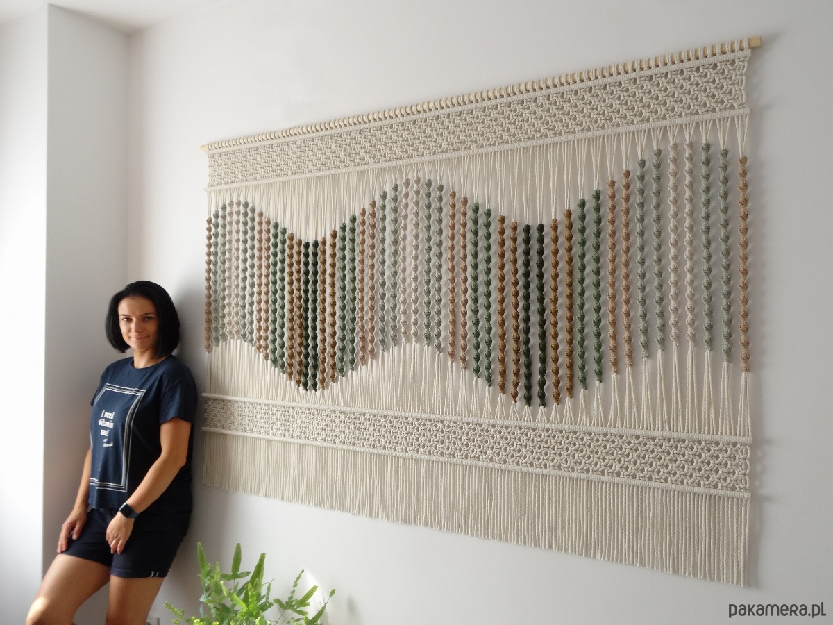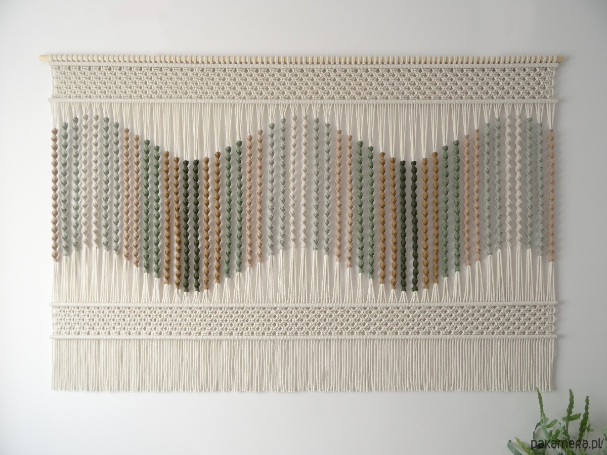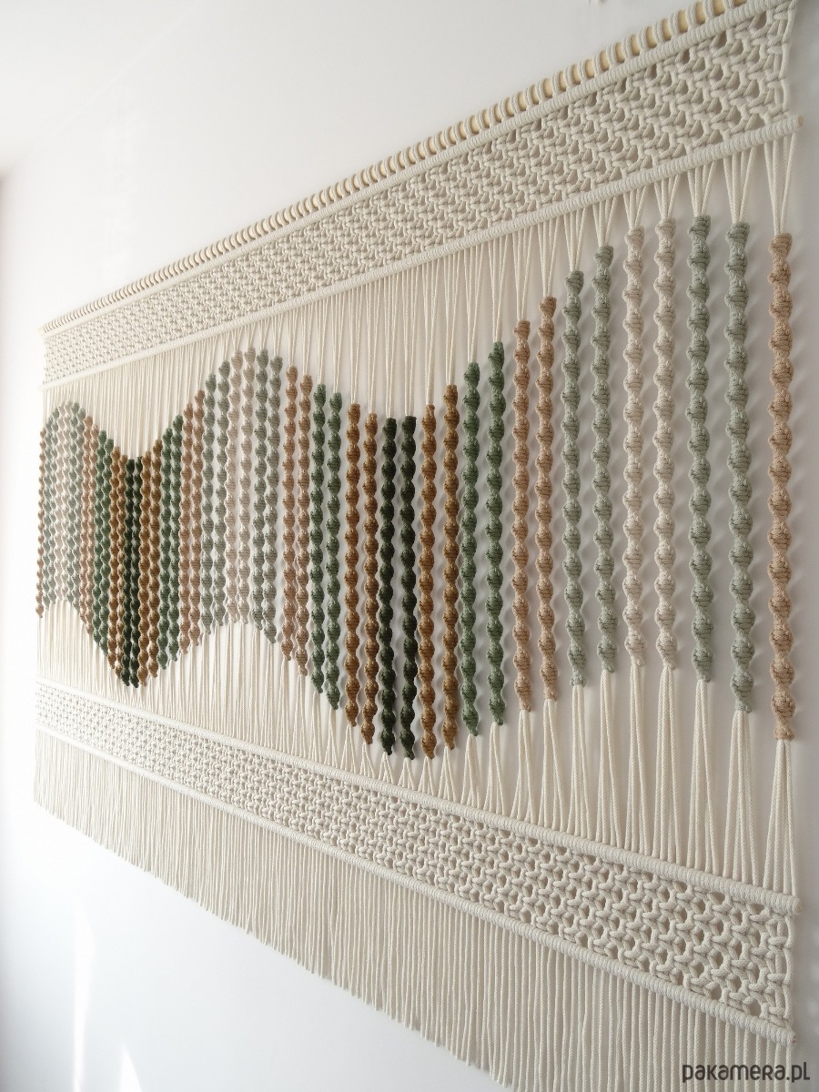 Imponująca makrama na ścianę z kolekcji "Seaside Dunes" w subtelnych odcieniach zieleni i beżu to unikalna dekoracja ścienna, która wprowadzi do Twojego wnętrza nutę natury i harmonii. Misternie pleciony wzór, inspirowany nadmorskim krajobrazem, przyciąga wzrok doskonale dobraną paletą barw, tworząc przytulną i elegancką atmosferę. Każdy detal został wykonany z najwyższą starannością, dzięki czemu ta unikalna dekoracja stanie się centralnym punktem każdej aranżacji, nadając jej niepowtarzalny charakter.