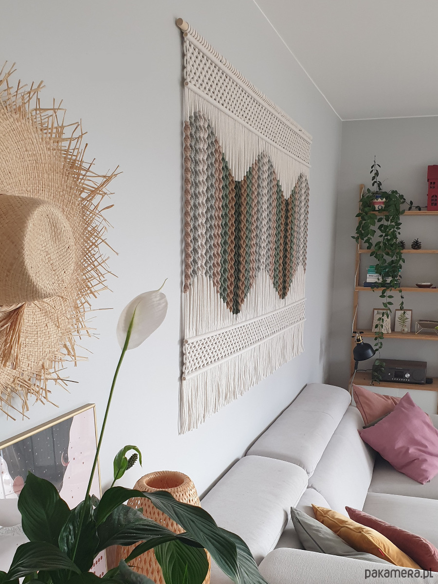 Makrama nie zawiera elementów do zawieszenia. Rekomenduję użycie dwóch solidnych uchwytów, dostosowanych do ciężkich przedmiotów, takich jak kołki rozporowe z hakiem.