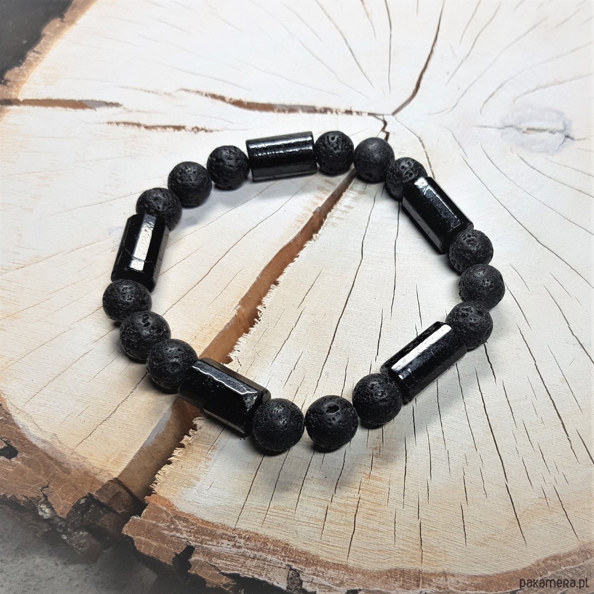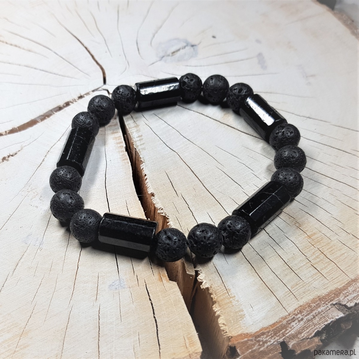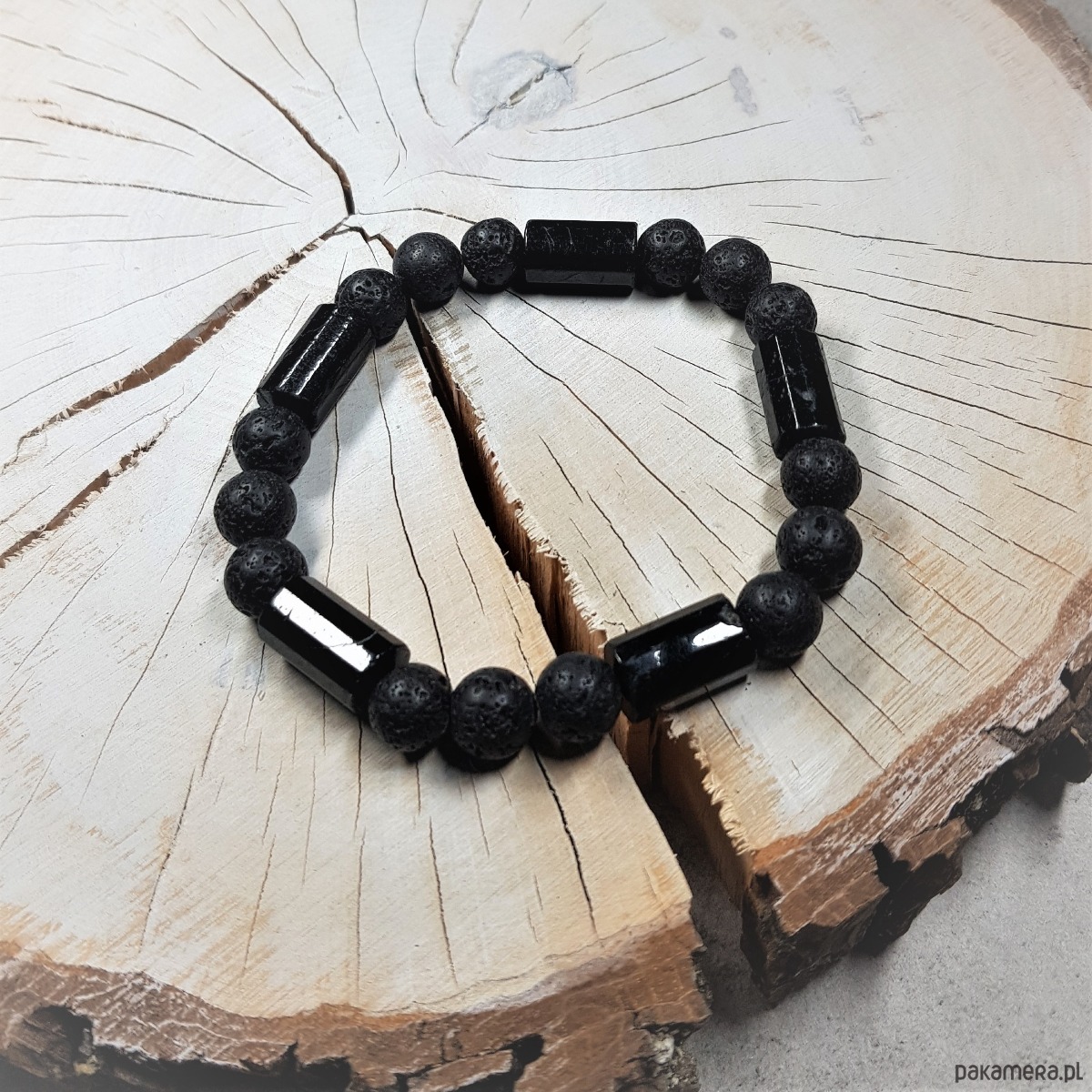 Bransoletka mocy dla mężczyzny wykonana z naturalnych kamieni – dużych wałków turmalinu (średnica 10mm, długość 17mm) oraz lawy wulkanicznej o średnicy 10mm. Kamienie nawleczone są na podwójną mocną gumkę, co jest bardzo komfortowe przy zakładaniu.