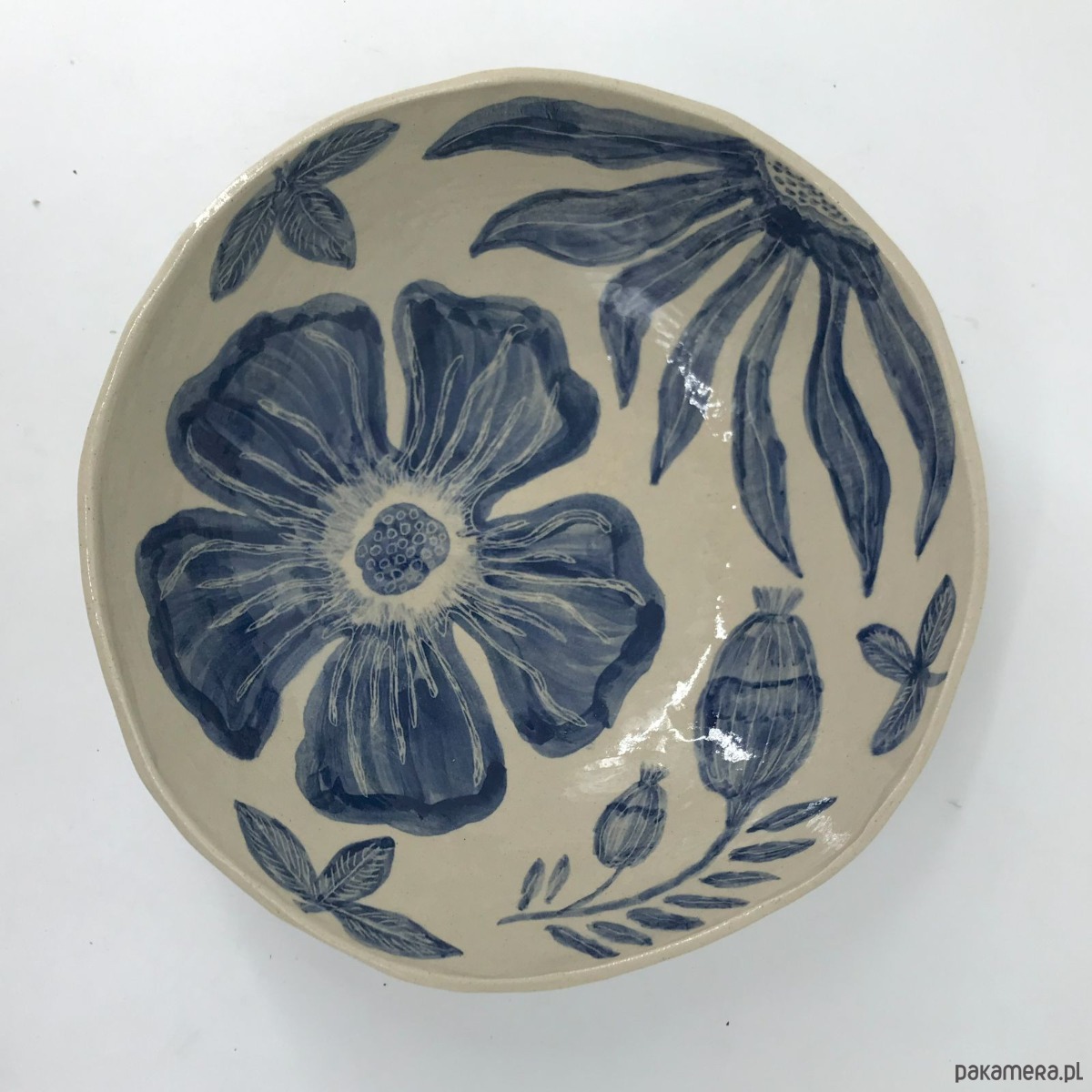 Kolorystyka: naturalna jasna glina z kobaltowym rysunkiem, szkliwo transparentne