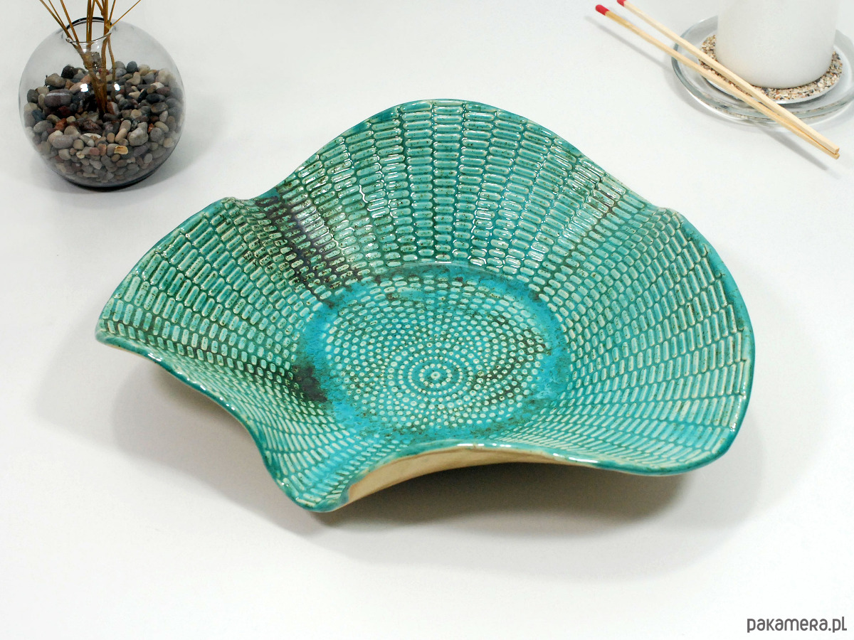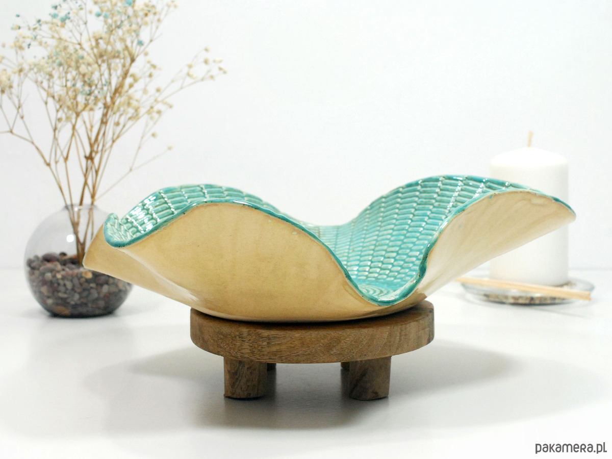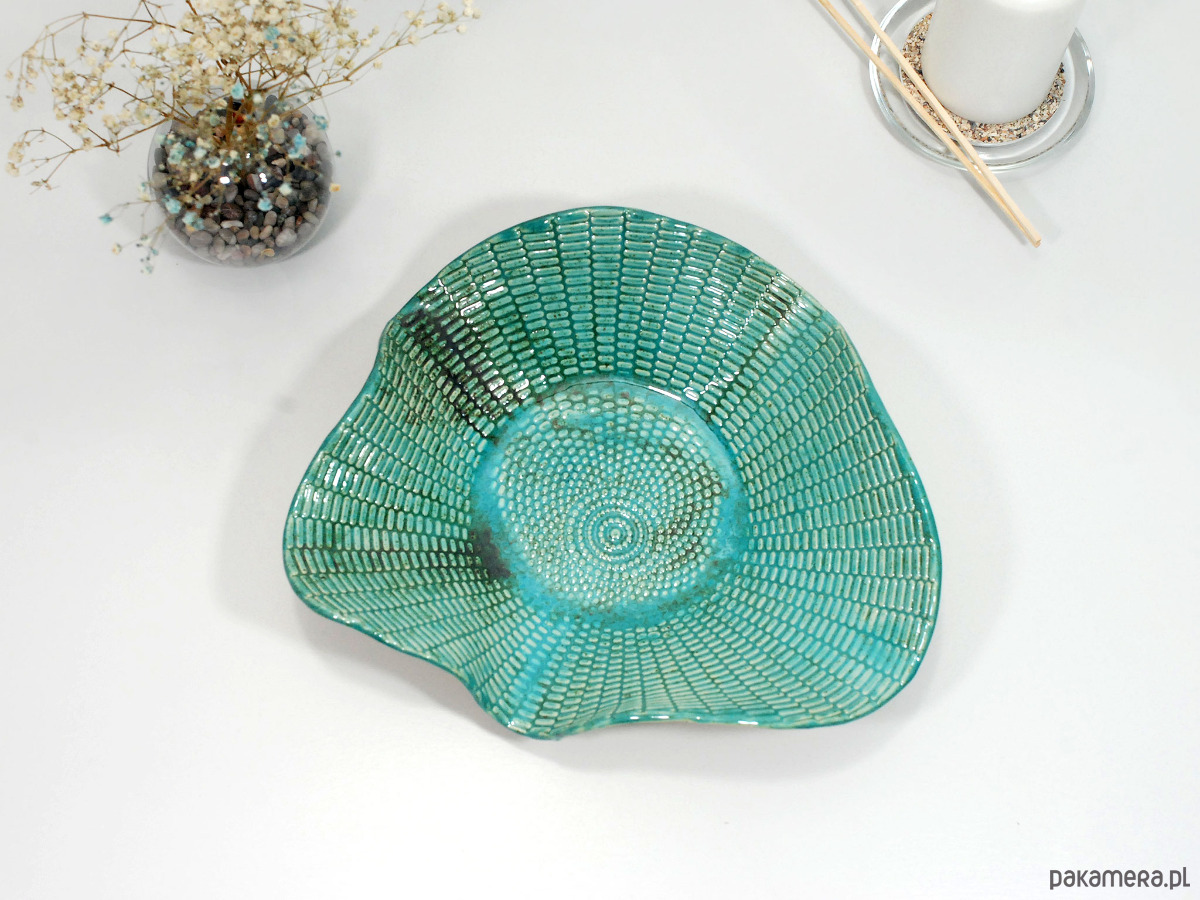 Ta dekoracyjna misa z ceramiki zachwyca unikalnym kształtem i ręcznie formowaną fakturą, która pięknie odbija światło. Ceramiczna misa - patera wykonana i malowana ręcznie, sprawdzi się zarówno jako ozdoba stołu czy półki, jak i praktyczna misa do serwowania owoców czy potraw. Jej turkusowe szkliwo i piękna abstrakcyjna struktura wewnątrz dodadzą charakteru każdemu wnętrzu. Misa to także świetny pomysł na prezent - ślubny, do nowego domu czy jako prezent pod choinkę.