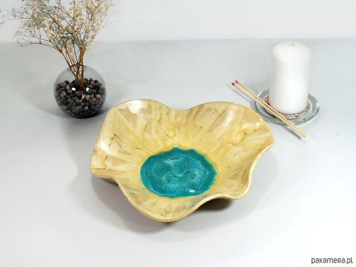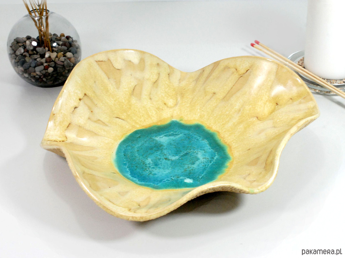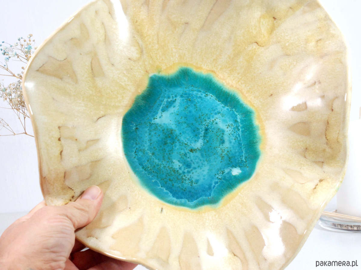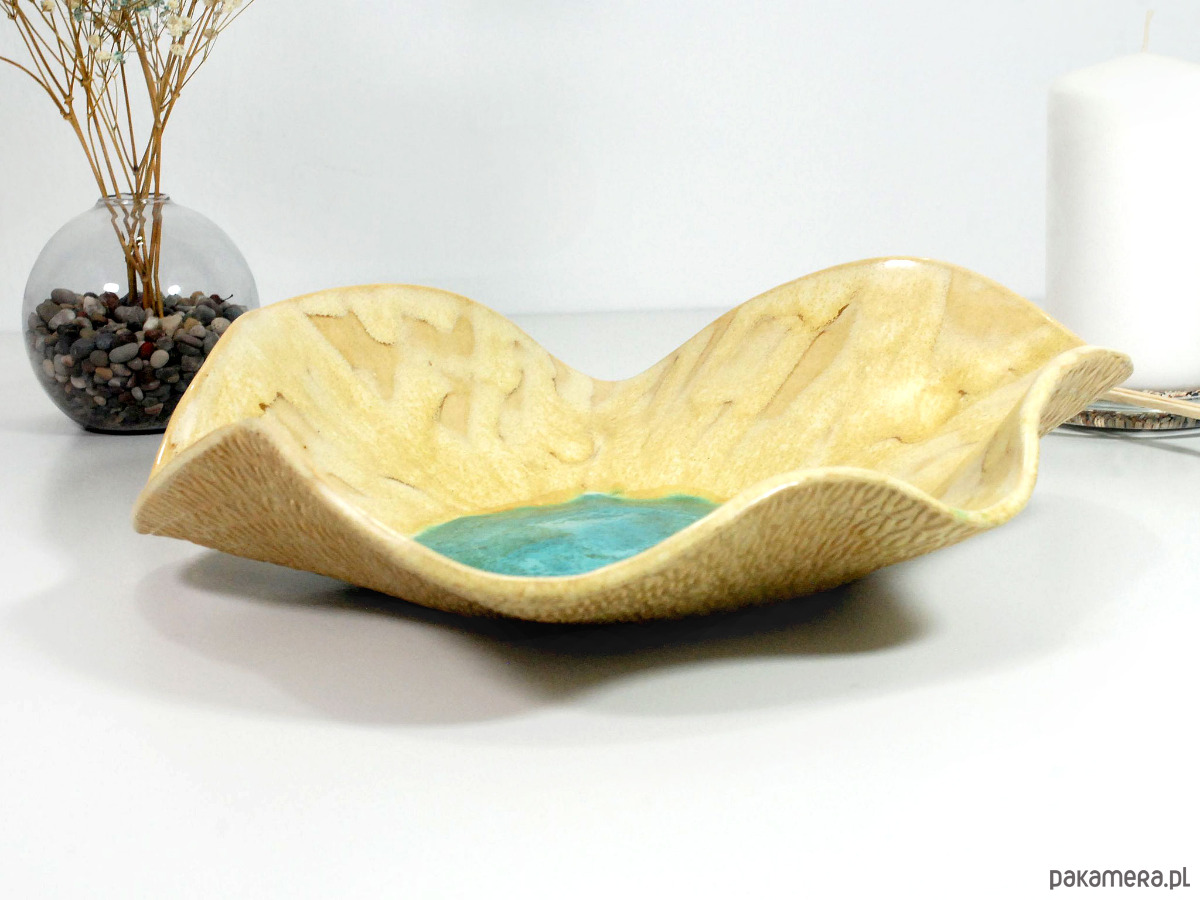 Ta dekoracyjna misa z ceramiki zachwyca unikalnym kształtem i ręcznie formowaną fakturą, która pięknie odbija światło. Ceramiczna misa - patera wykonana i malowana ręcznie, sprawdzi się zarówno jako ozdoba stołu czy półki, jak i praktyczna misa do serwowania owoców czy potraw. Misa to także świetny pomysł na prezent - ślubny, do nowego domu czy jako prezent pod choinkę.
