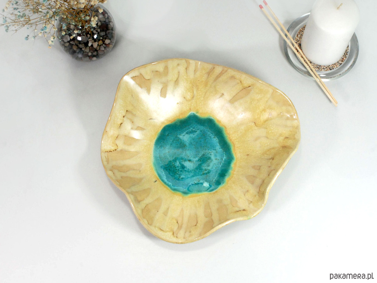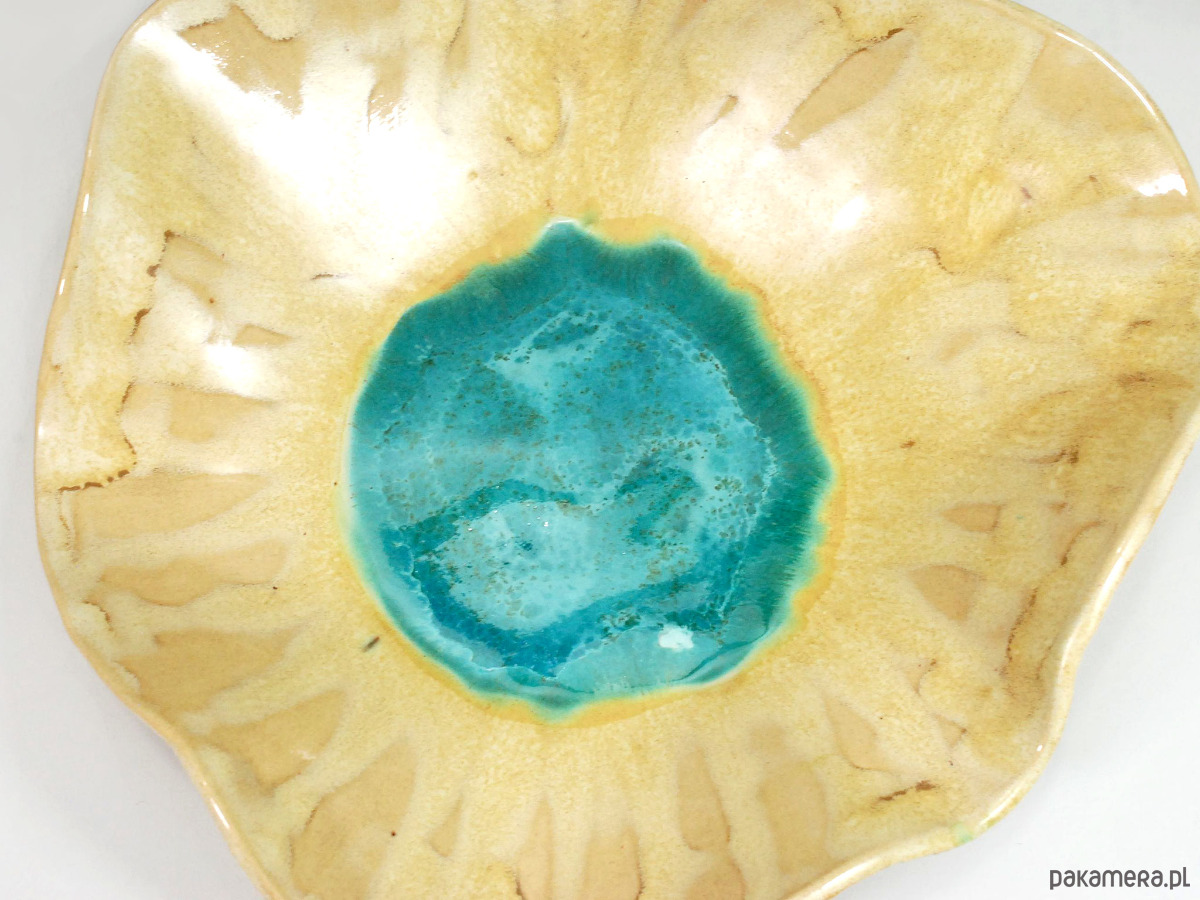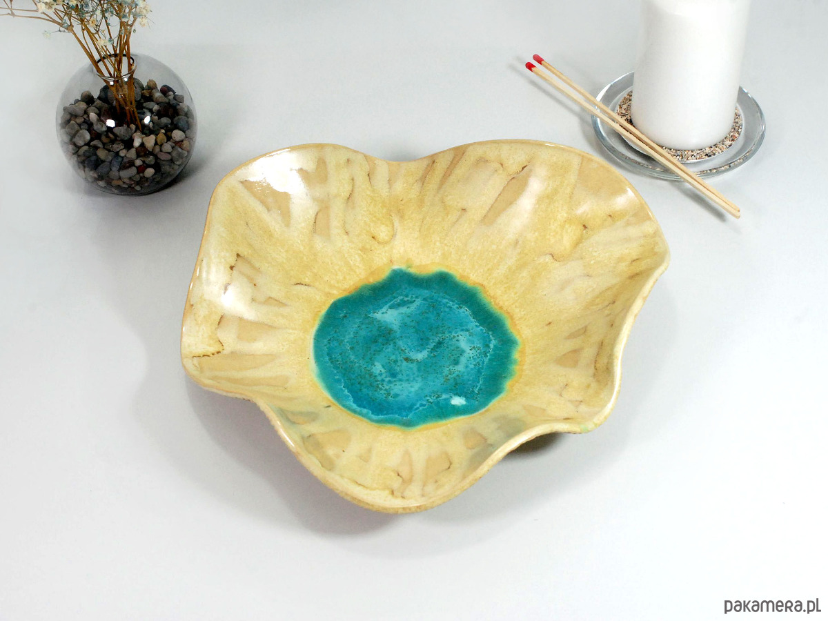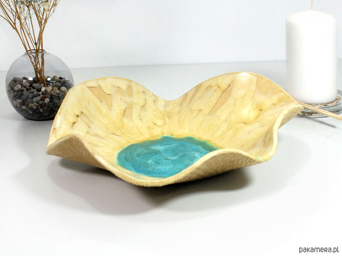 Ta dekoracyjna misa z ceramiki zachwyca unikalnym kształtem i ręcznie formowaną fakturą, która pięknie odbija światło. Ceramiczna misa - patera wykonana i malowana ręcznie, sprawdzi się zarówno jako ozdoba stołu czy półki, jak i praktyczna misa do serwowania owoców czy potraw. Misa to także świetny pomysł na prezent - ślubny, do nowego domu czy jako prezent pod choinkę.