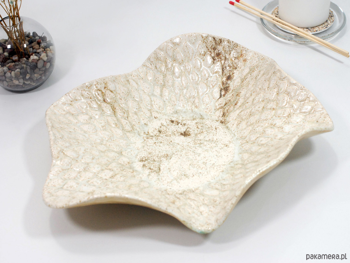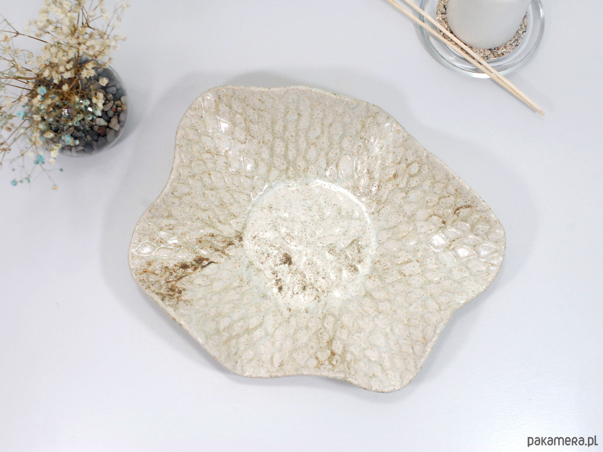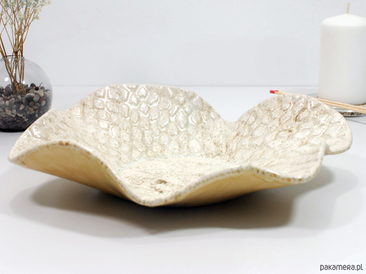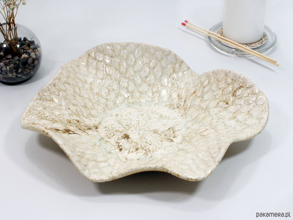 Ręcznie wykonana ceramiczna misa o naturalnym, beżowo-piaskowym wykończeniu i efektownej, nakrapianej fakturze przypominającej liście lub łuski. Jej organiczny kształt i subtelna kolorystyka sprawiają, że świetnie wpisuje się w nowoczesne, skandynawskie i minimalistyczne wnętrza. Możesz wykorzystać ją do serwowania owoców i przekąsek, jako dekorację stołu, a także jako elegancki pojemnik na biżuterię, drobnostki lub kosmetyki w łazience.