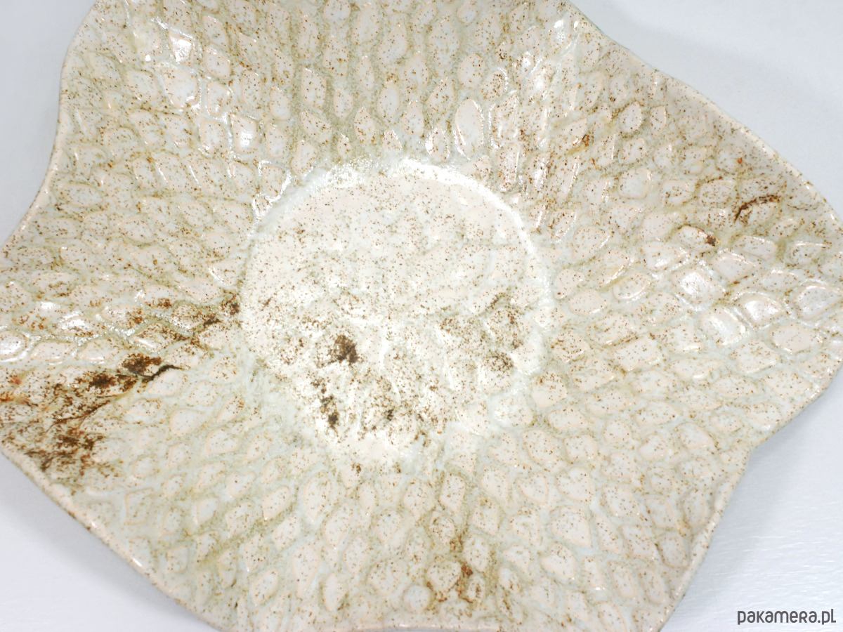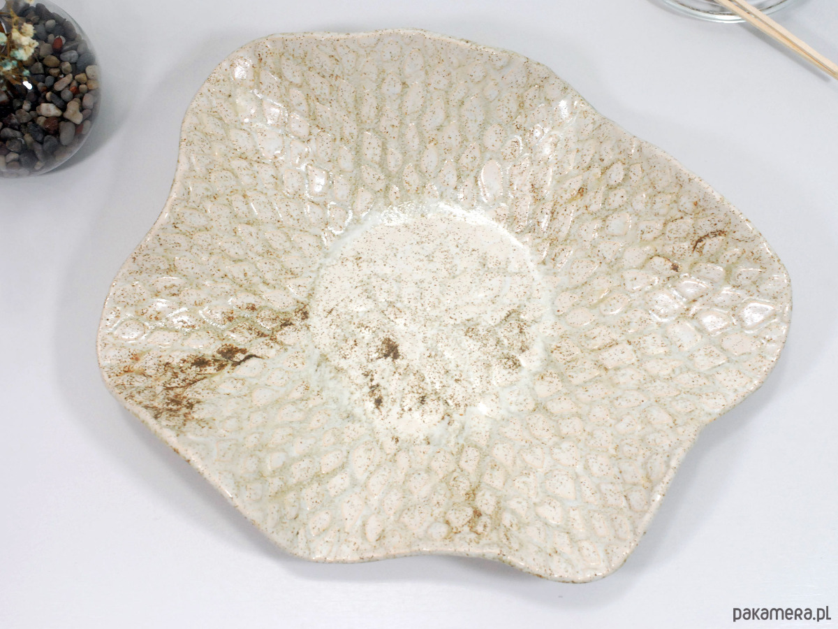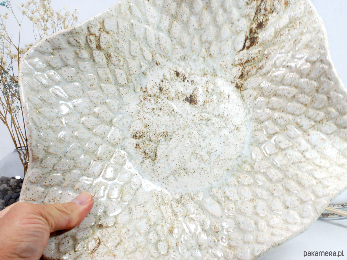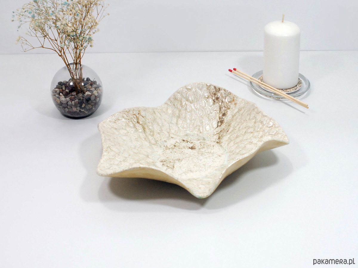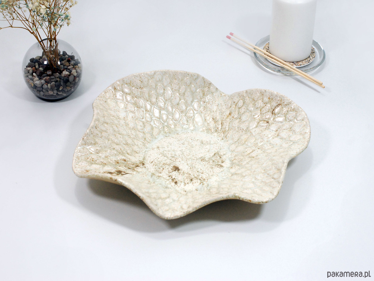 Ręcznie wykonana ceramiczna misa o naturalnym, beżowo-piaskowym wykończeniu i efektownej, nakrapianej fakturze przypominającej liście lub łuski. Jej organiczny kształt i subtelna kolorystyka sprawiają, że świetnie wpisuje się w nowoczesne, skandynawskie i minimalistyczne wnętrza. Możesz wykorzystać ją do serwowania owoców i przekąsek, jako dekorację stołu, a także jako elegancki pojemnik na biżuterię, drobnostki lub kosmetyki w łazience.