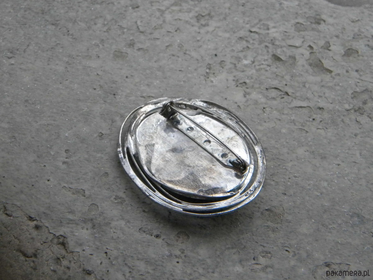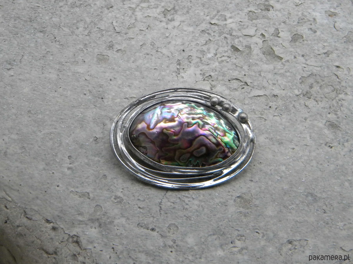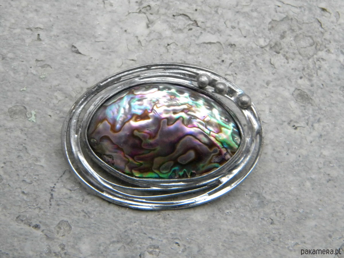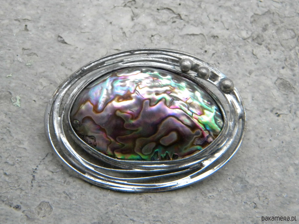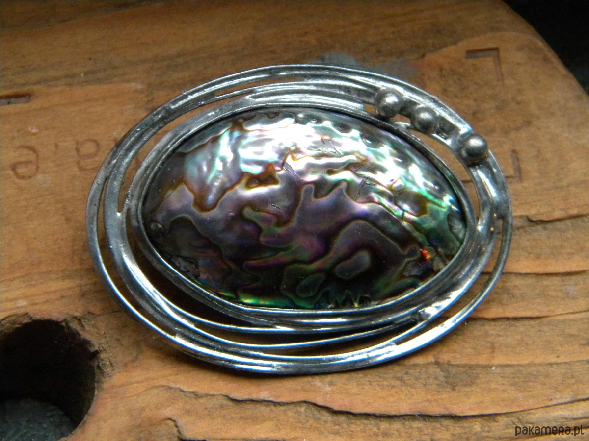 Broszka z muszli paua i granatu w ocynowanej miedzi.