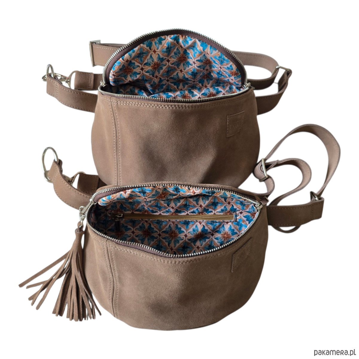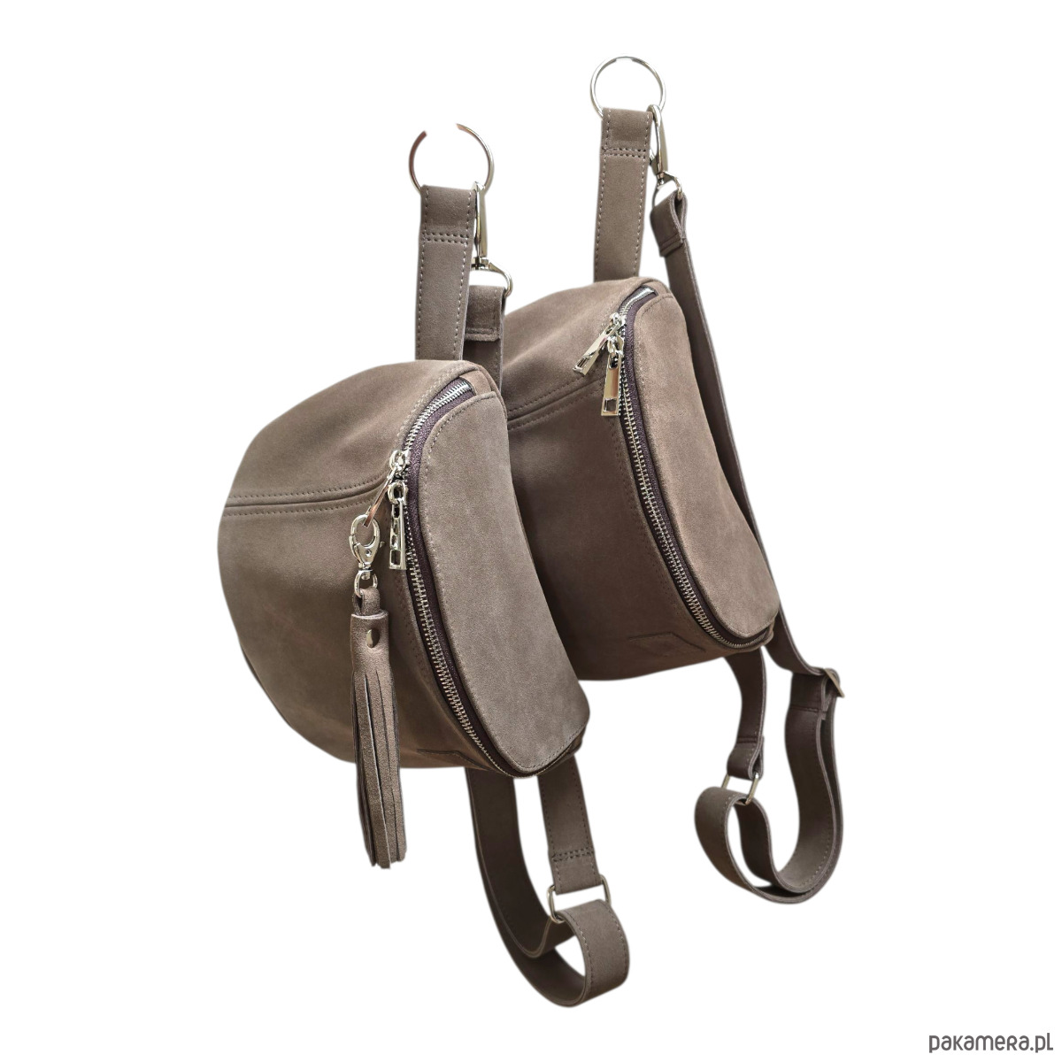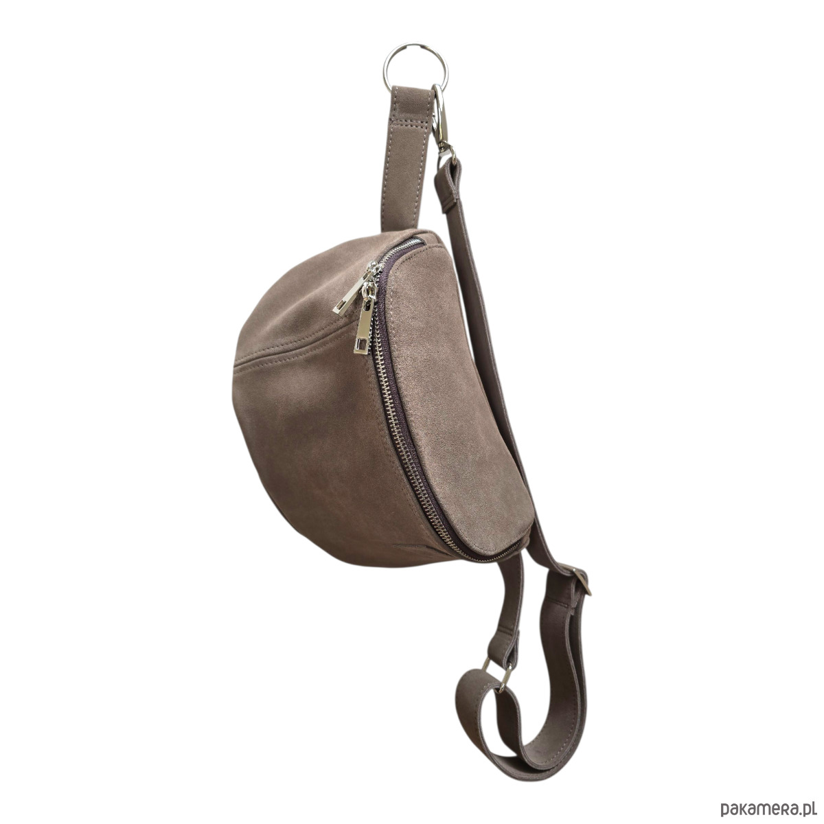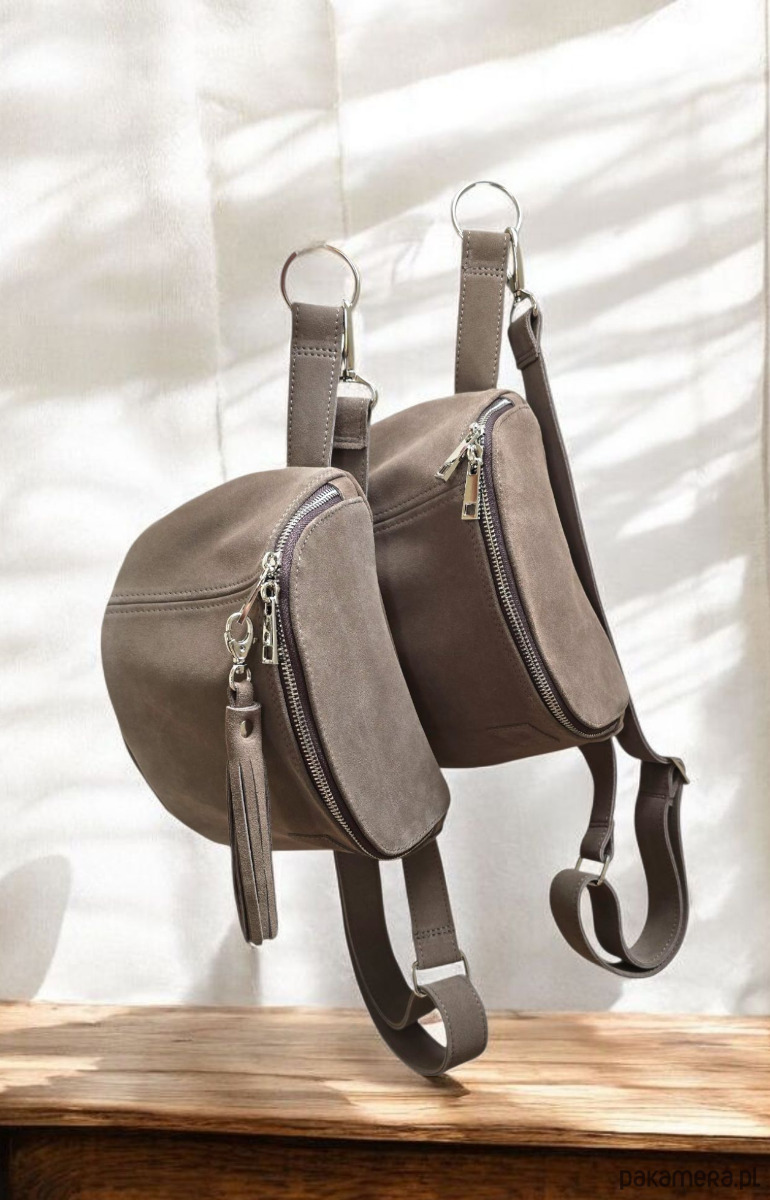 Duża nerka saszetka taupe. Skóra zamszowa z frędzlami