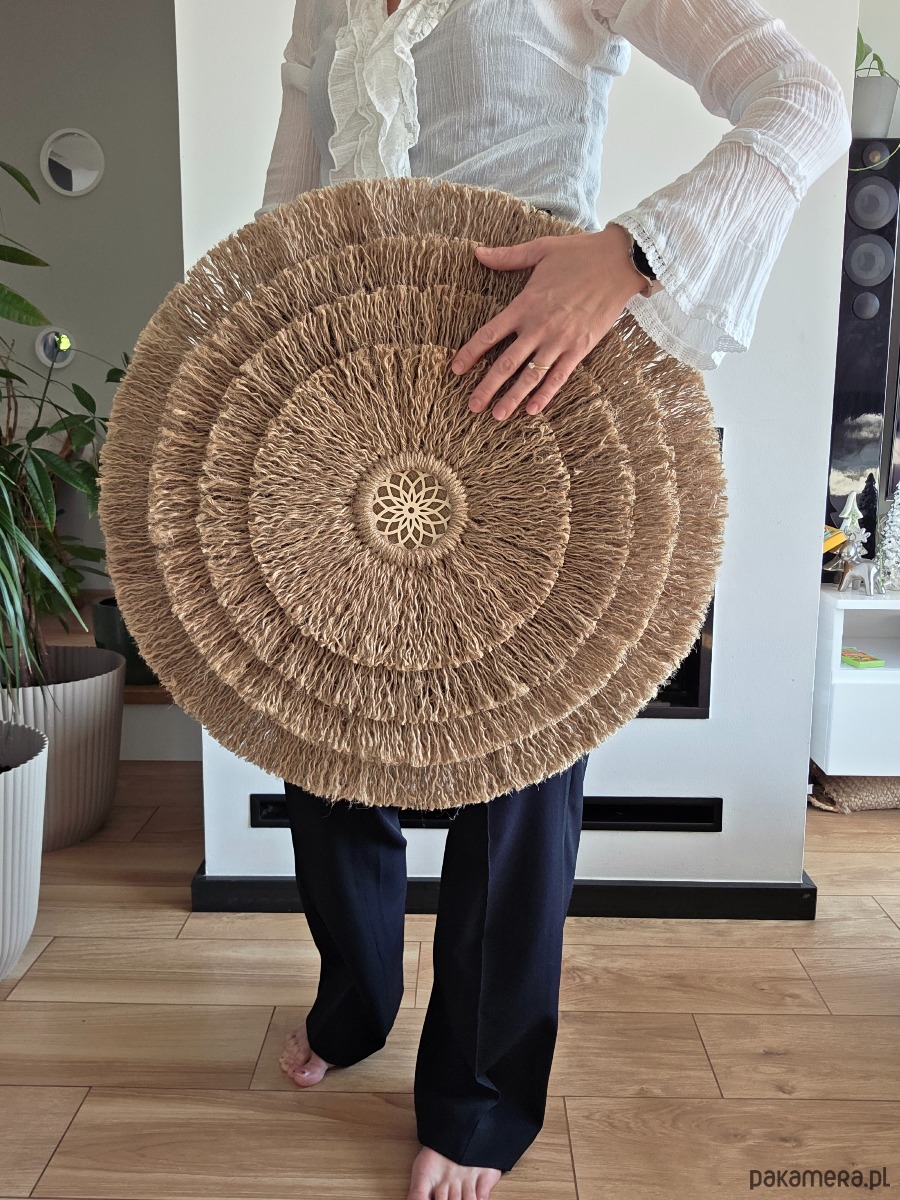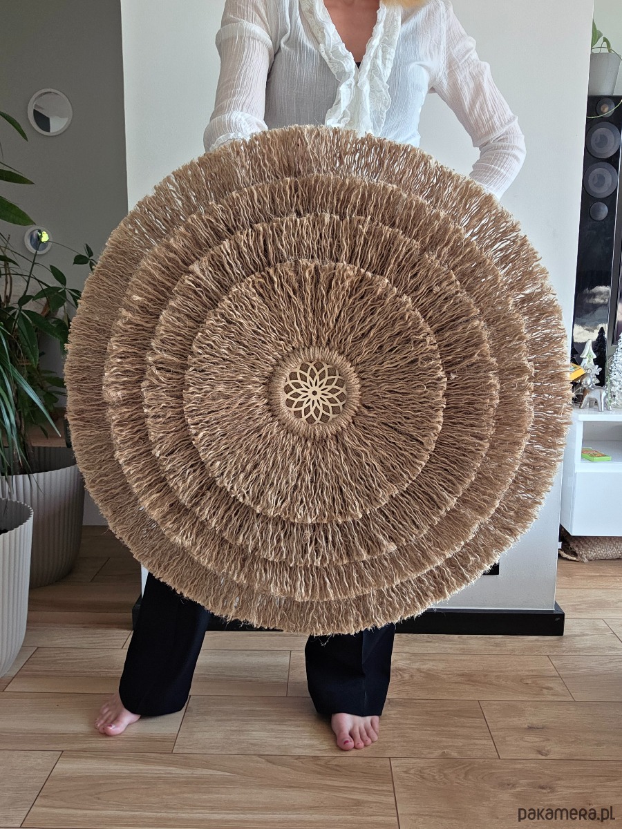 Ręcznie wykonana makrama rozeta, mandala o średnicy prawie 60cm ze sznurka jutowego. To dekoracja, która wnosi do wnętrza spokój, harmonię i bliskość natury. Jej organiczna forma oraz surowa faktura juty pięknie komponują się z wnętrzami w stylu boho, eko, japandi czy skandynawskim.