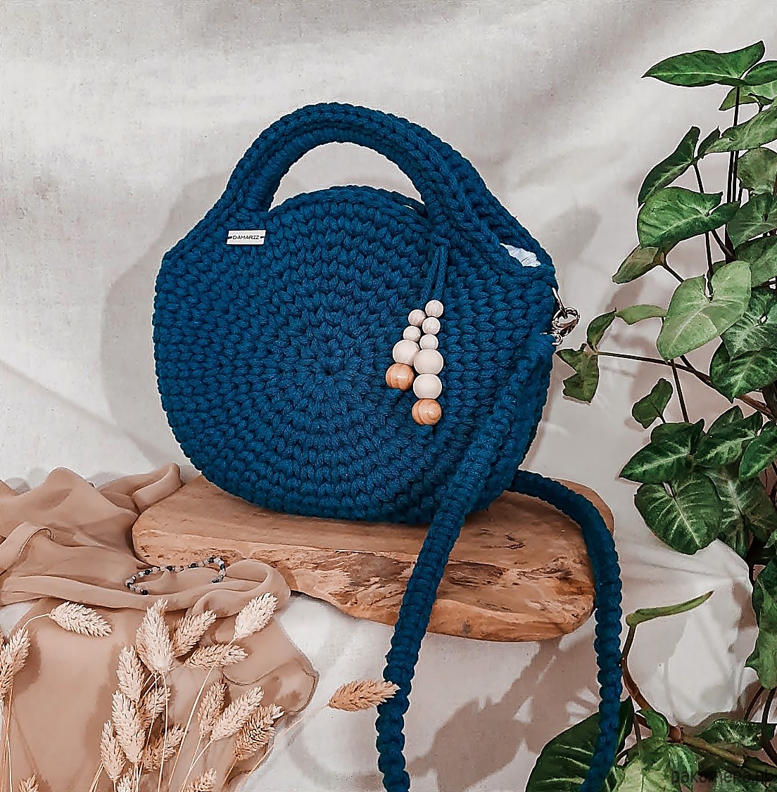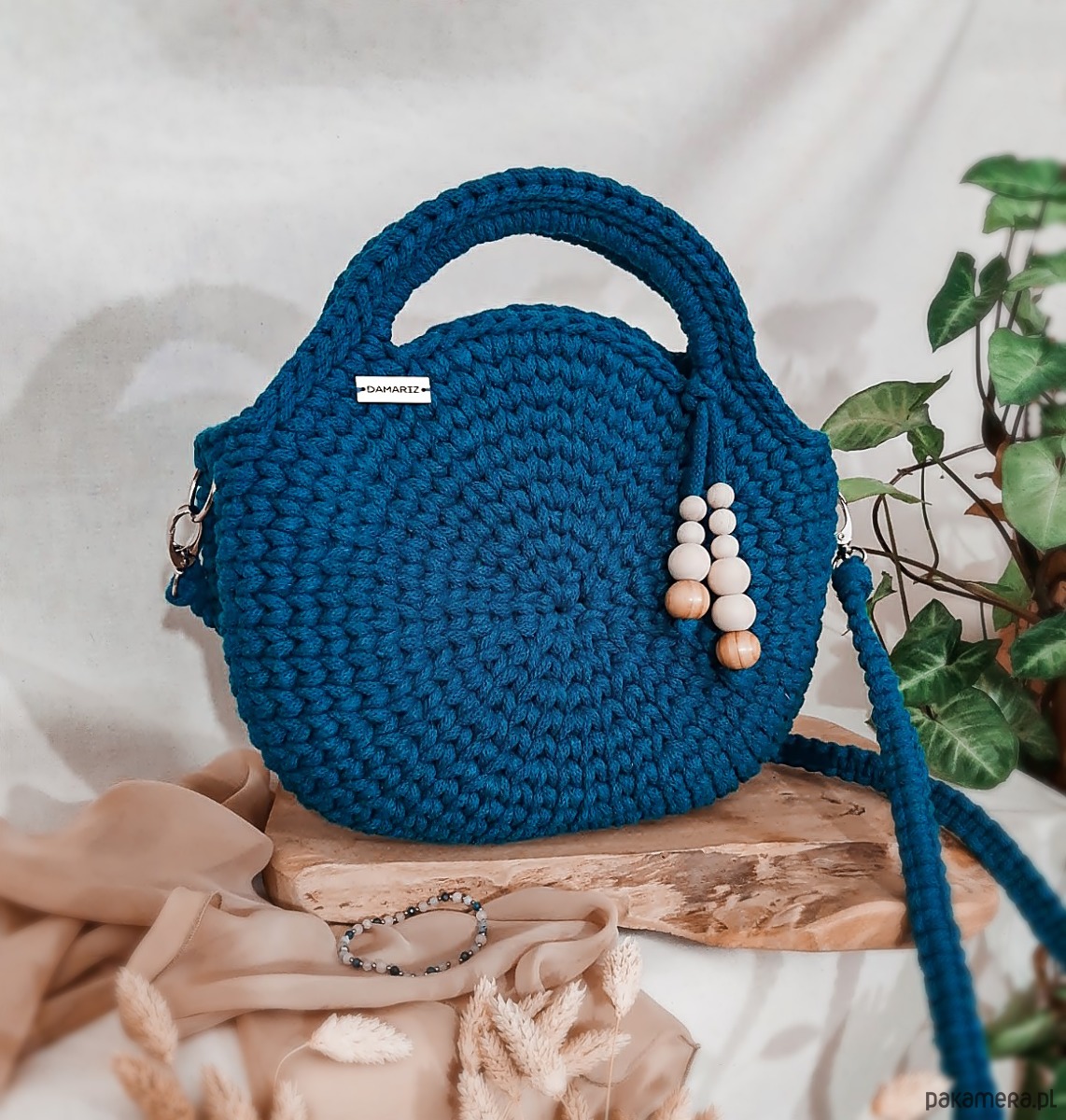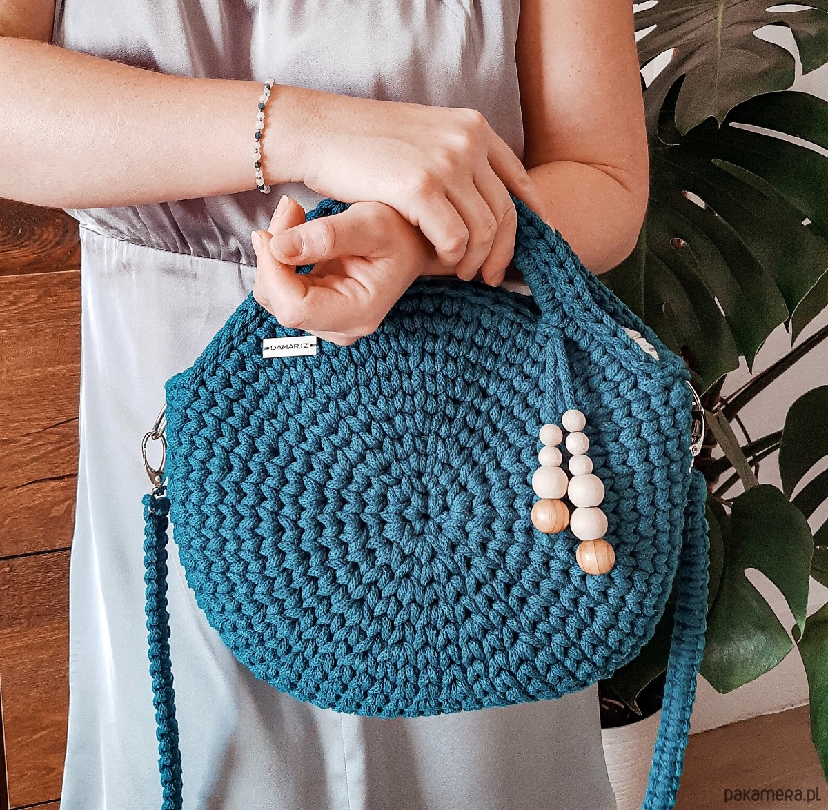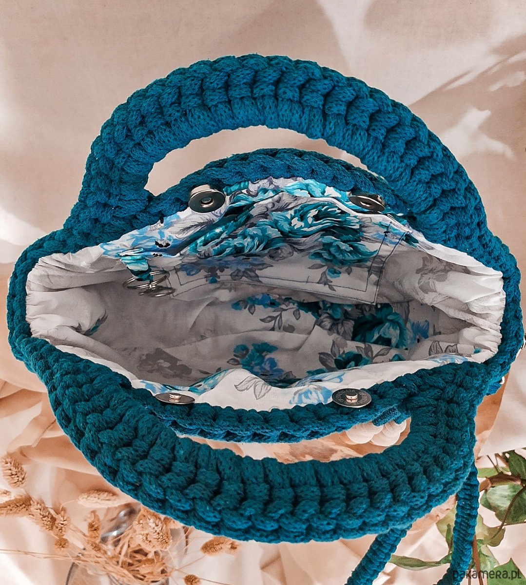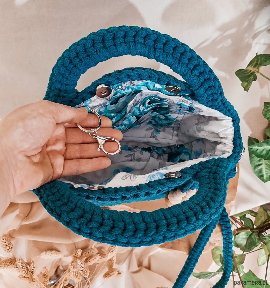 Torebka wykonana jest ręcznie z wysokiej jakości sznurka bawełnianego z rdzeniem przez co świetnie utrzymuje swój kształt. Wewnątrz znajduje się dobrana pod kolor sznurka podszewka z wszytą kieszonką oraz karabińczykiem do przypięcia kluczy - dzięki temu zawsze będziesz wiedzieć gdzie są i obejdzie się bez zbędnego szukania.