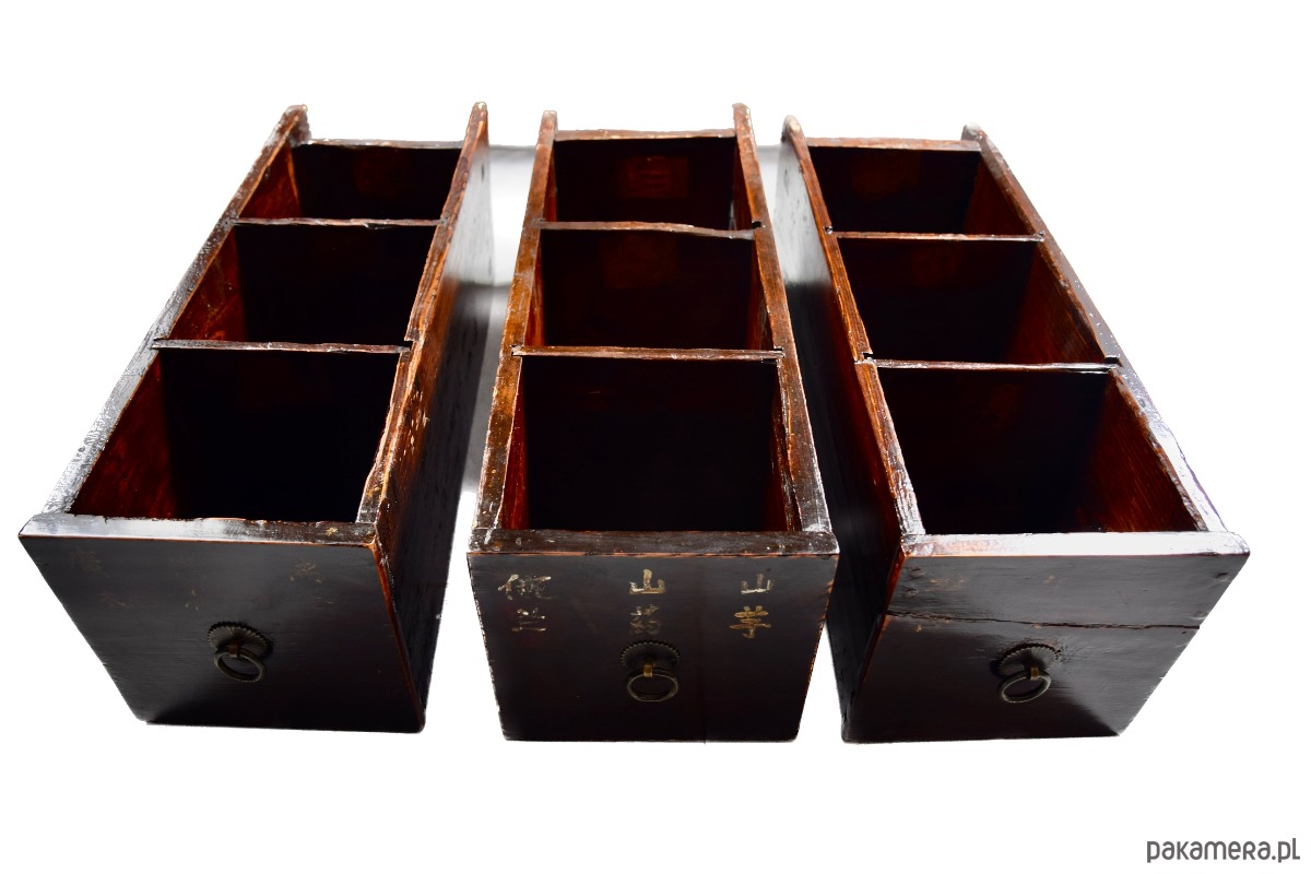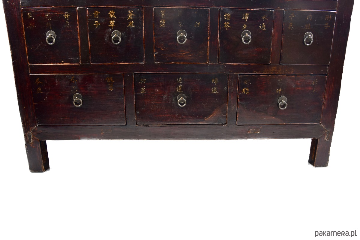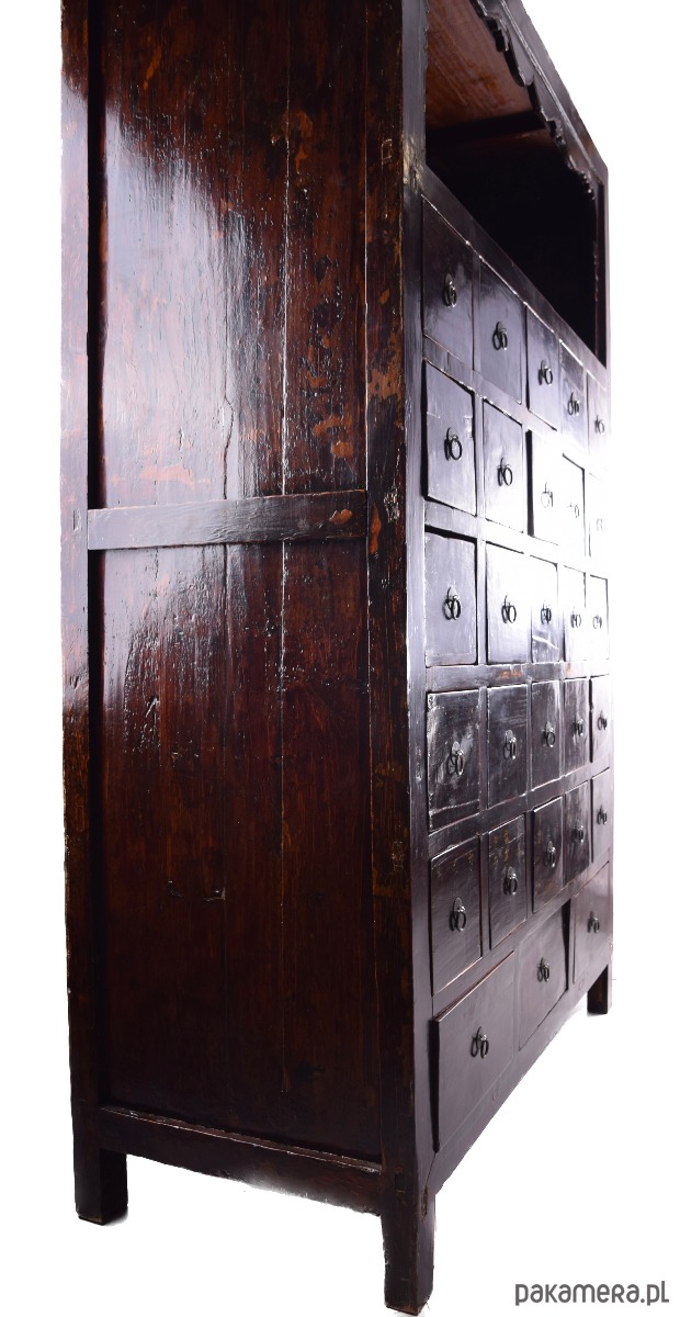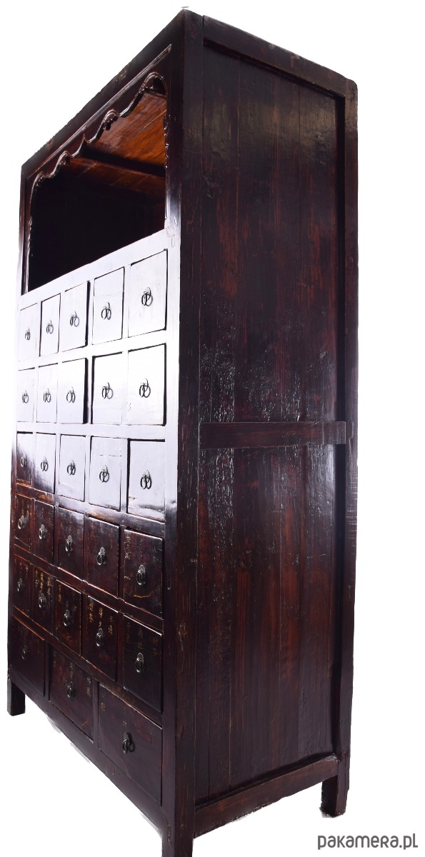 Imponujący, oryginalny apteczny kabinet z przełomu XIX i XX wieku, pochodzący z południowych Chin (region Zhejiang lub Guangdong). Mebel składa się z szeregu solidnych szuflad, każda oznaczona ręcznie malowanymi chińskimi znakami wskazującymi nazwę ziół lub preparatów medycznych. Na dole są trzy większe szuflady. Szuflady mają po trzy przegródki w środku na niektórych wewnętrznych przegródkach zachowane oryginalne napisy. Szufladki wykonane bardzo solidnie. Górna część otwarta, z profilowanym gzymsem o falistej linii, podkreśla dekoracyjny charakter mebla. Ten falisty gzyms świadczy też o oryginalnym pochodzeniu. Wnętrze wykonane ręcznie, z widocznymi czopami i wręgami, typowymi dla rzemiosła stolarskiego z epoki Qing.