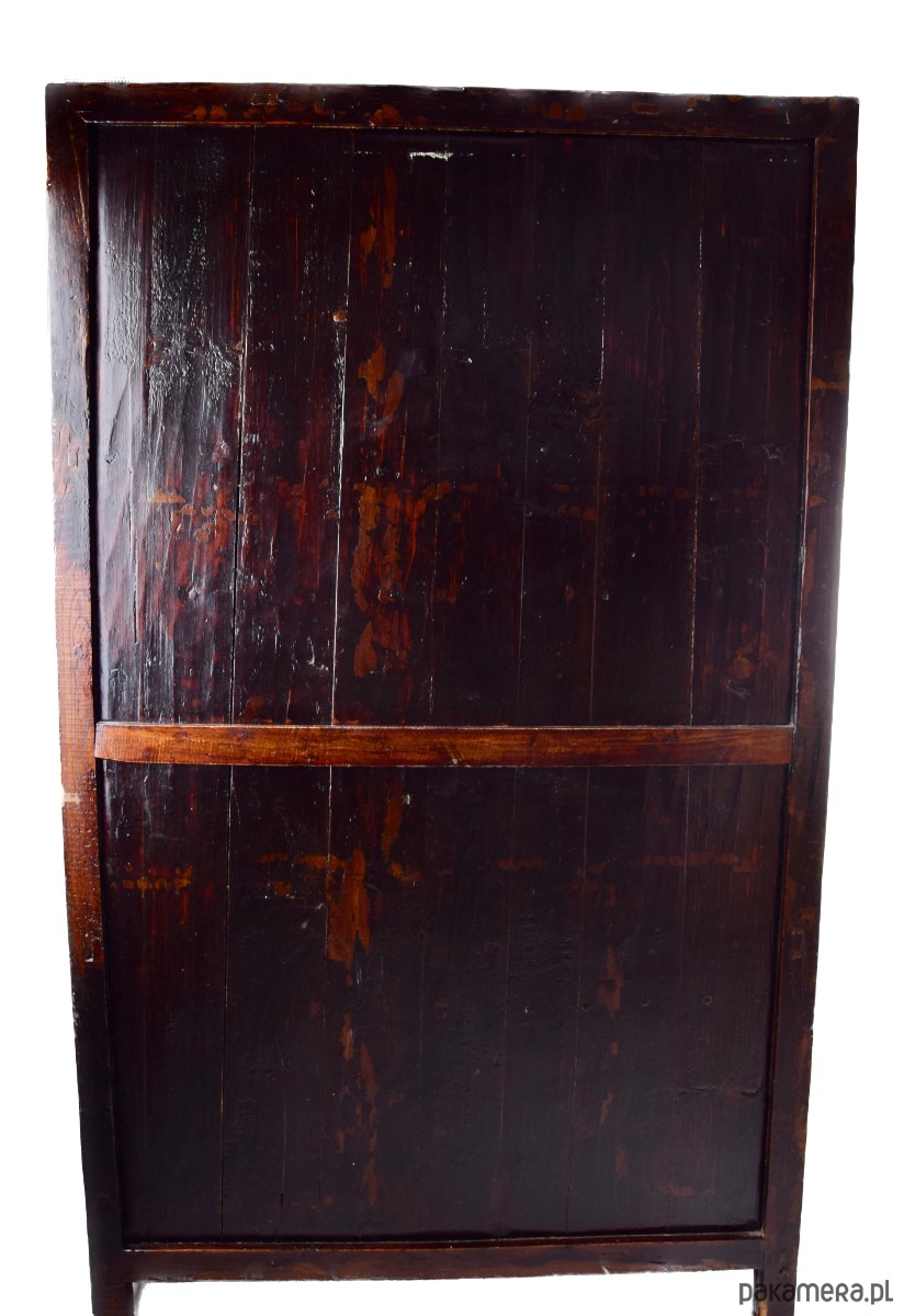 Szafka zachowała oryginalną powierzchnię o głębokim, ciemnym odcieniu, z naturalną patyną i śladami użytkowania, które potwierdzają jej autentyczność. Metalowe uchwyty typu „pierścień” są pierwotne. Mebel o wyjątkowej wartości dekoracyjnej i historycznej – przykład tradycyjnego rzemiosła chińskiego, idealny do wnętrz stylowych , utrzymanych w chińskim stylu jak i loftowych..