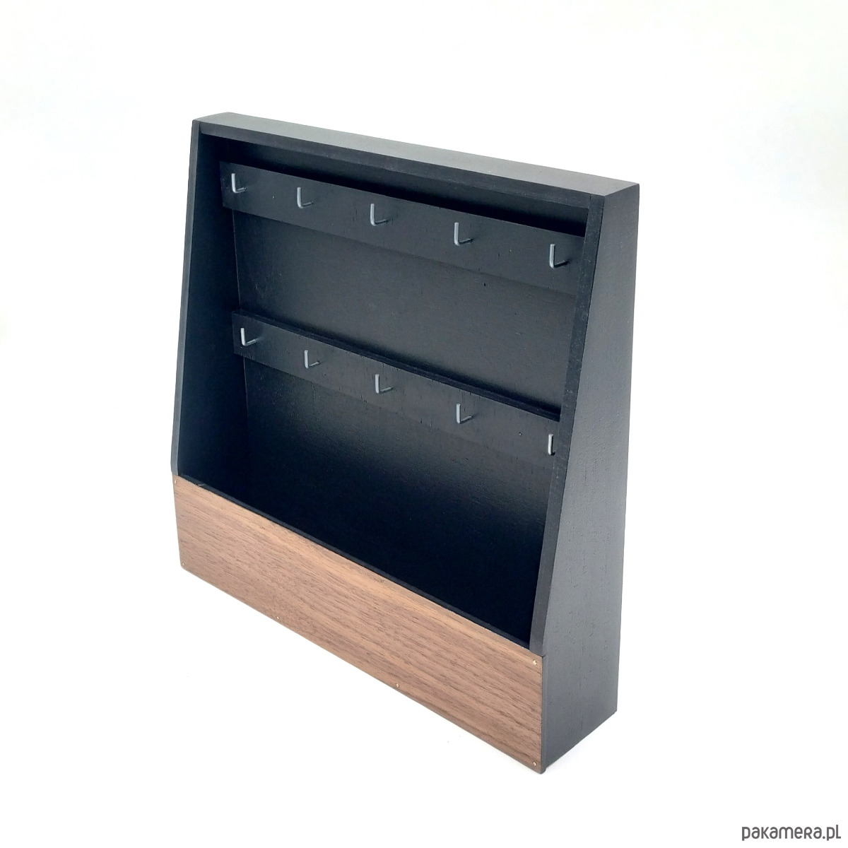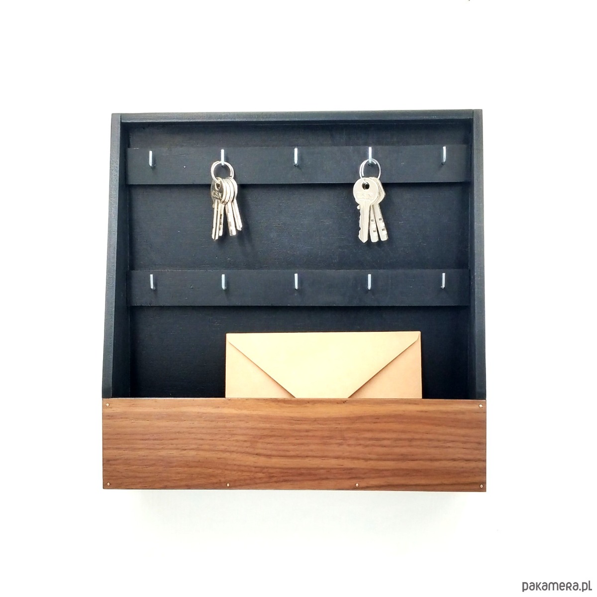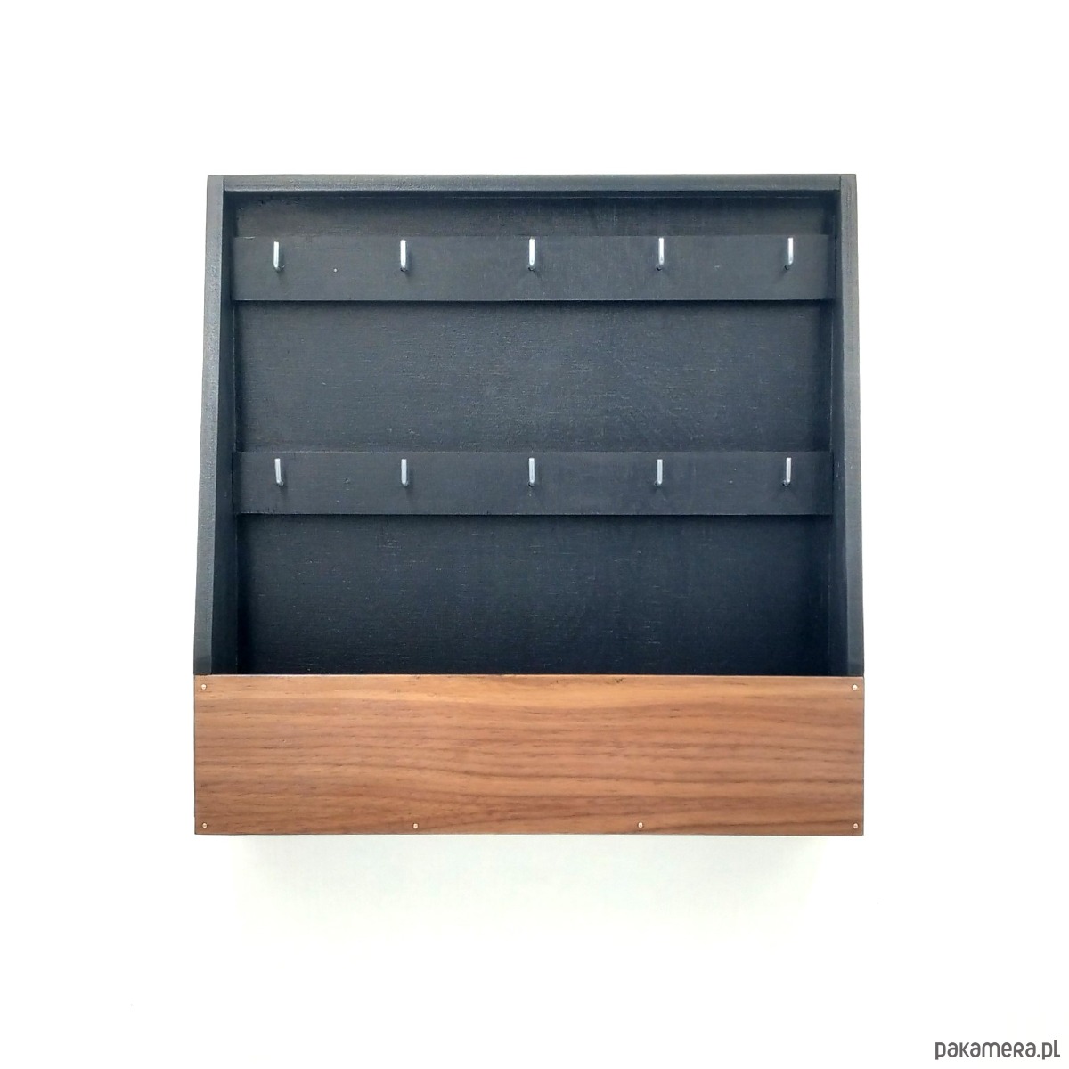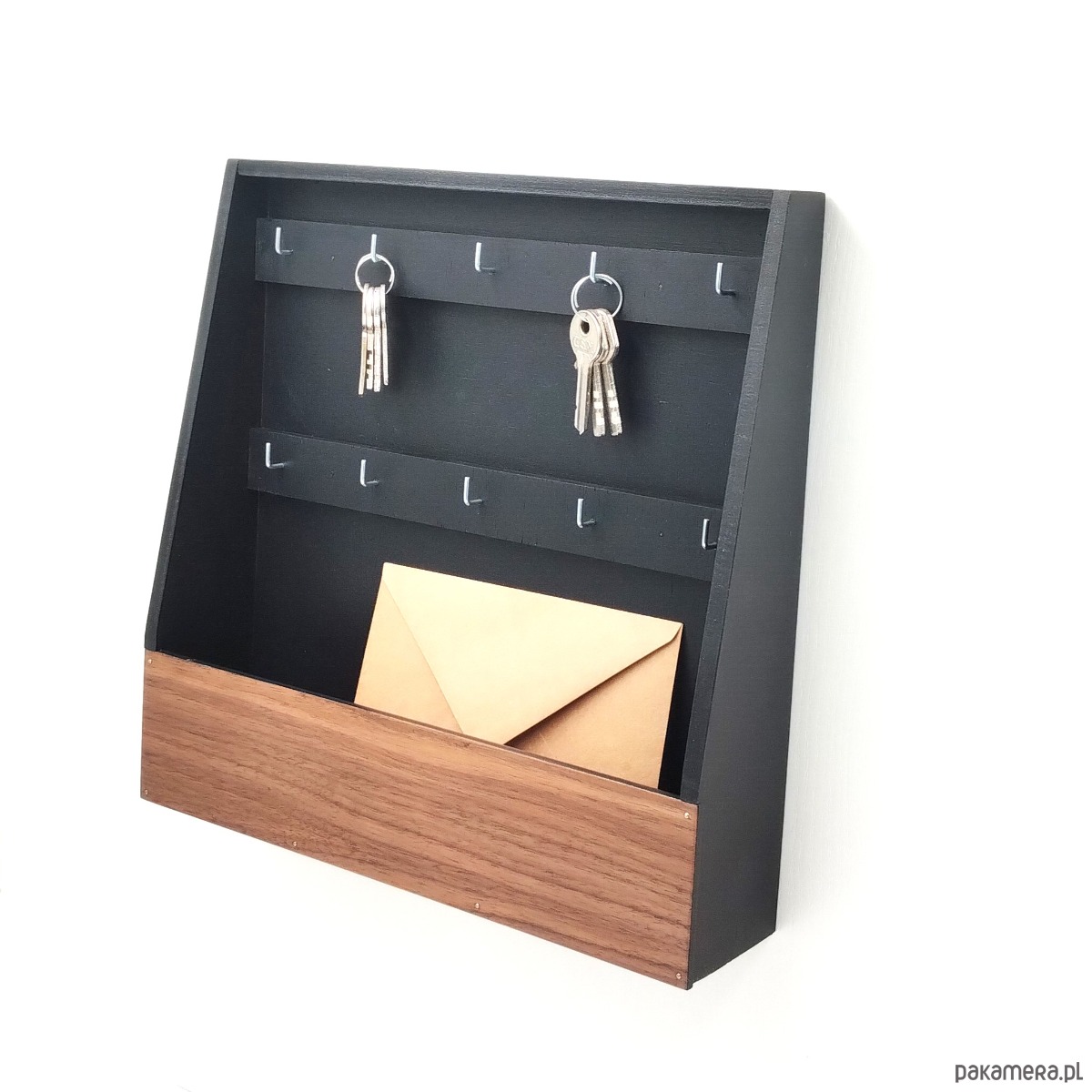 Bardzo prosta, praktyczna skrzynka na klucze. Bez drzwiczek, zawsze otwarta. Wieszanie kluczy jest maksymalnie ułatwione. Po prostu sięgasz i masz klucze. W skrzynce znajdują się 2 rzędy po 5 haczyków. W głębokim schowku możesz trzymać dokumenty, paragony i inne drobiazgi. Skrzynka wykonana ze drewnianej sklejki i pomalowana na czarno z frontem z forniru orzechowego. Idealnie pasuje zarówno do nowoczesnych jak i klasycznych wnętrz, holów, warsztatów, pracowni.