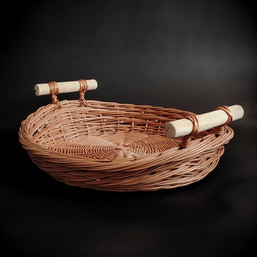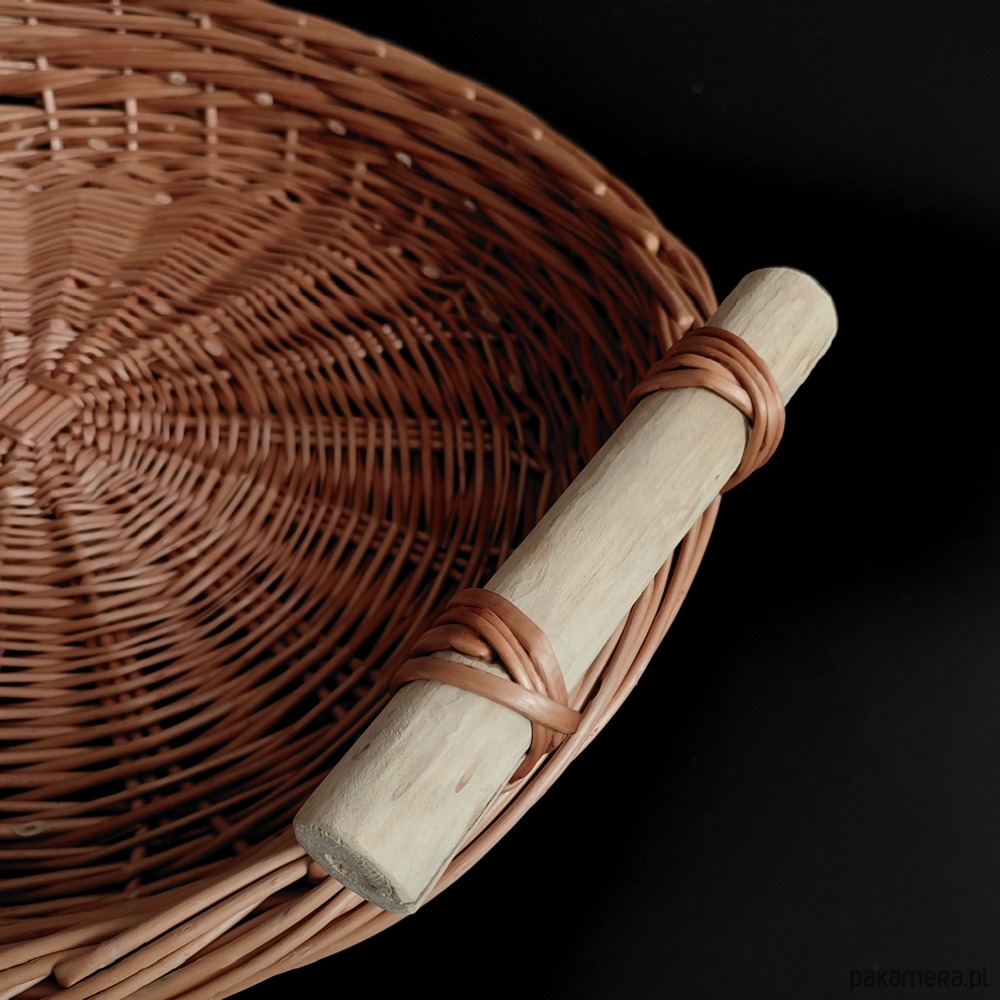 Duża owalna misa. Wypleciona z wikliny korowanej, z drewnianymi uchwytami.