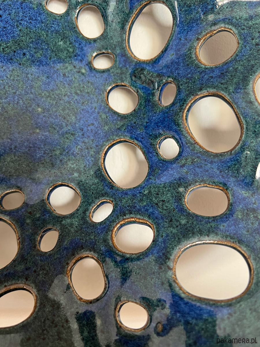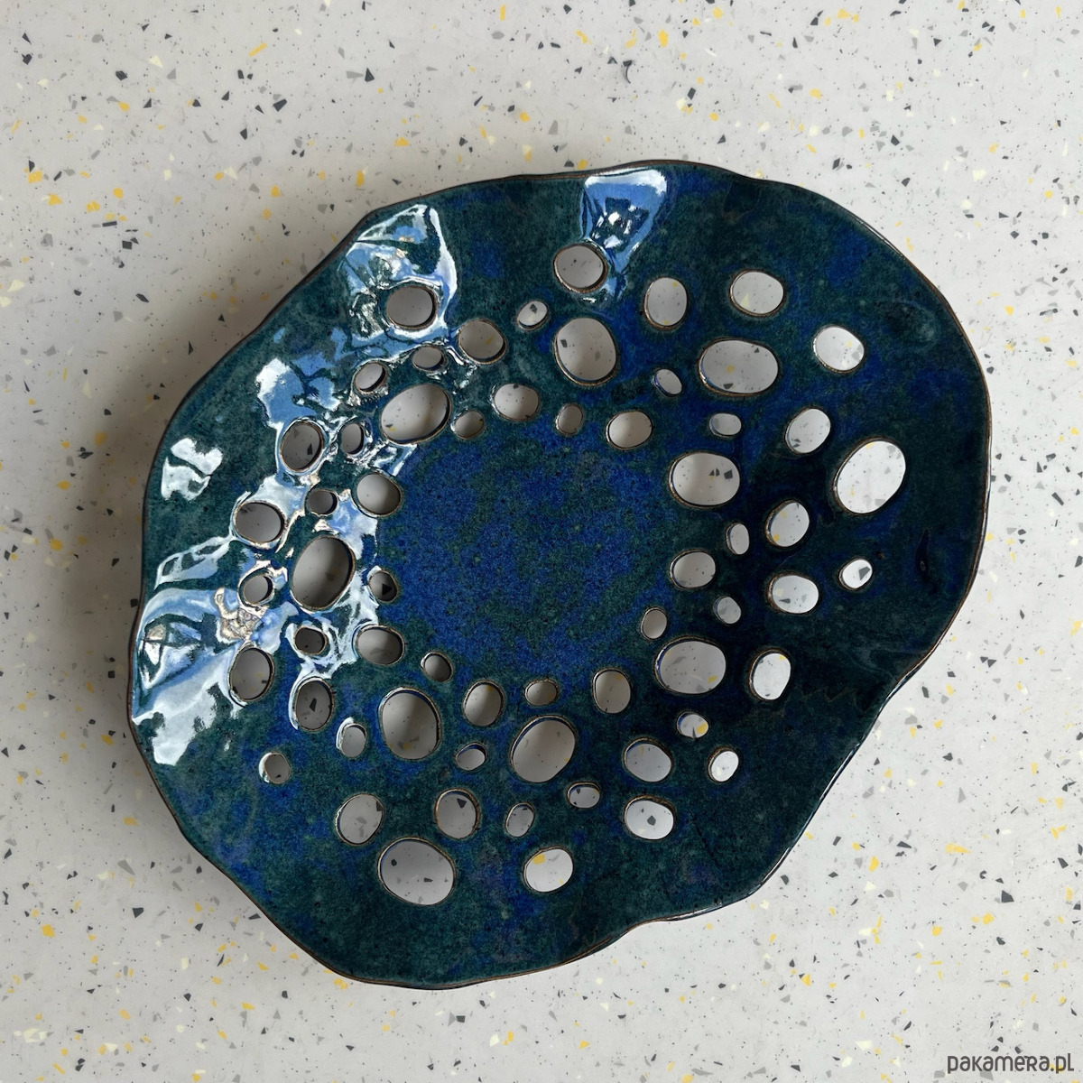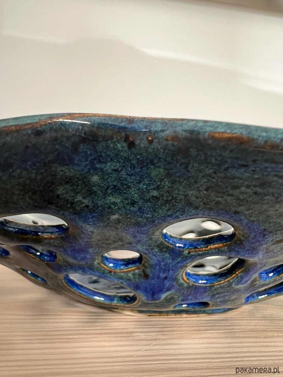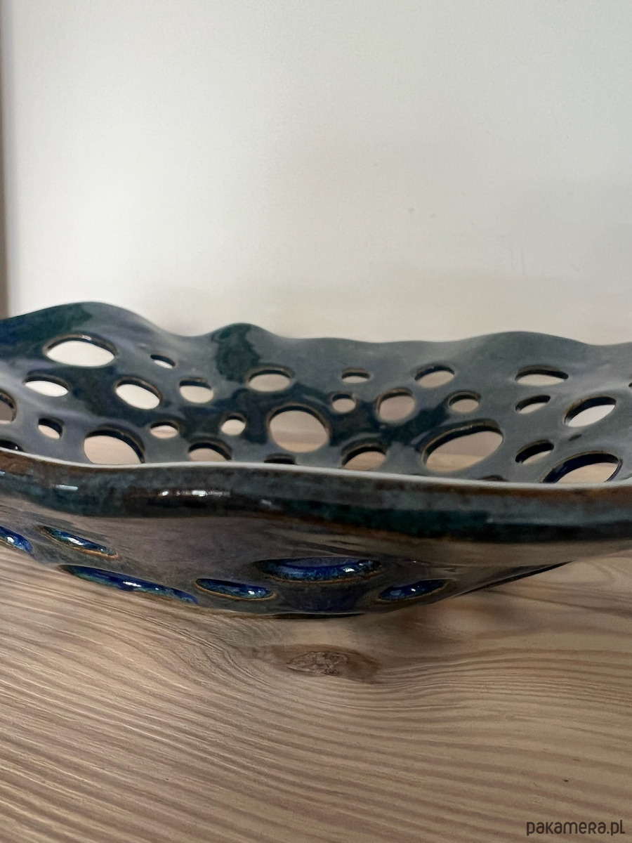 Ceramiczna ażurowa patera o nieregularnym kształcie, świetna, jako misa na owoce, wykonana z jasnej gliny i pokryta granatowo-zielonym szkliwem dającym oryginalne efekty kolorystyczne.