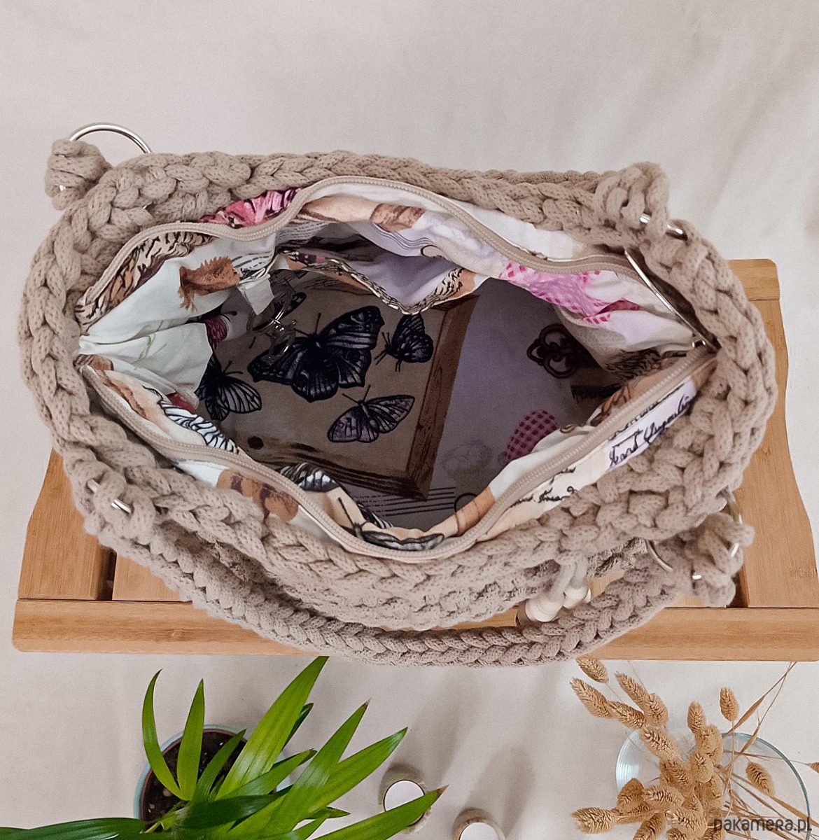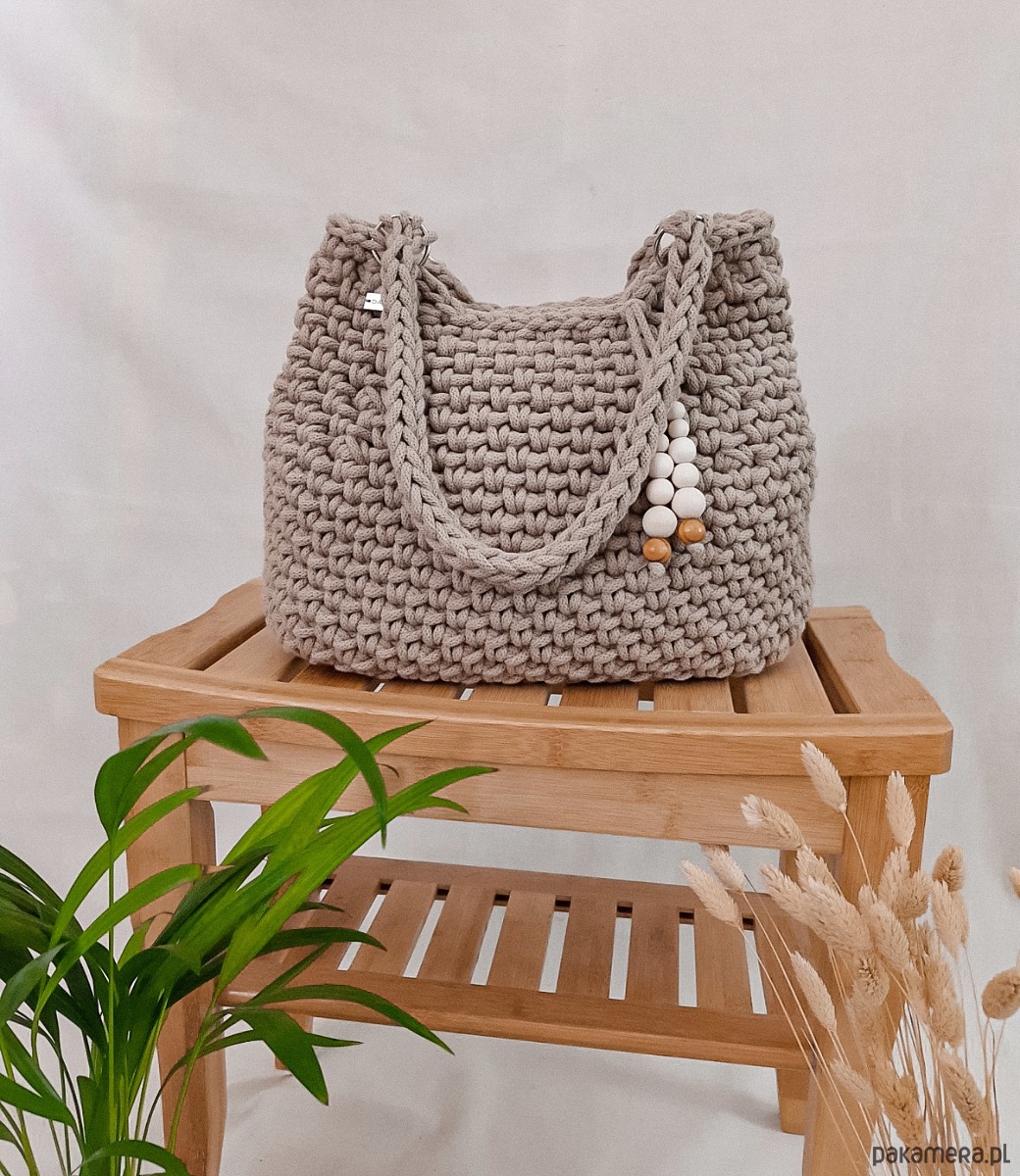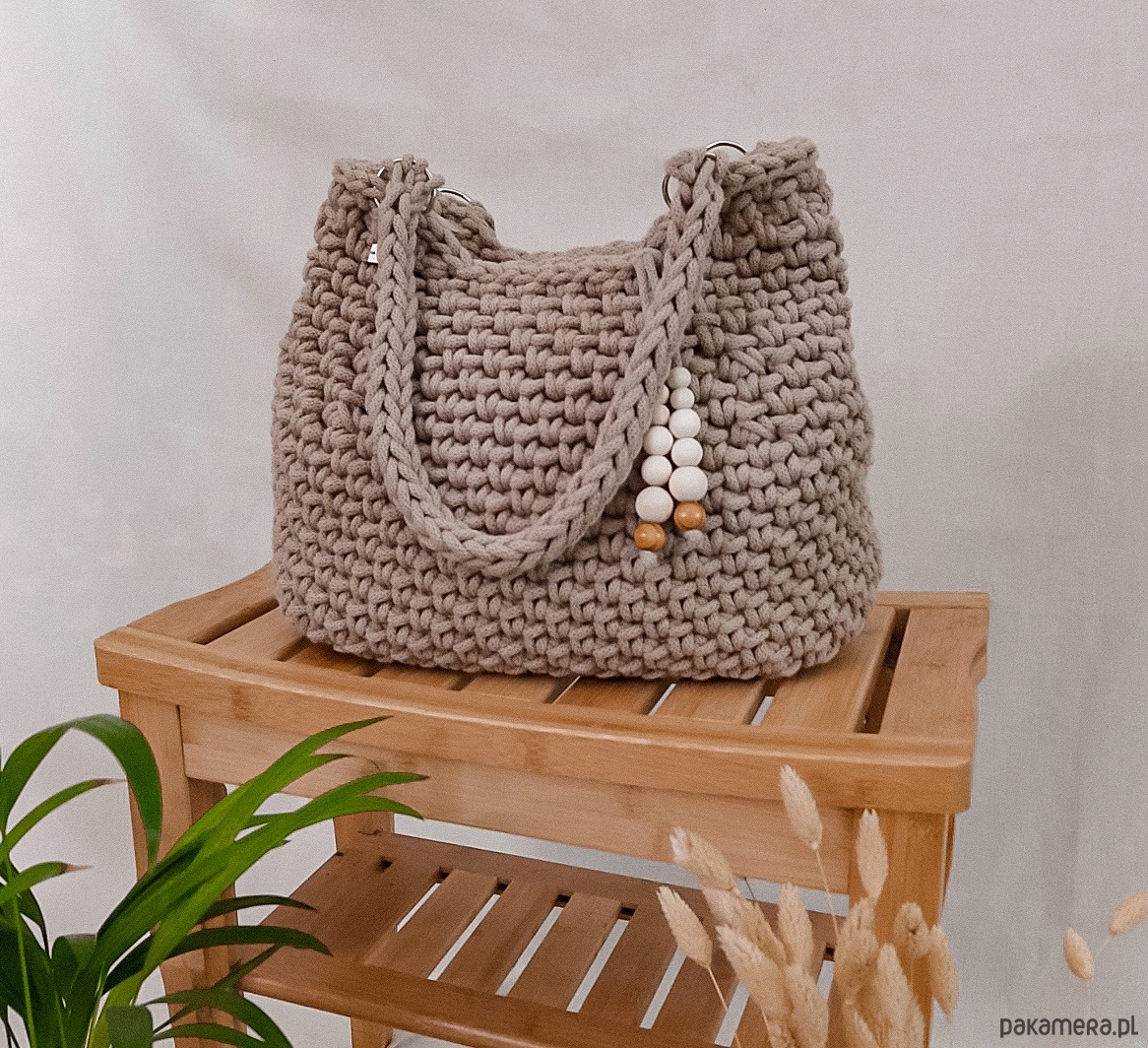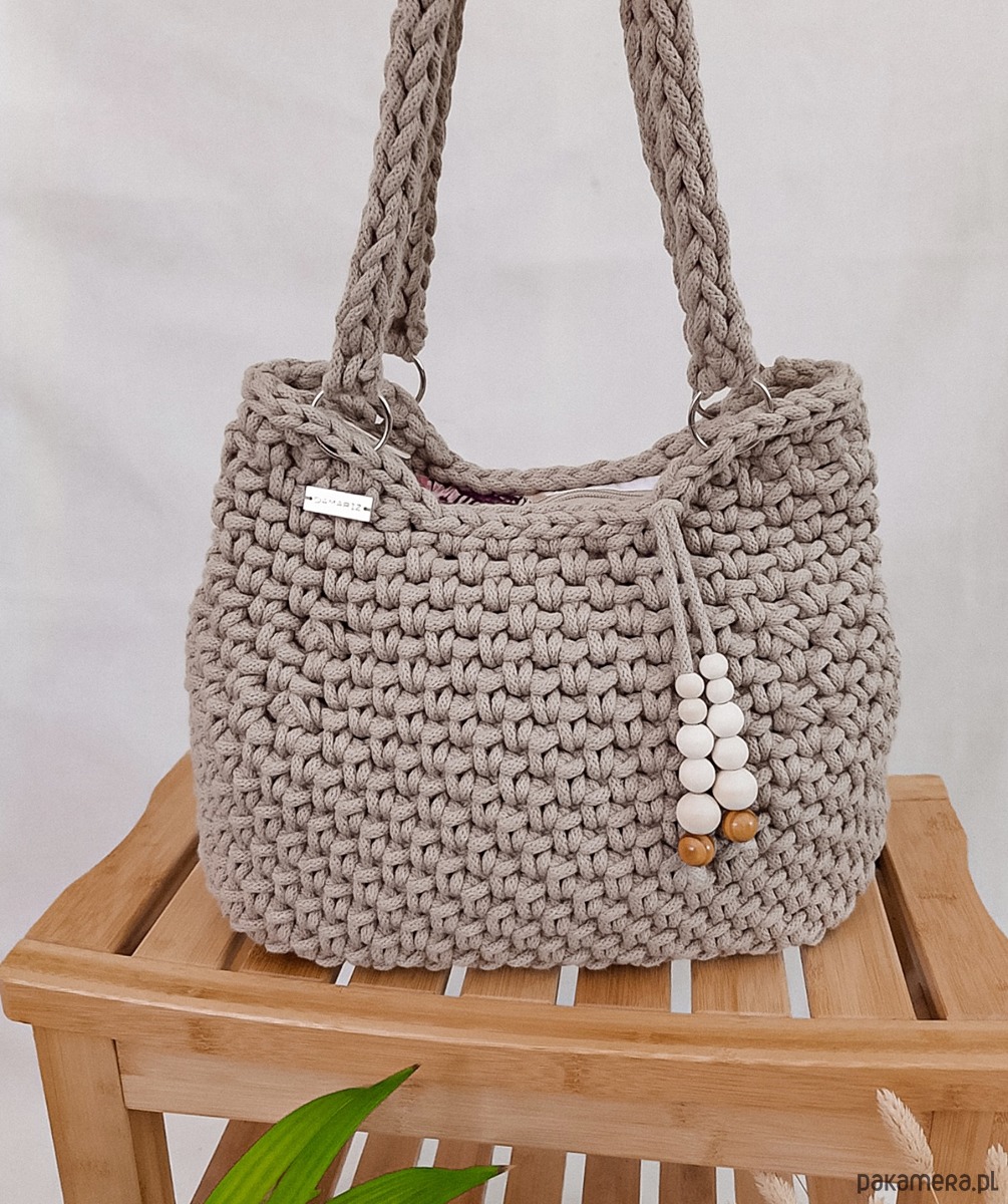 Belly bag to największa torba jaką znajdziesz w ofercie Damariz. Stworzyłam ją dla pań, które potrzebują czuć się gotowe na każdą niespodziankę - zmieścisz w niej naprawdę wszystko. Torba mieści średniej wielkości kocyk więc sprawdzi się również przy spacerach na plażę czy nad rzekę. Wykonałam ją w lekkim ściegu, przez co jej wagę zredukowałam maksymalnie, abyście mogły czuć się z nią swobodnie i komfortowo. Jej design pasuje bardzo dobrze do casualowego stylu. Całości kompozycji dopełniają dekoracyjne korale.