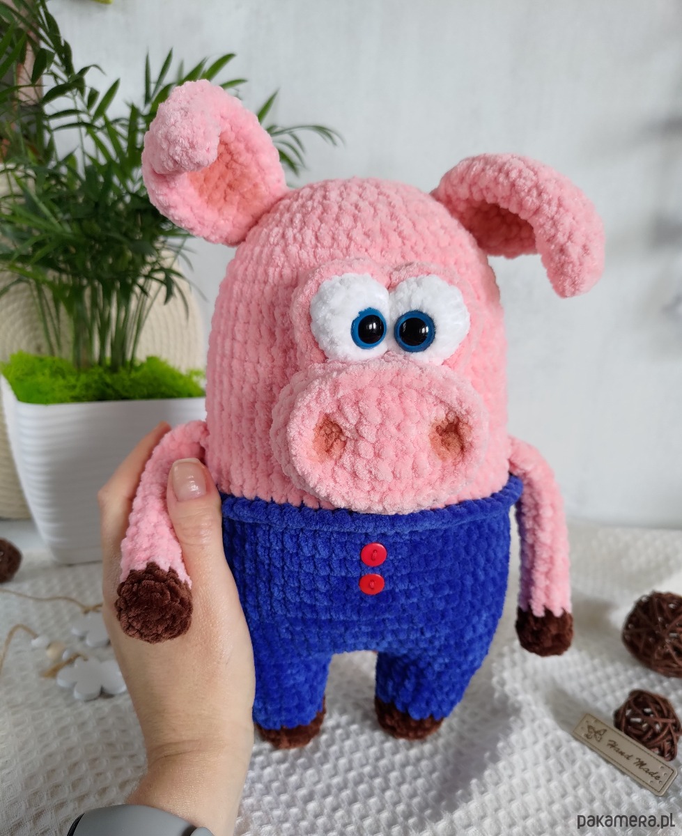 - Wykonana pluszowa świnka z miękkiej włóczki. Bardzo słodka i miła w dotyku! Główny kolor to jasnoróżowy. Świnka ma na sobie nieodpinane granatowe spodnie z plastikowymi guzikami (Zdjęcia świnek w szmaragdowych i niebieskich spodniach są przykładowe - można wykonać na zamówienie).