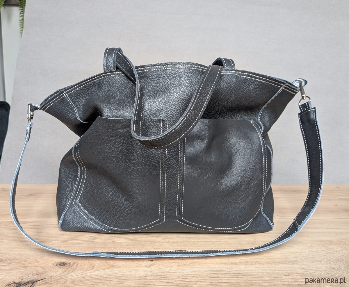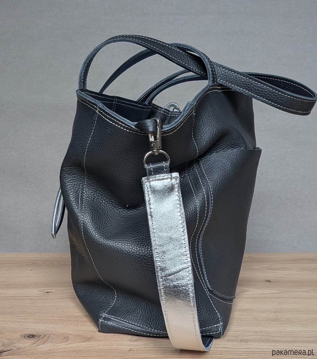 Duża, uszyta ze skóry naturalnej w kolorze szarym.