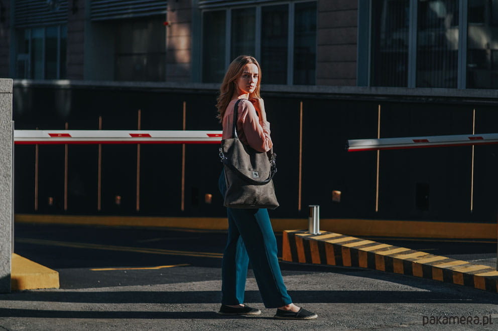 Całość zapinana na zamek. W środku posiada dwie kieszonki, w tym jedną zapinaną na zamek. Dodatkowo dwie zewnętrzne kieszenie.