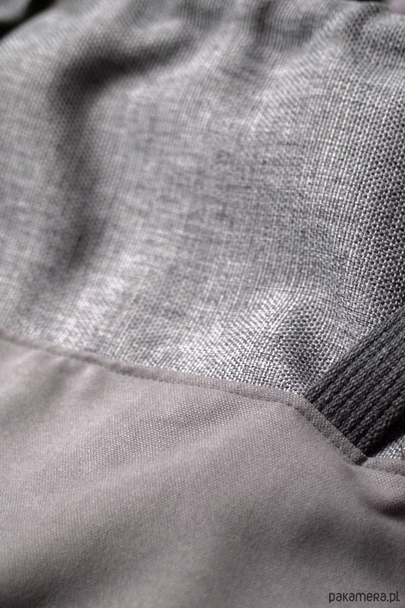 Wykonana z tkaniny w kolorze szarym. Z przodu dwie kieszenie z kilku rodzajów tkanin w odcieniach szarości i różu. Bawełniane, grafitowe pasy i biała, bawełniana podszewka w kapibary.