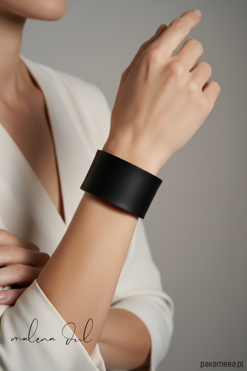 Bransoletka – wyjątkowa i ponadczasowa, wykonana ręcznie ze sztywnej, naturalnej skóry w eleganckim czarnym kolorze. Minimalistyczny, wyrazisty design sprawia, że z łatwością staje się głównym akcentem stylizacji, dodając jej charakteru i nowoczesnej elegancji. Szyta mocną nicią kaletniczą.