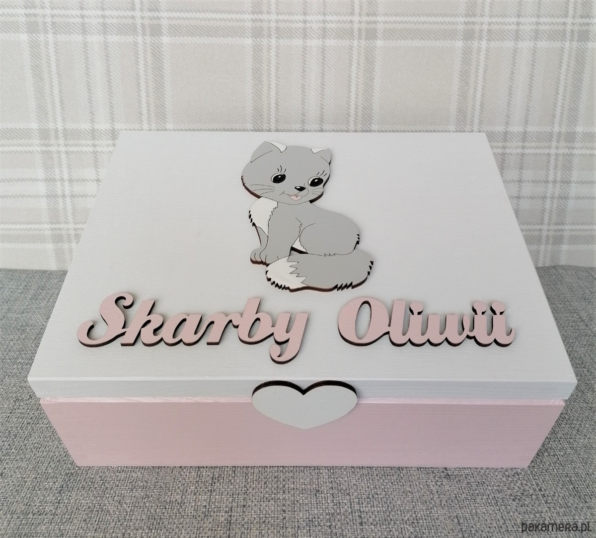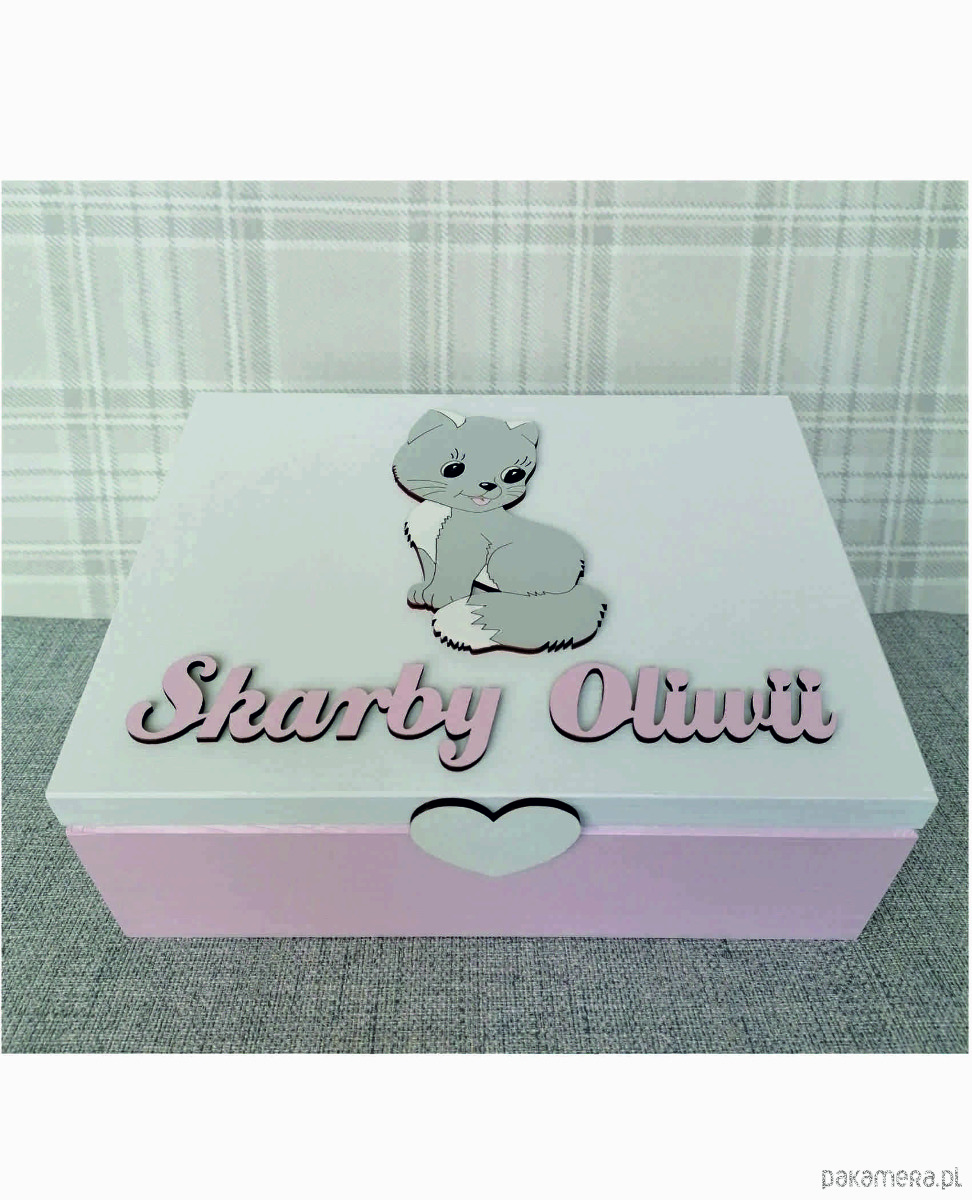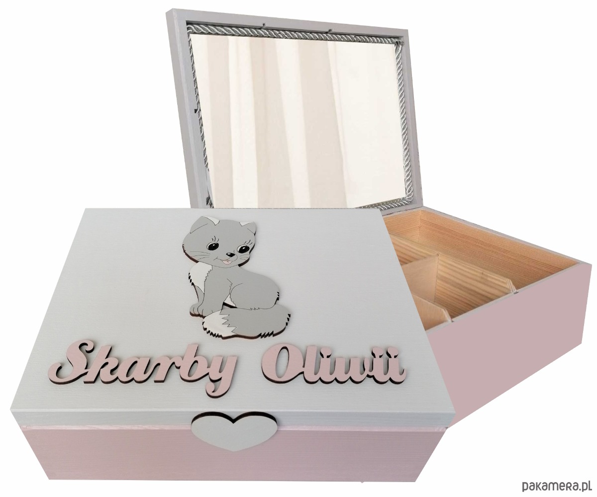 Elementem dekoracyjnym jest wykonany przez naszych plastyków drewniany dekor oraz napis SKARBY OLIWII. Oczywiście w tym miejscu napiszemy każde wskazane w uwagach przez Ciebie imię.