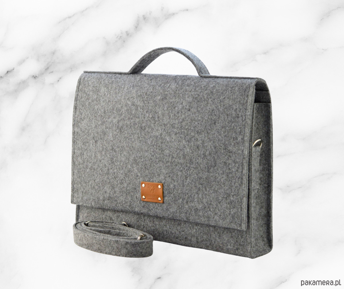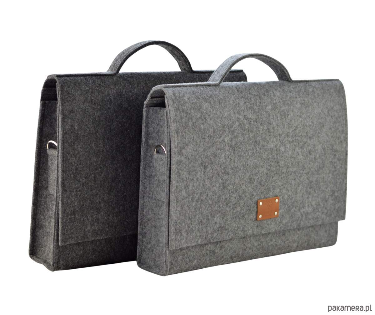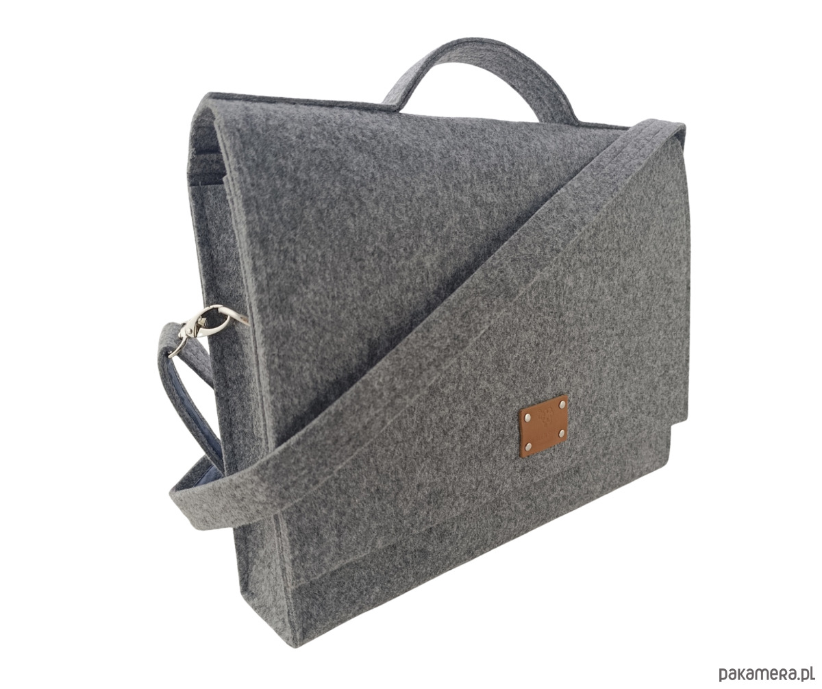 Torba została wykonana z solidnego, impregnowanego filcu technicznego w kolorze szarym. Prosta, minimalistyczna forma. Torebka jest bardzo starannie wykonana. Klapa ozdobiona jest skórzaną metką z logo. Do torby wejdzie laptop 15,6". Mniejszy też ;)