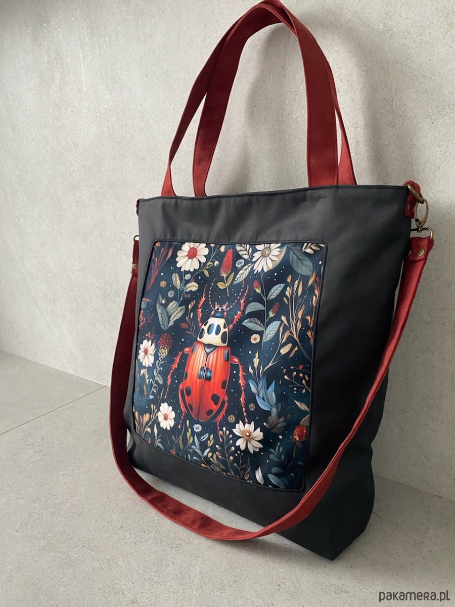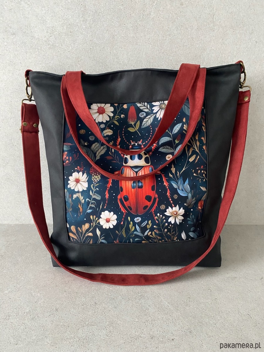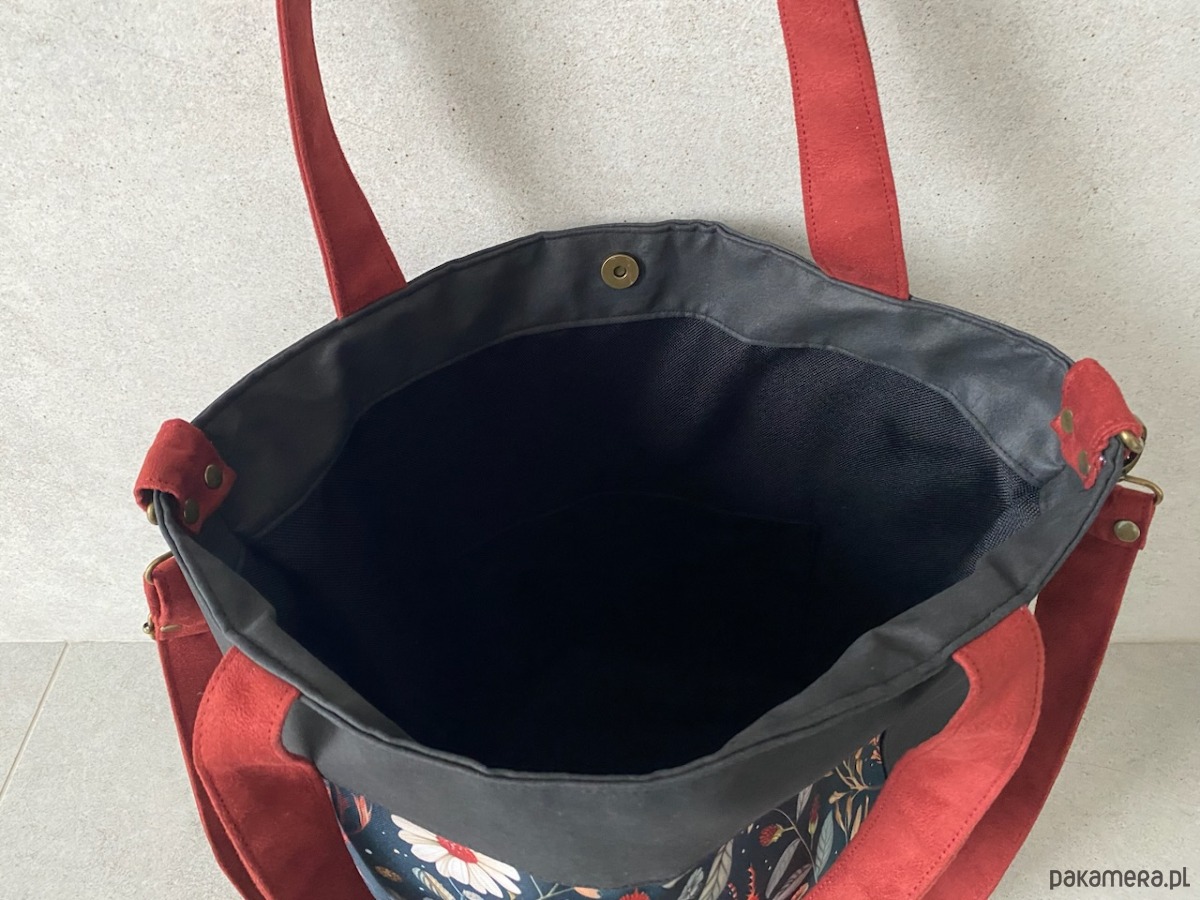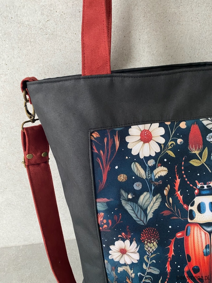 Przepastna torba z ornamentem wykonana z nubuku syntetycznego z printem na tkaninie wodoodpornej.