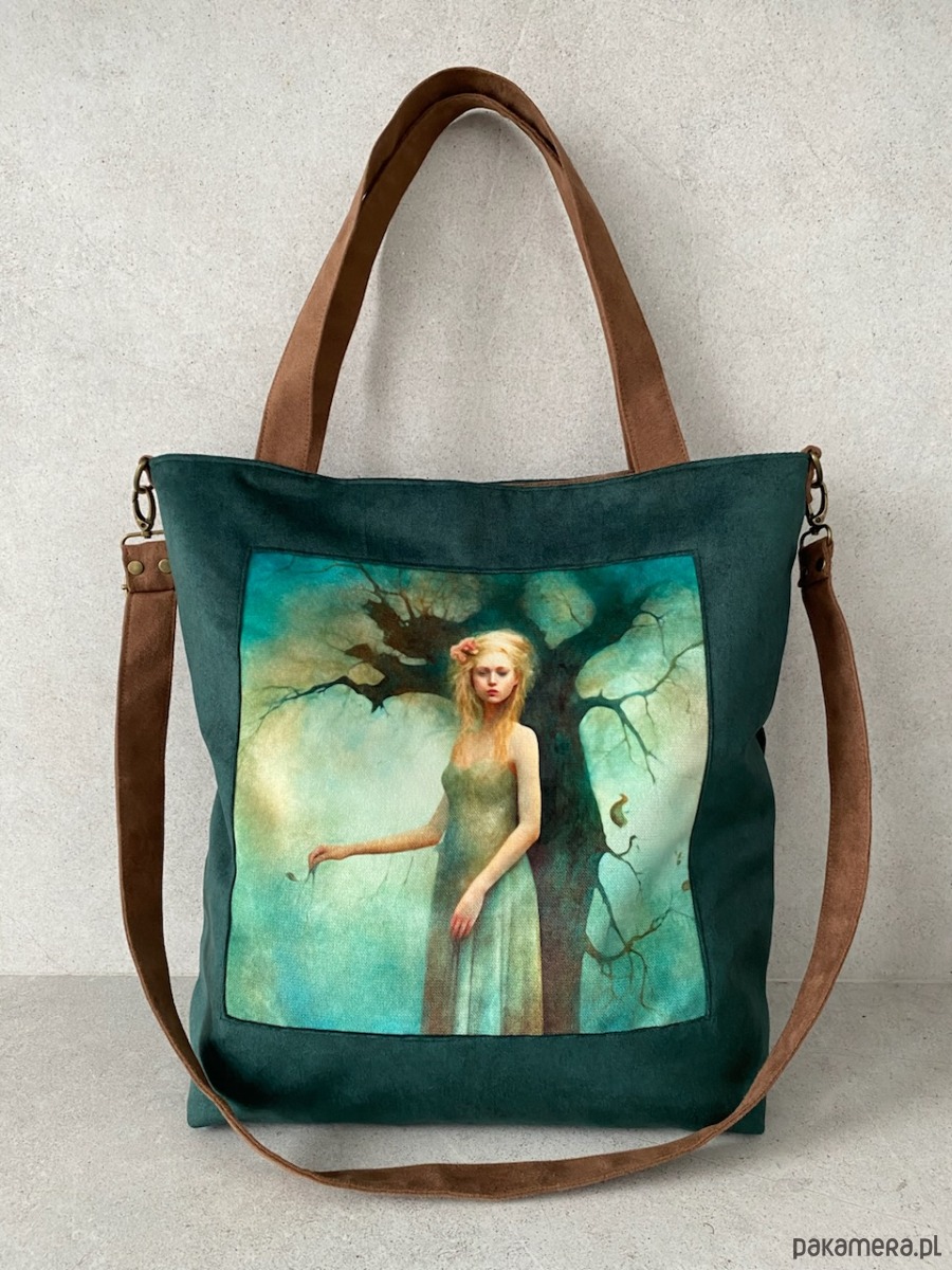 Przepastna torba z serii „Duchy lasu” wykonana z tkaniny welurowej z printem.
