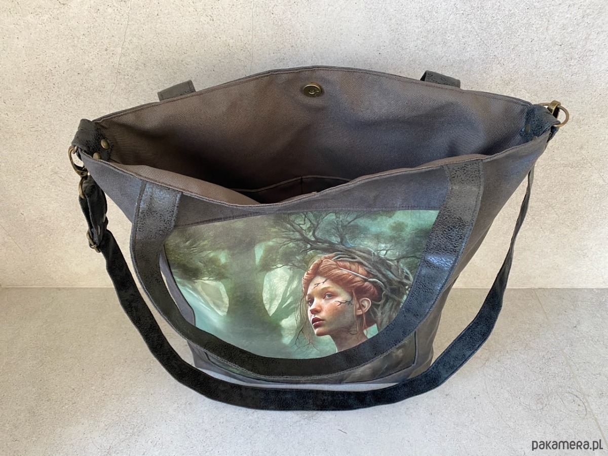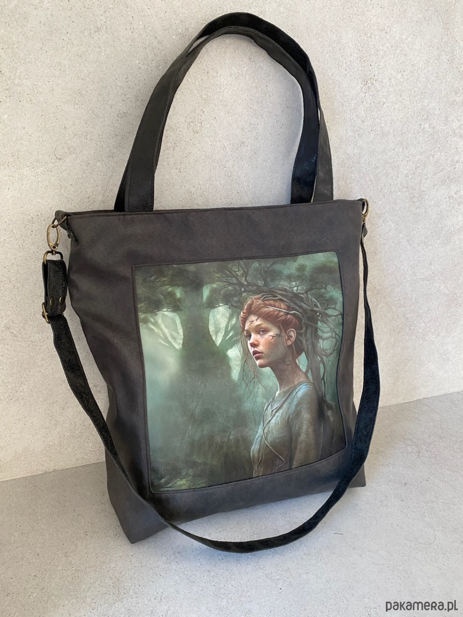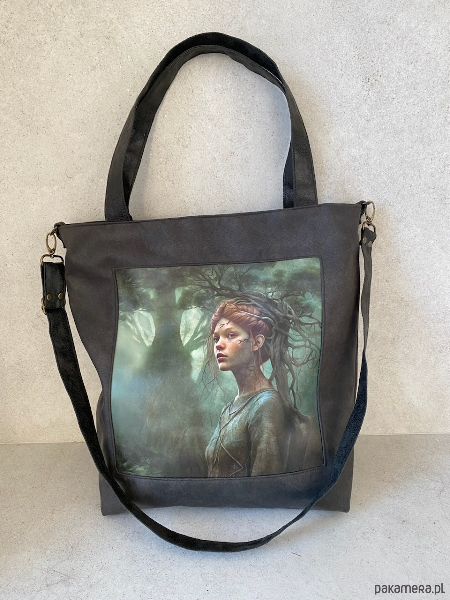 Przepastna torba z serii „Duchy lasu” wykonana z nubuku syntetycznego z printem na eko skórze.