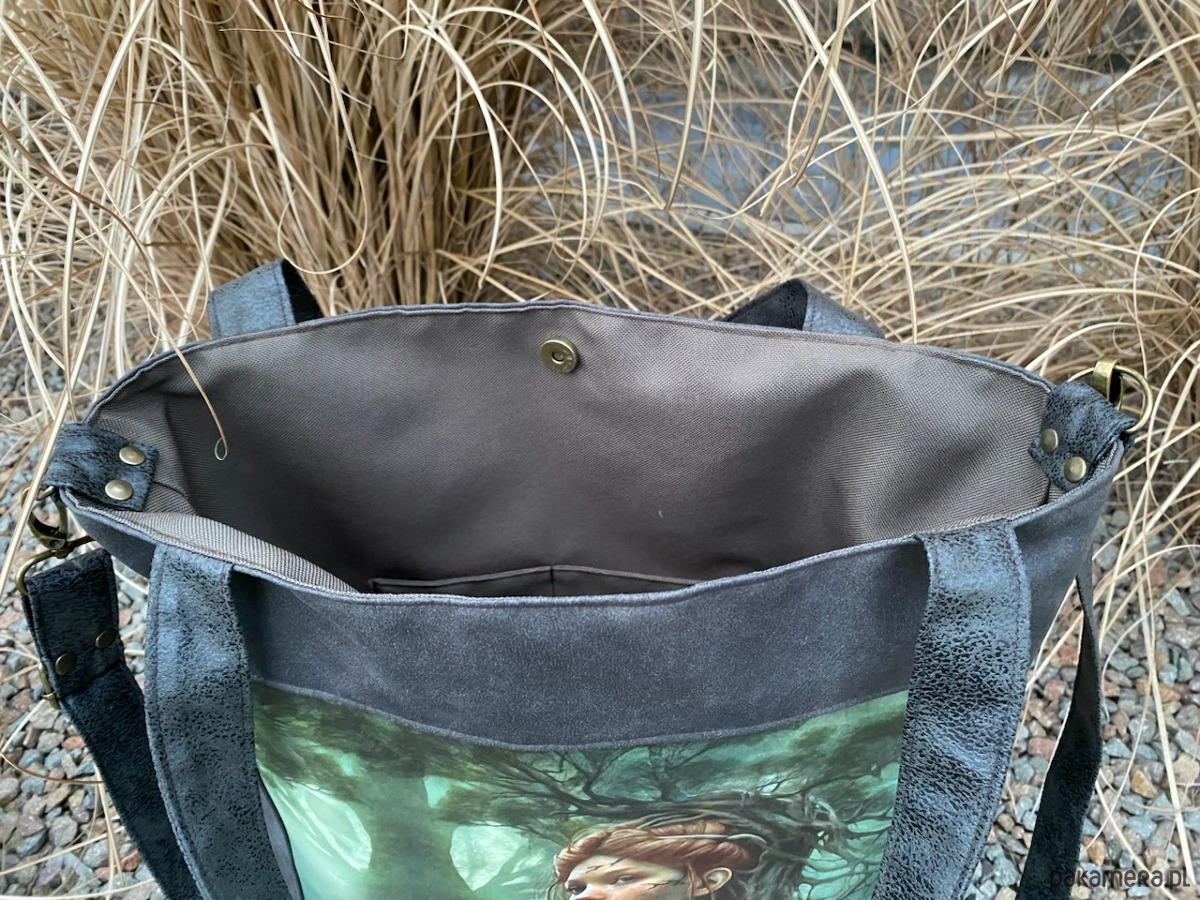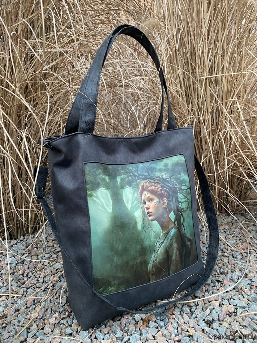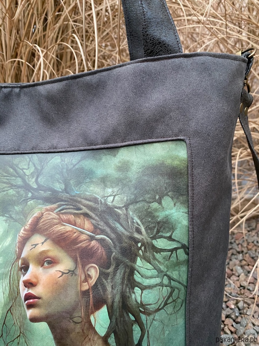 Przepastna torba z serii „Duchy lasu” wykonana z nubuku syntetycznego z printem na eko skórze.