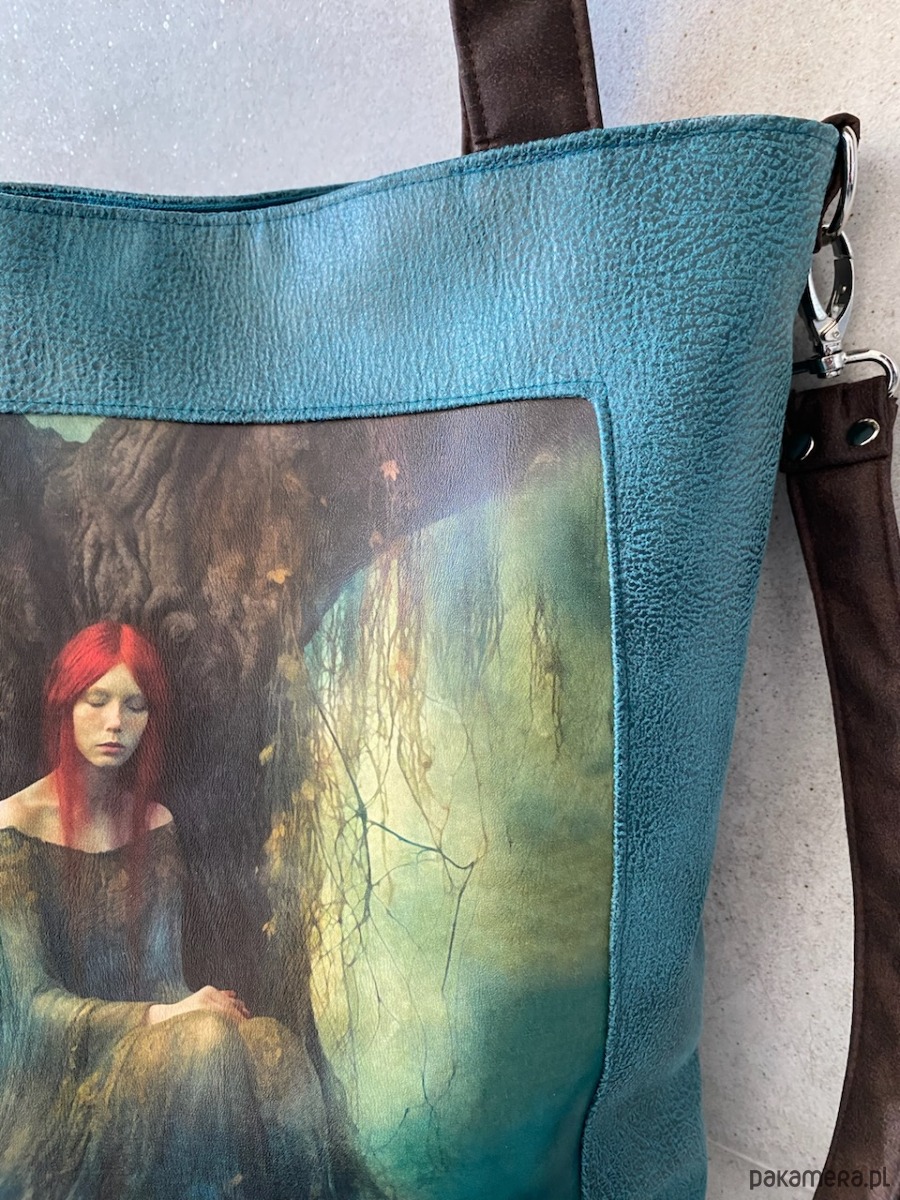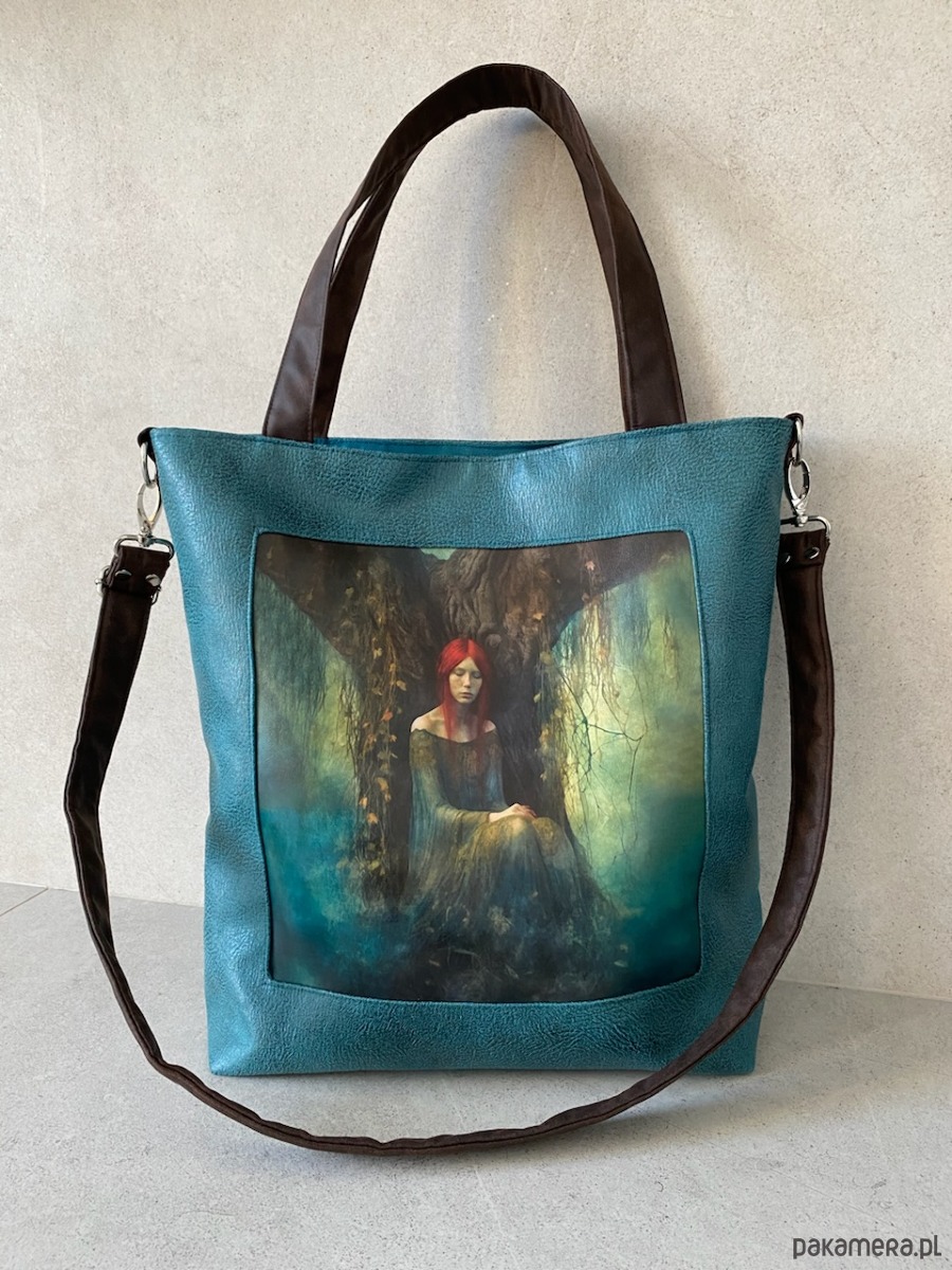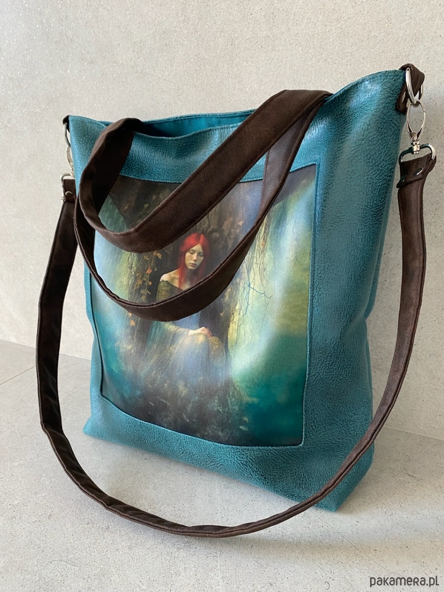 Przepastna torba z serii „Duchy lasu” wykonana ze skóry syntetycznej z printem na skórze ekologicznej.