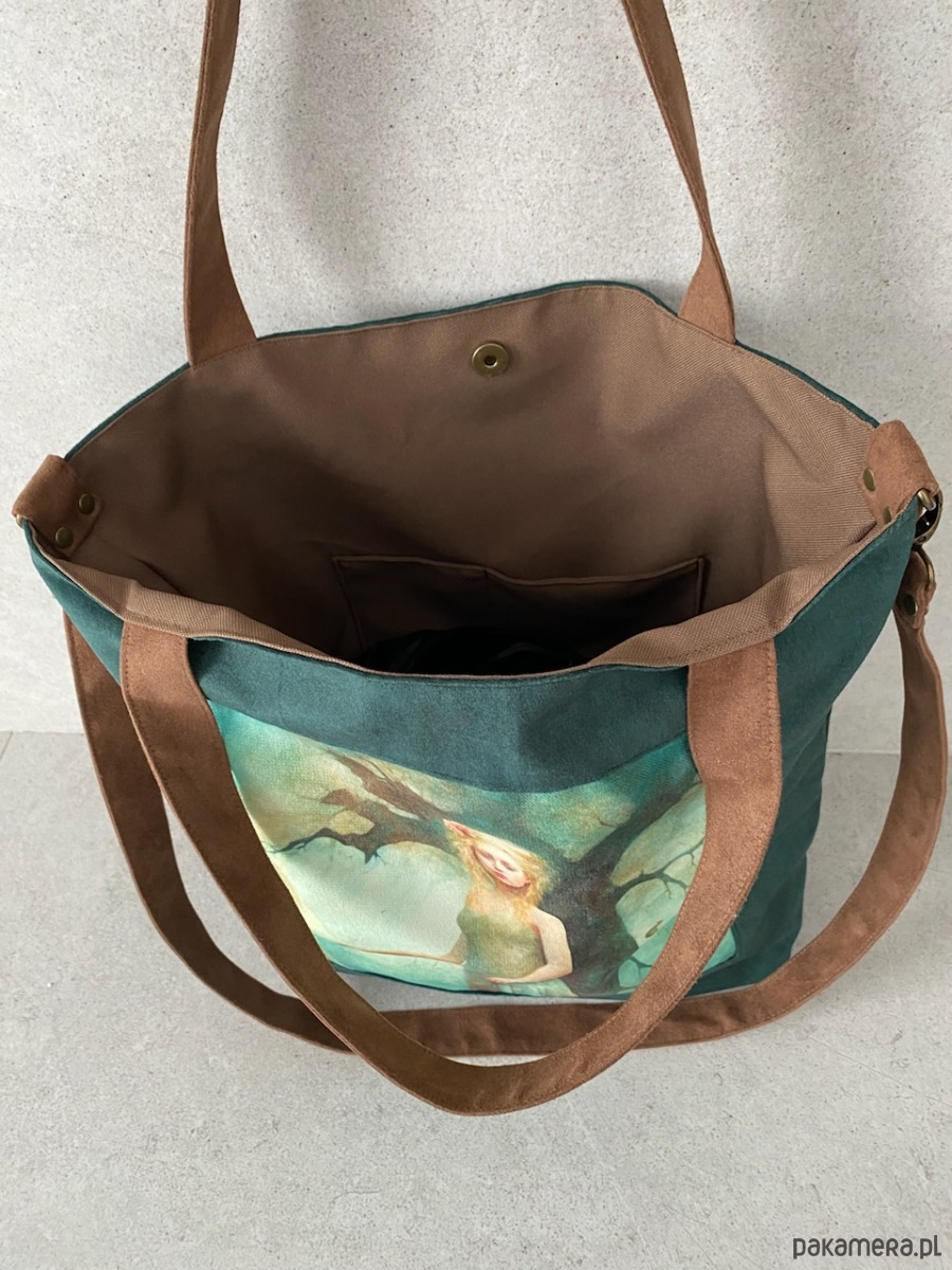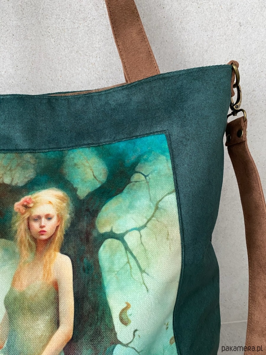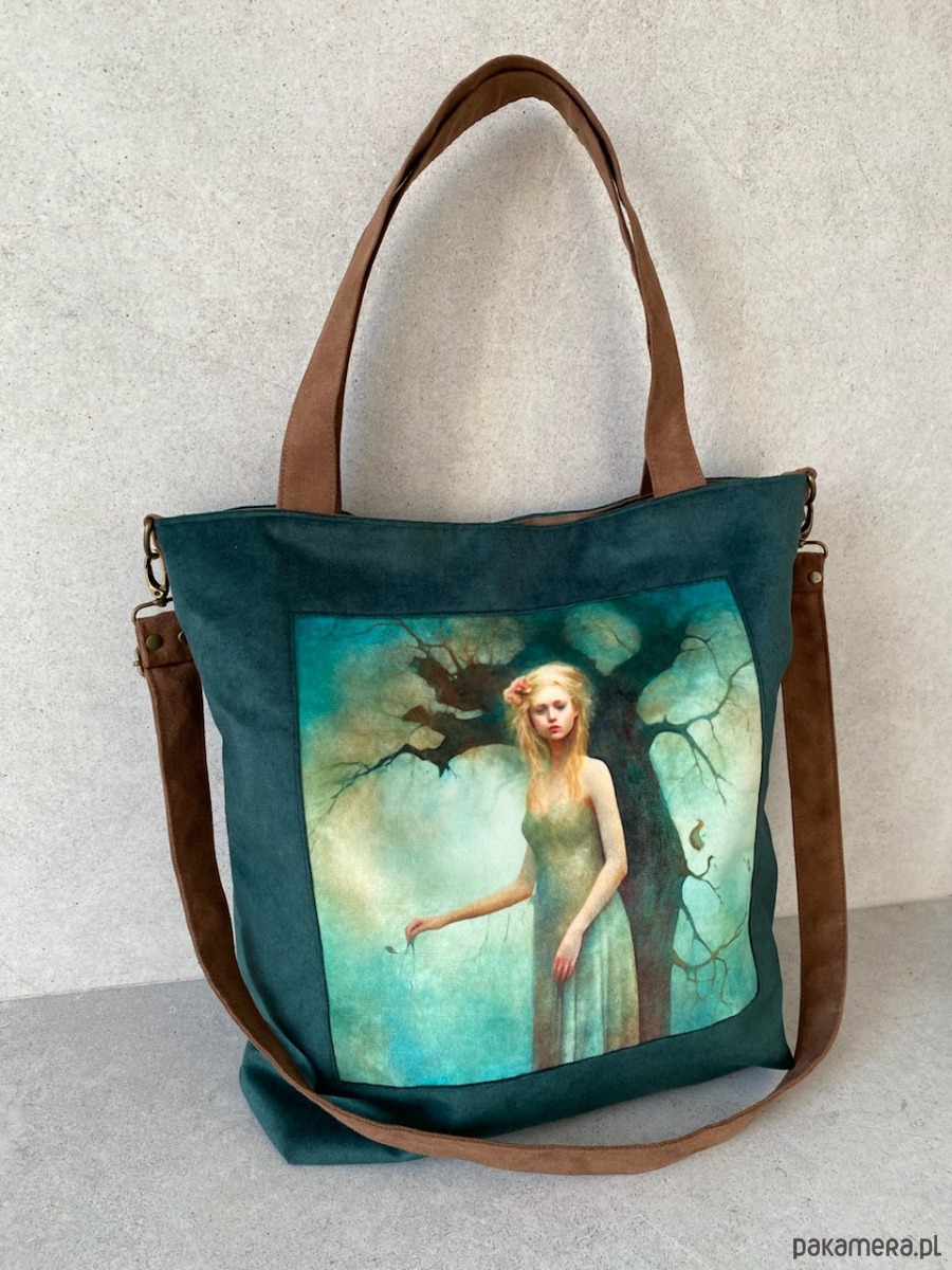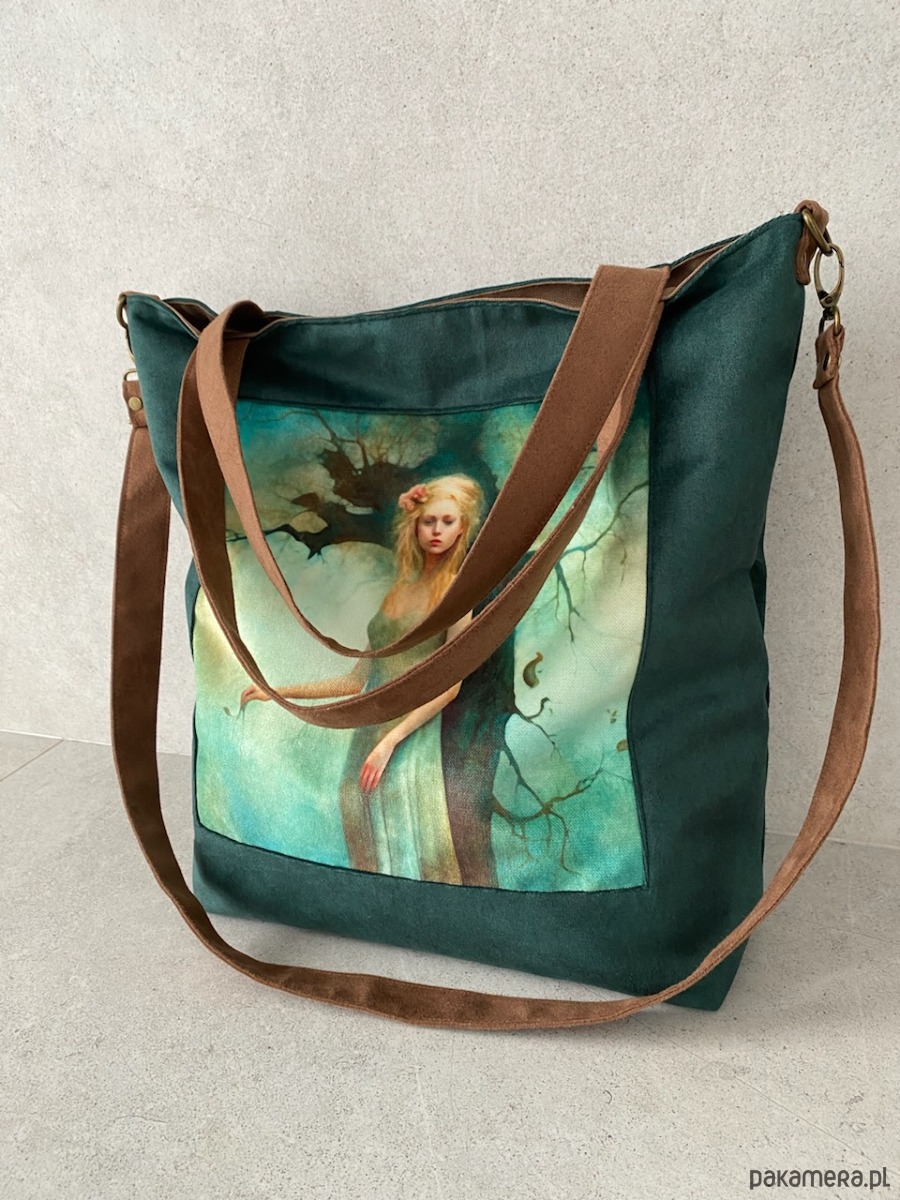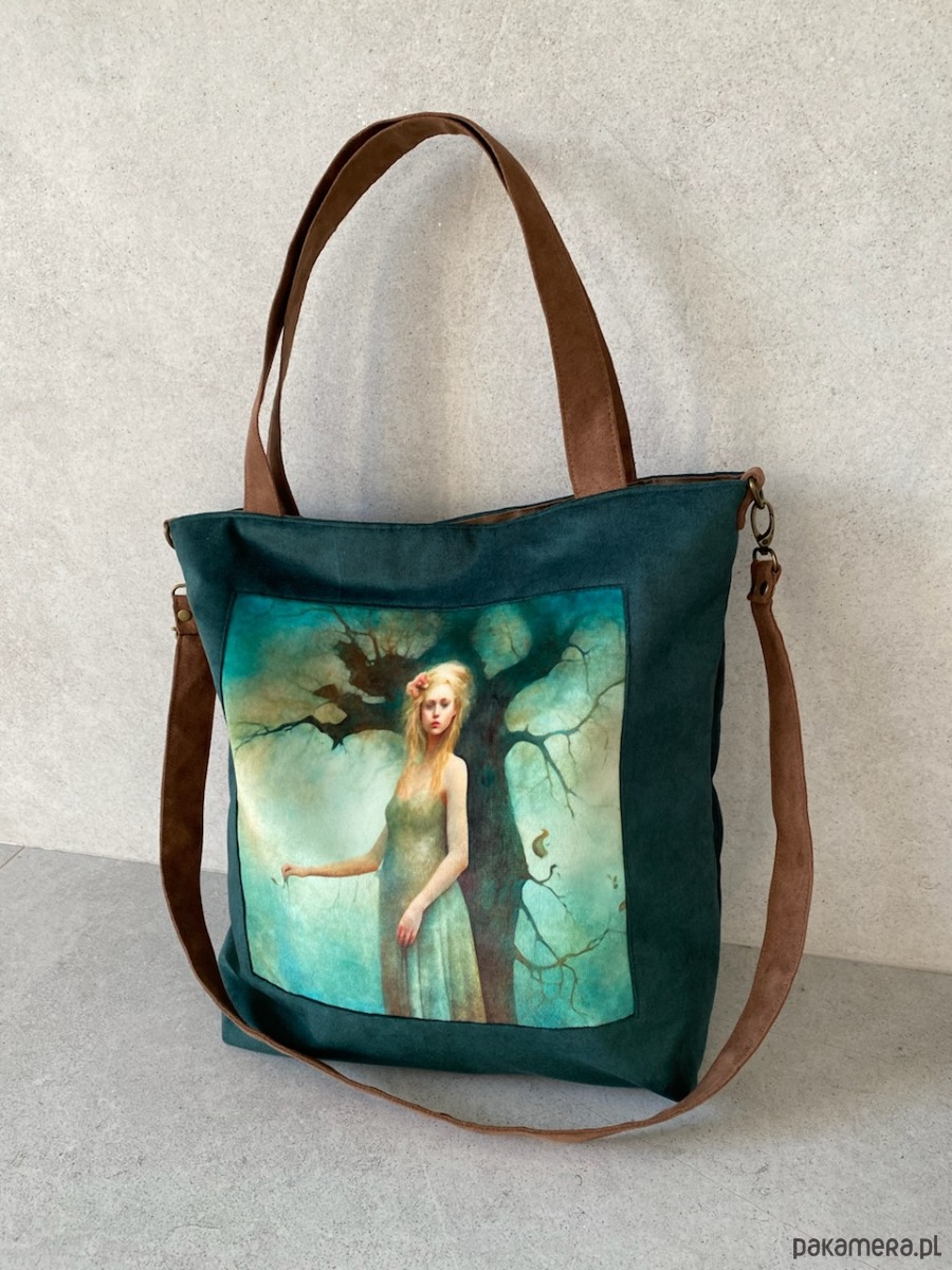 Przepastna torba z serii „Duchy lasu” wykonana z tkaniny welurowej z printem.