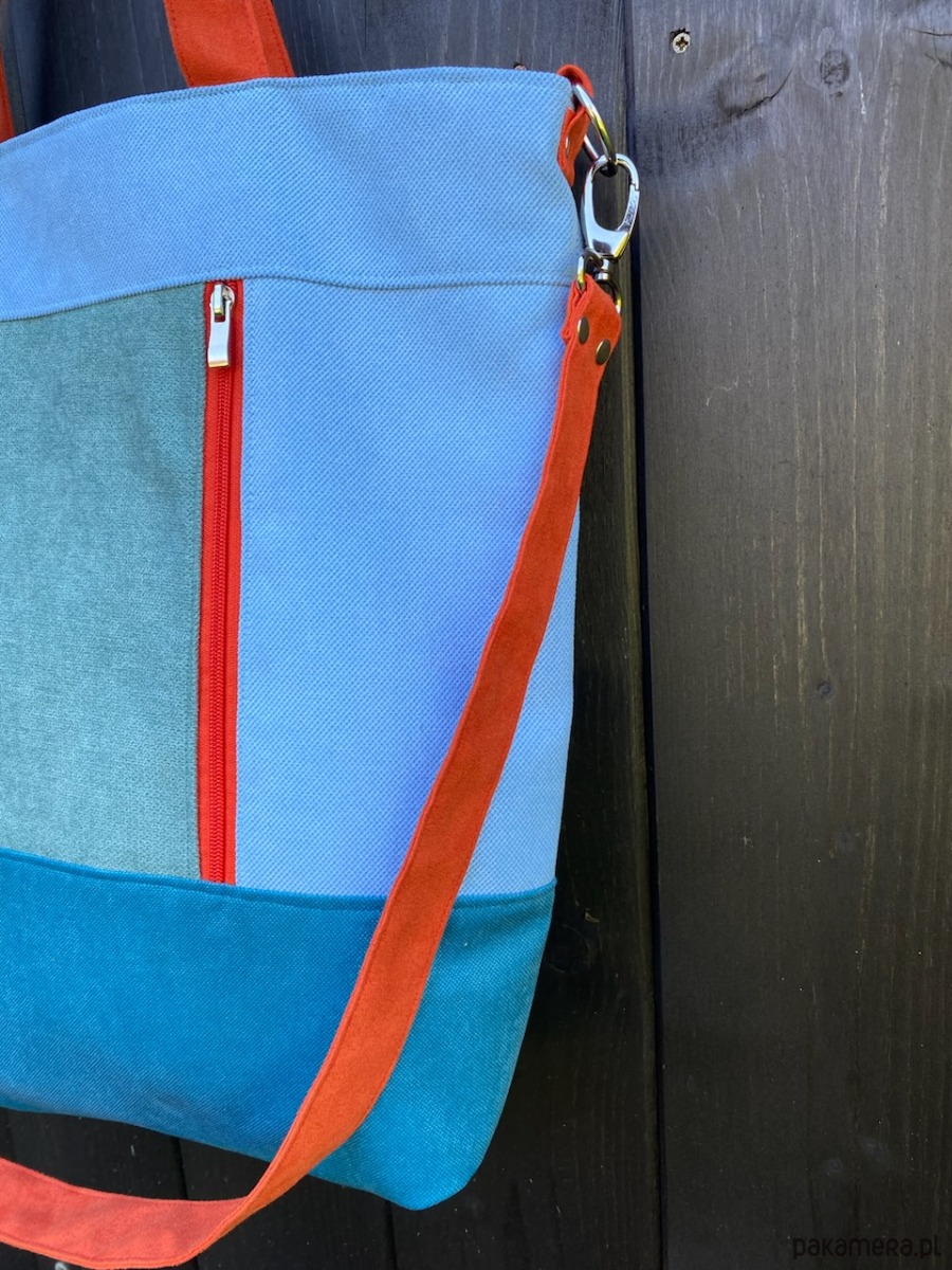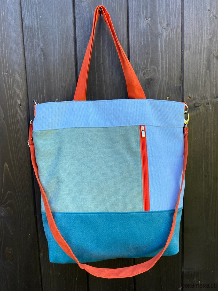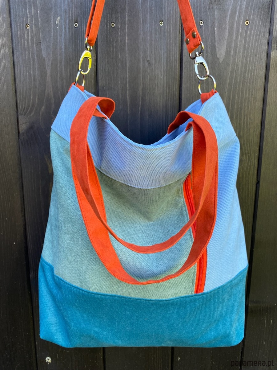 Duża torba wykonana z syntetycznego nubuku I tkaniny o płóciennym splocie.
