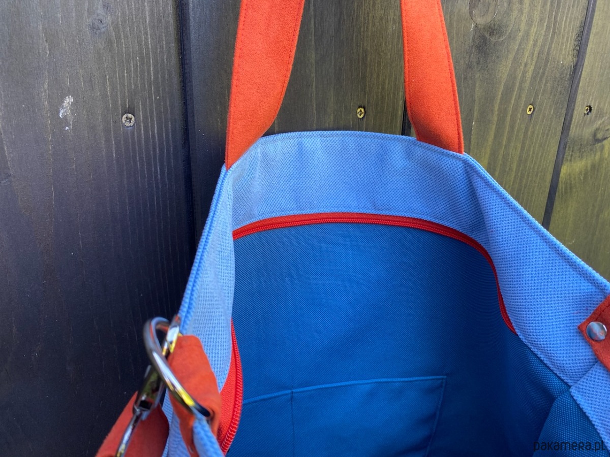 W środku torba wykończona podszewką z dwudzielną kieszonką.