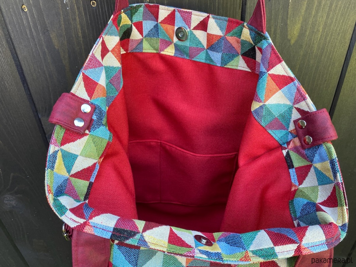 W środku torba wykończona podszewką z dwudzielną kieszonką.