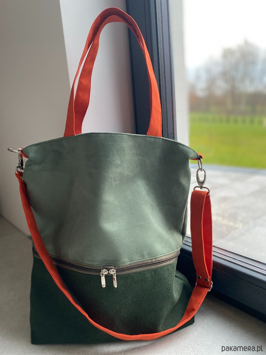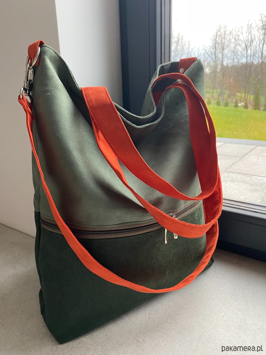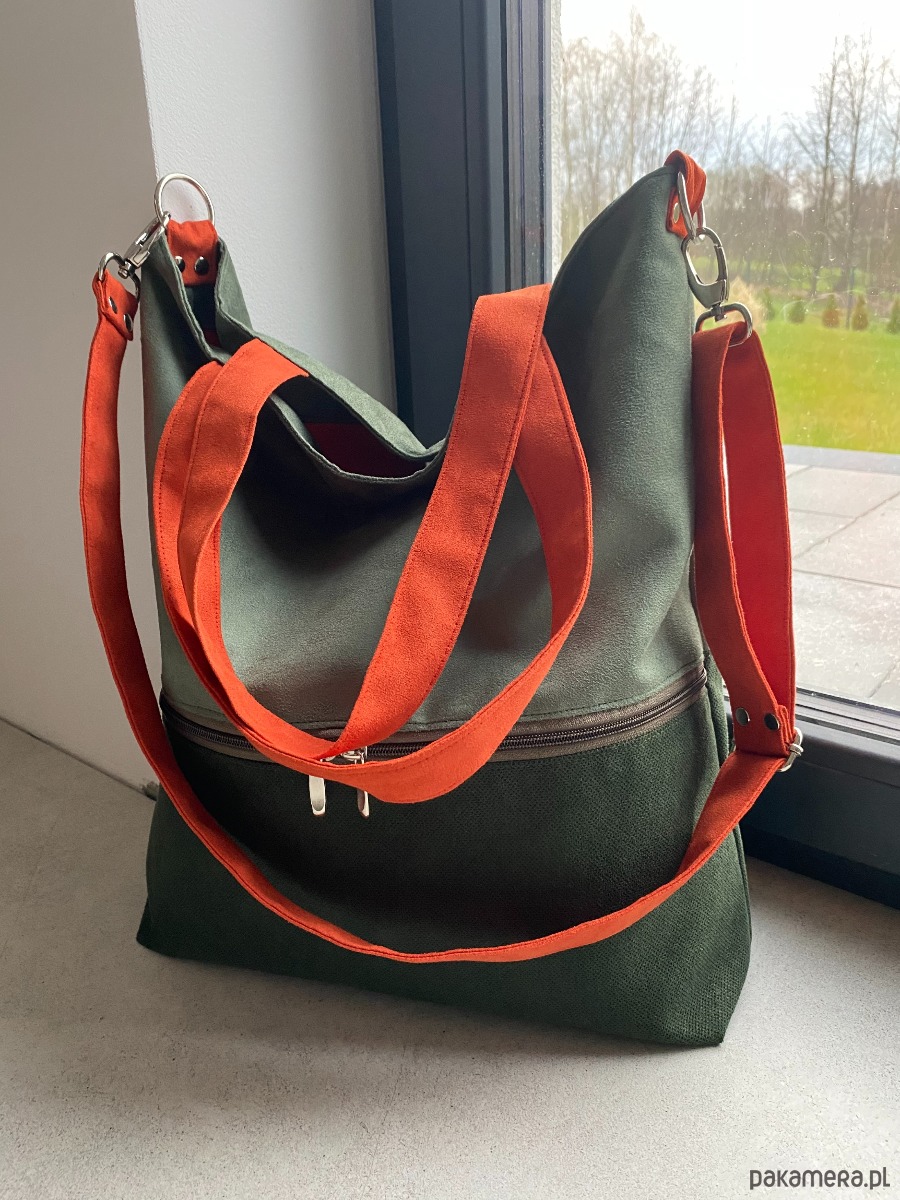 Duża torba na ramię z zapinaną kieszenią - zielono-pomarańczowa