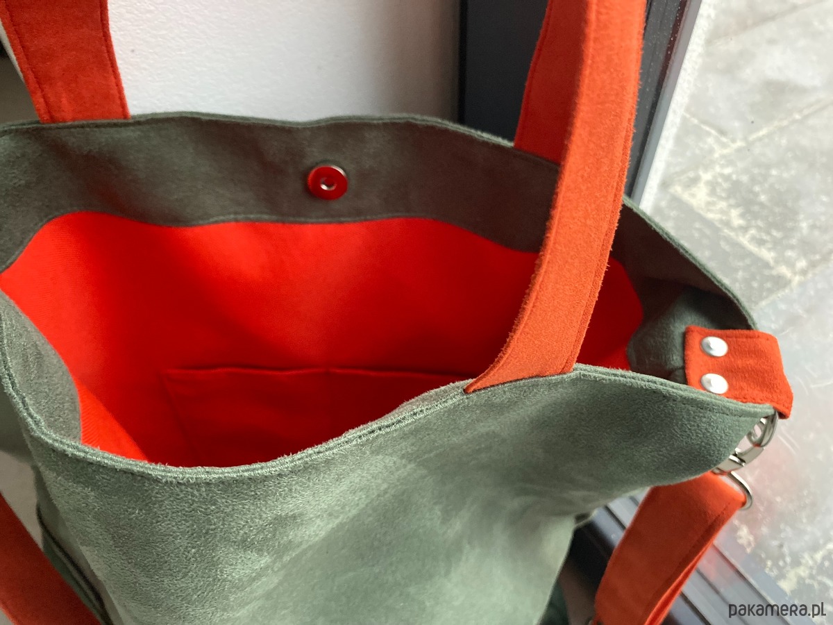 W środku torba wykończona podszewką z dwudzielną kieszonką.