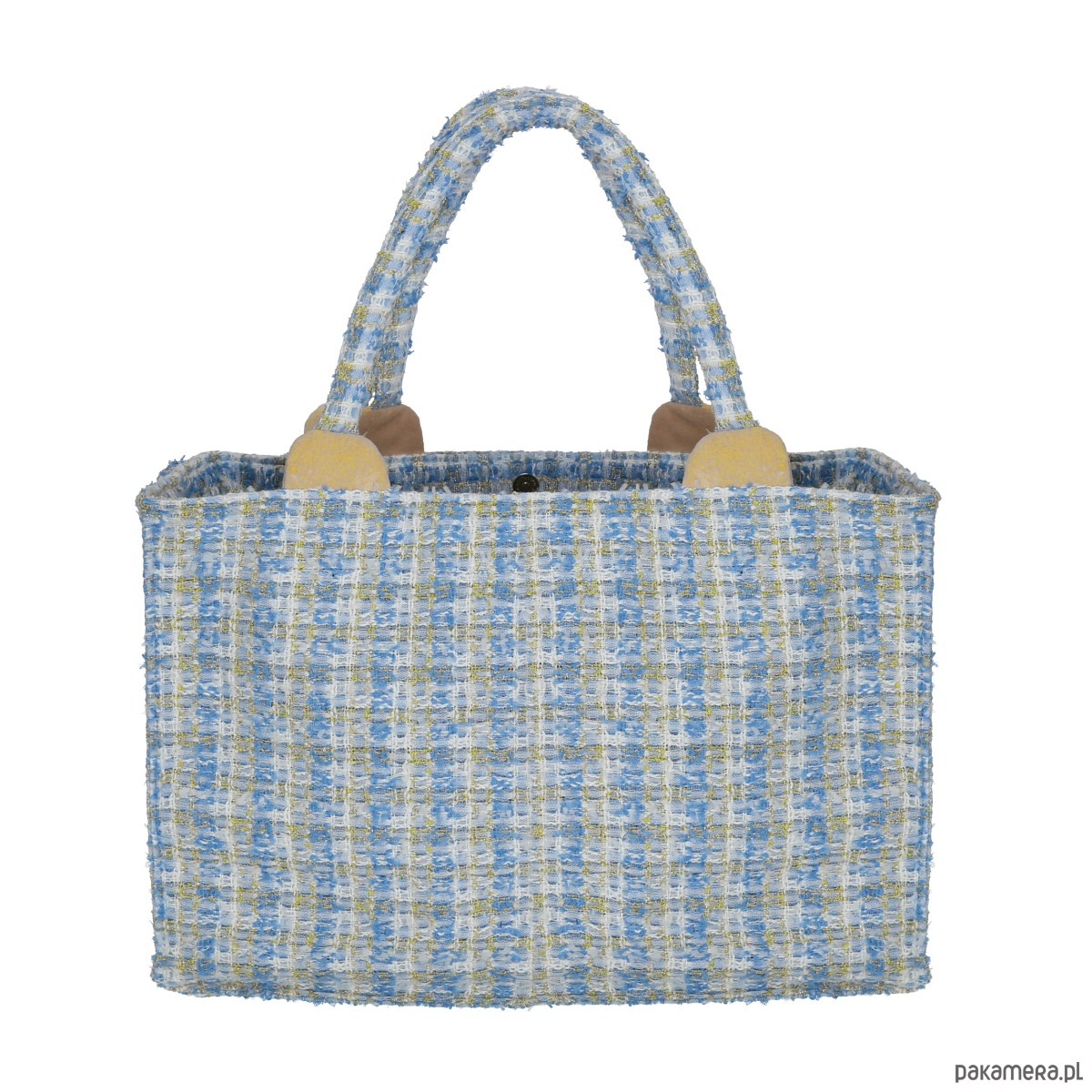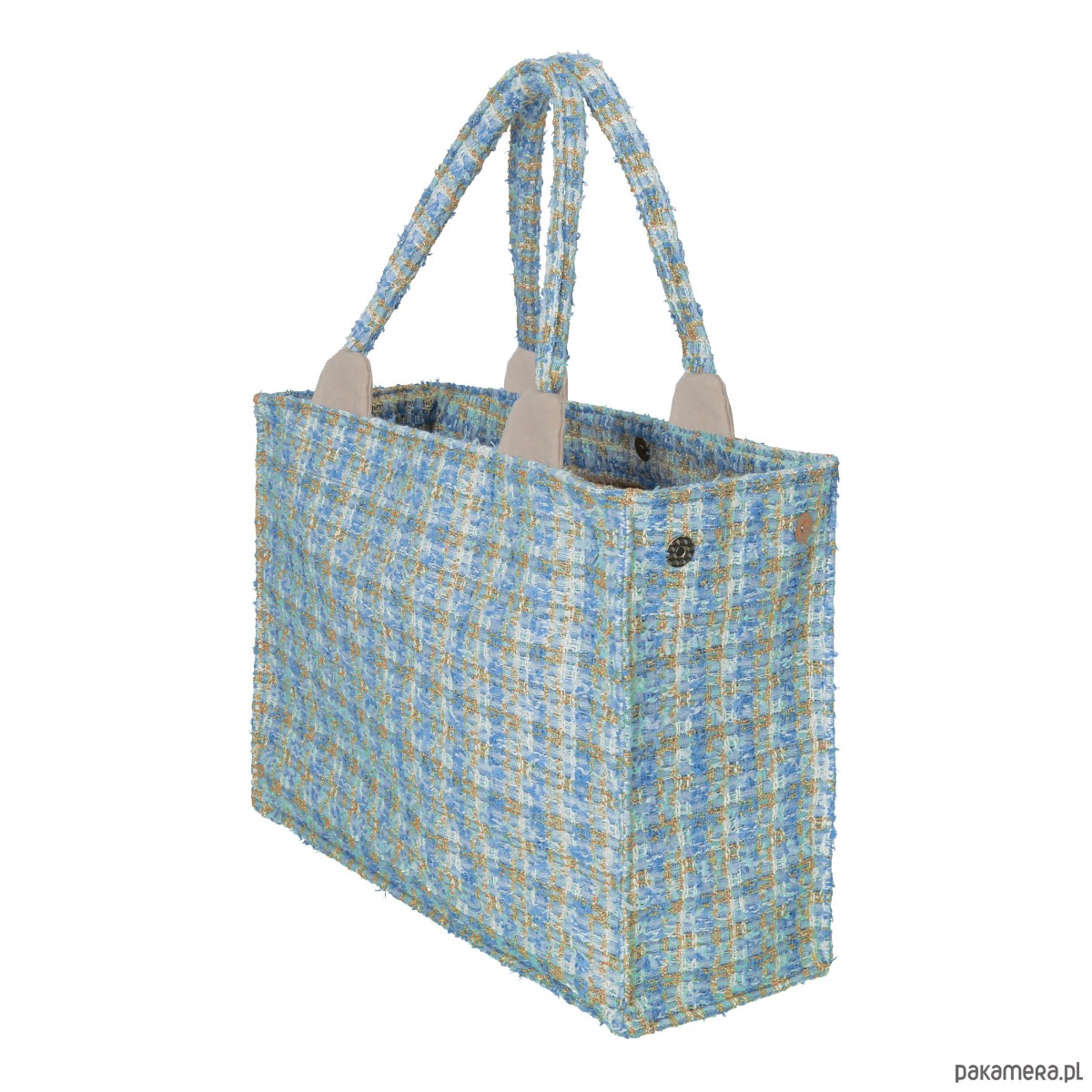 Rewelacyjna torba/shopper uszyta z włoskiej plecionki bawełnianej premium, w przepiękne odcienie błękitu, przeplatane złotą nitką. Boki torby oraz dno są lekko usztywnione/podklejone flizeliną oraz stabilizatorem, którego nie widać ponieważ w środku torby jest podszewka. Rączki grube, mocno zamocowane, zakończone elementami ze skóry cielęcej w kolorze beżowym. Na kantach charakterystyczne przeszycia, typowe dla tego rodzaju shopperów.