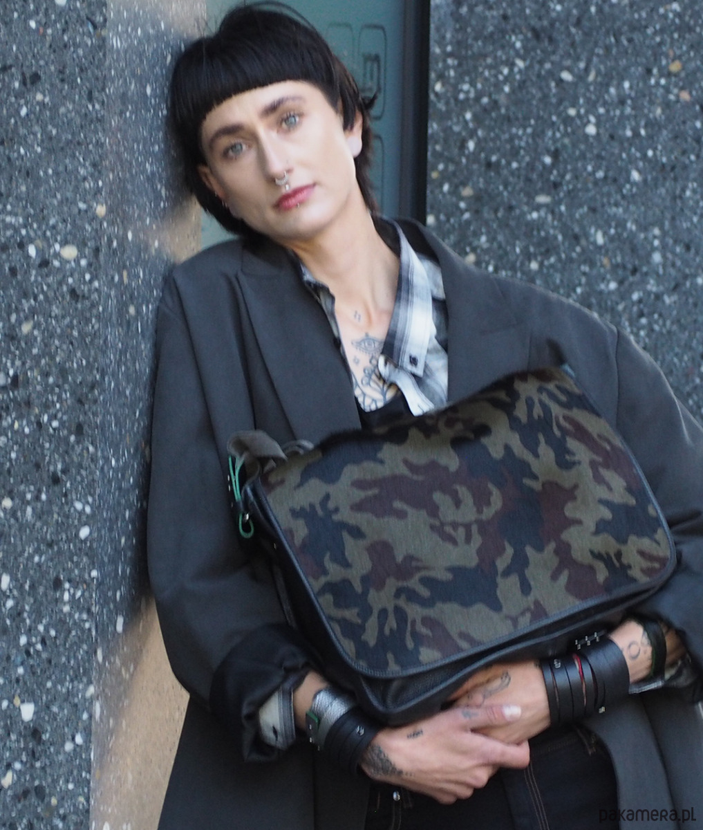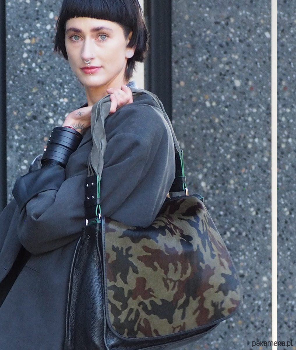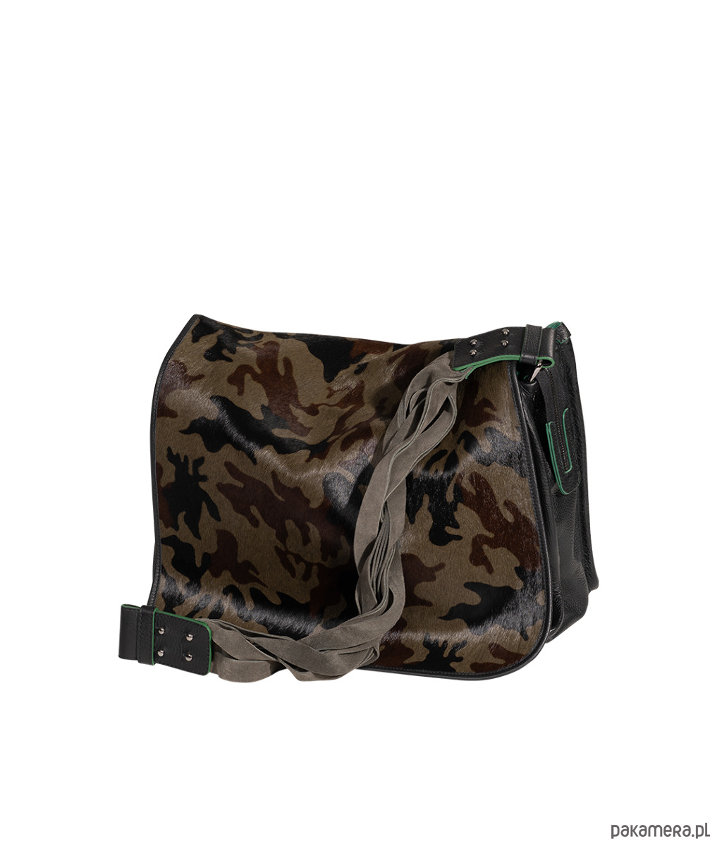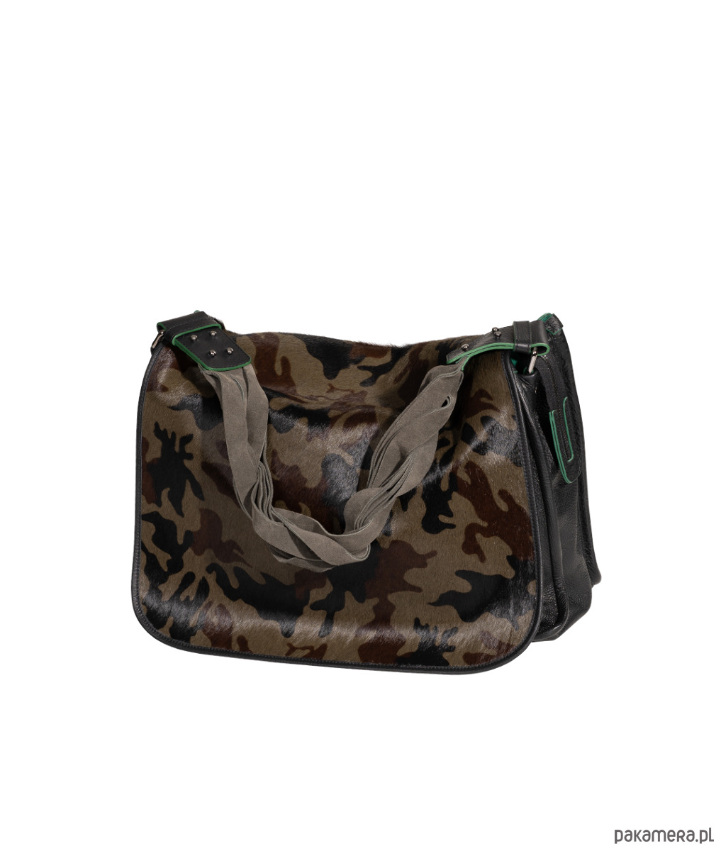 Duża torba skórzana, z klapą ze skóry z włosiem z nadrukiem moro
