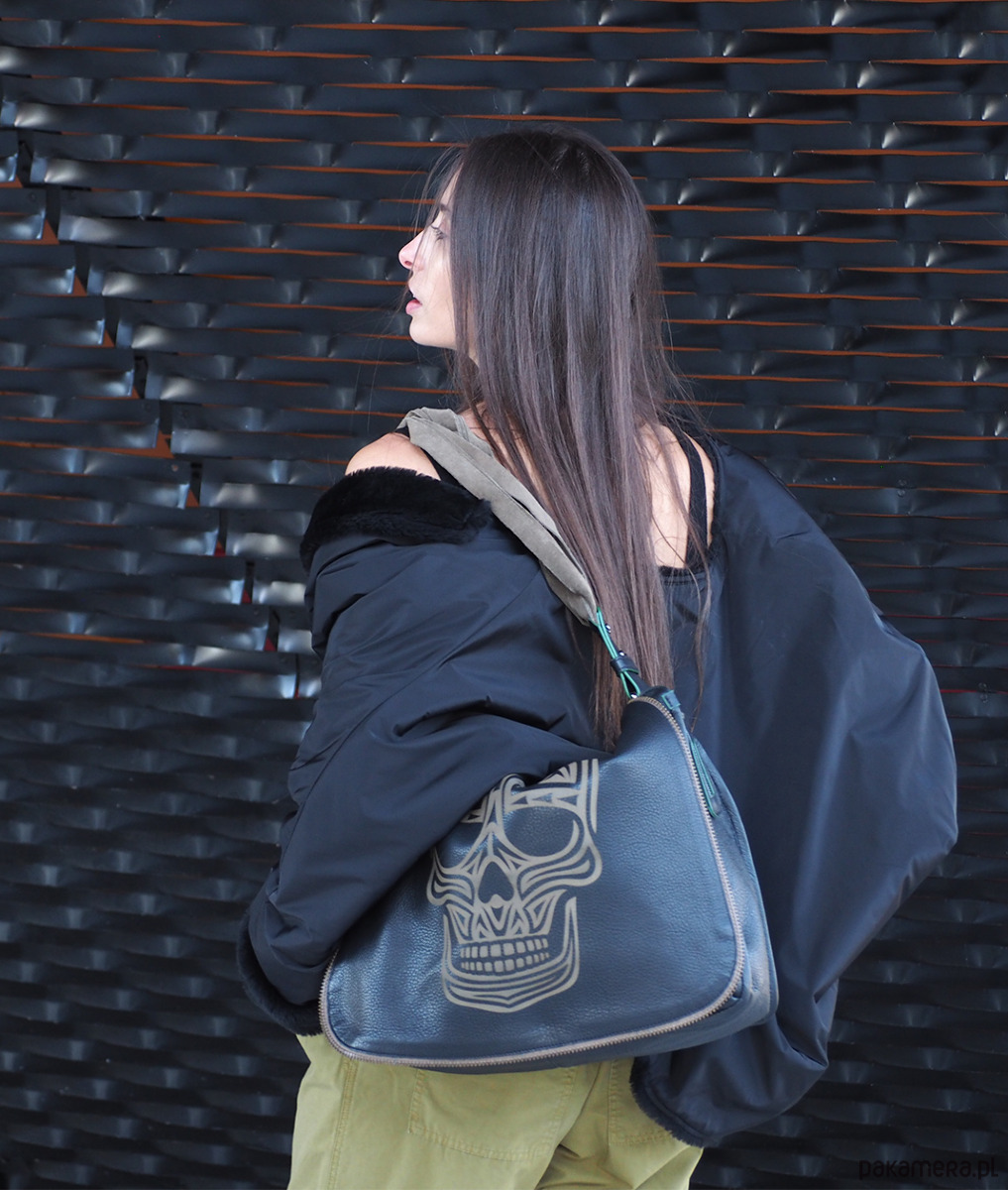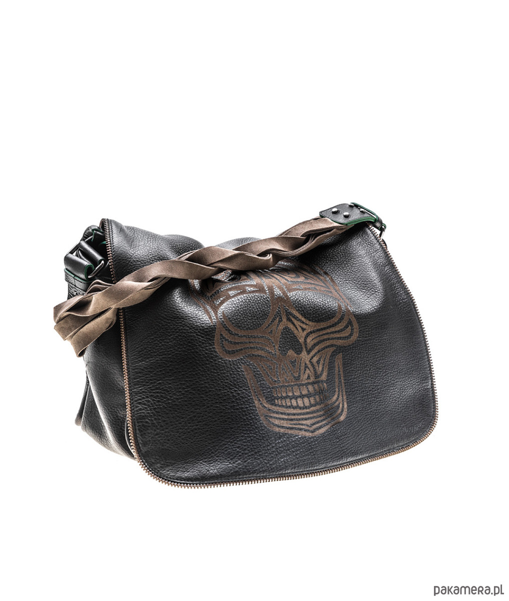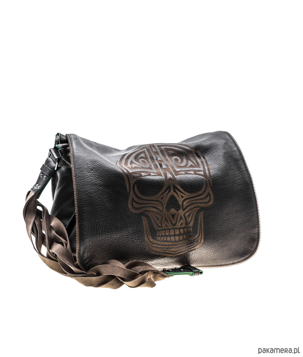 Front wykonany z czarnej skóry, zdobiony grawerowanym rysunkiem czaszki. Brzeg wykończony jest listwą suwakową z metalowymi elementami w kolorze starego złota.