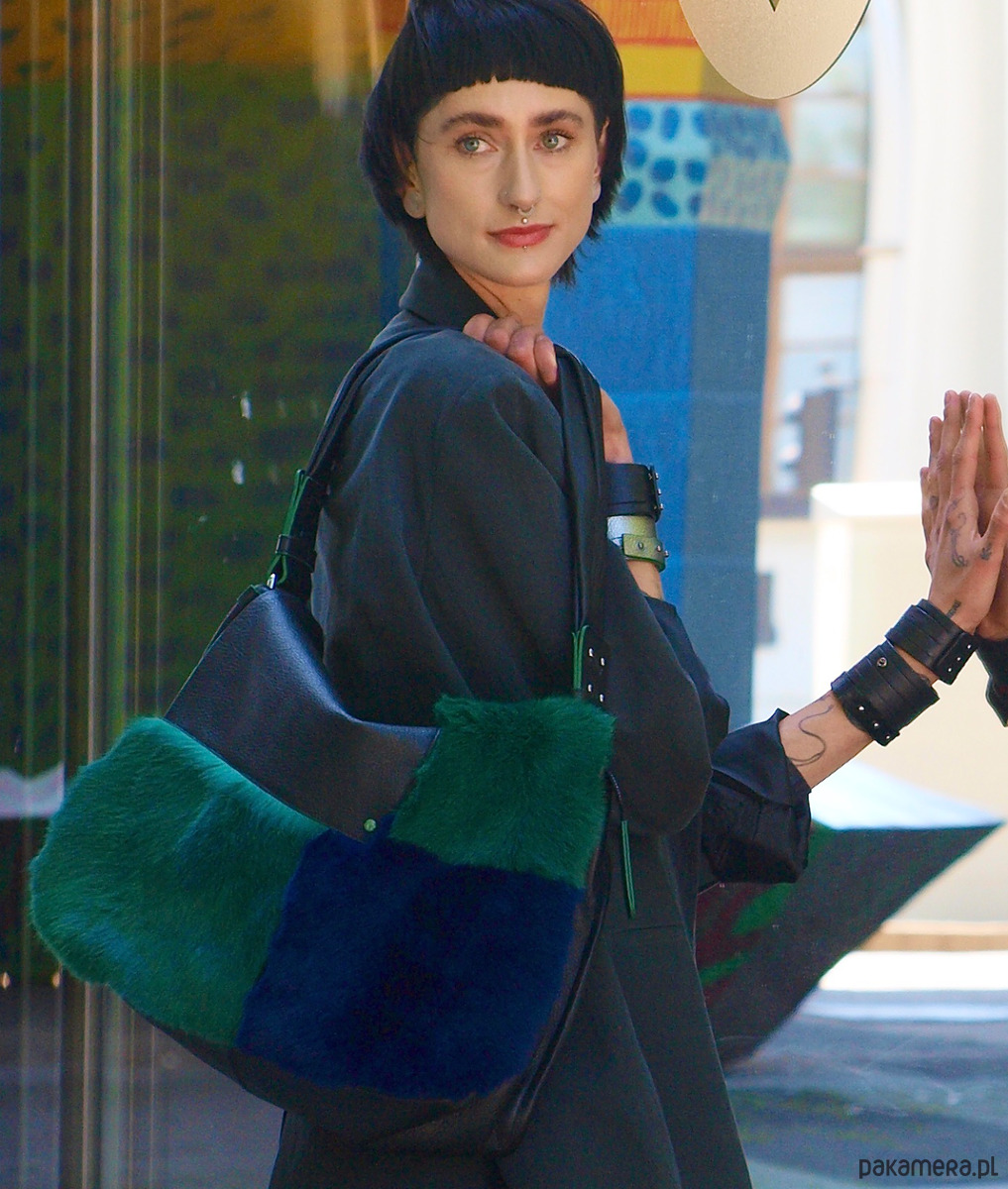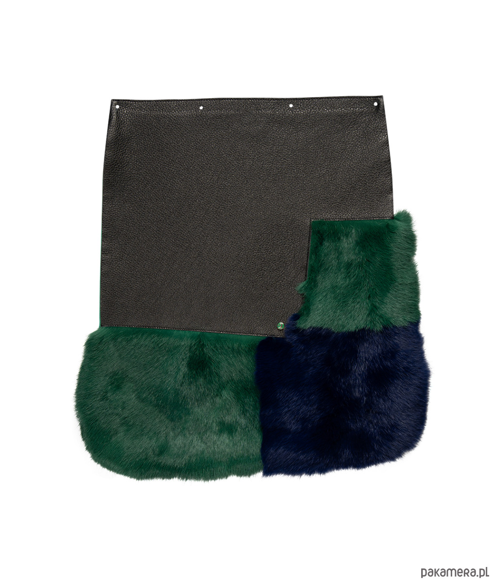 Wymienny front wykonany z czarnej skóry, tej samej, z której uszyte jest BODY, z dodatkiem sztucznych futerek w różnych kolorach. Druga strona wykończona zielonym zamszem.