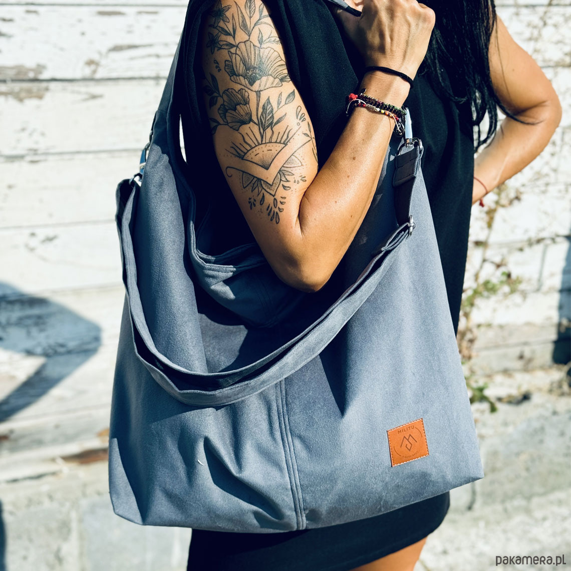 Na froncie torebki mieści się niewielka naszywka z logiem naszej marki. To co wyróżnią tą torbę to duża pojemność, łatwość czyszczenia oraz przyjemna w dotyku struktura materiału.