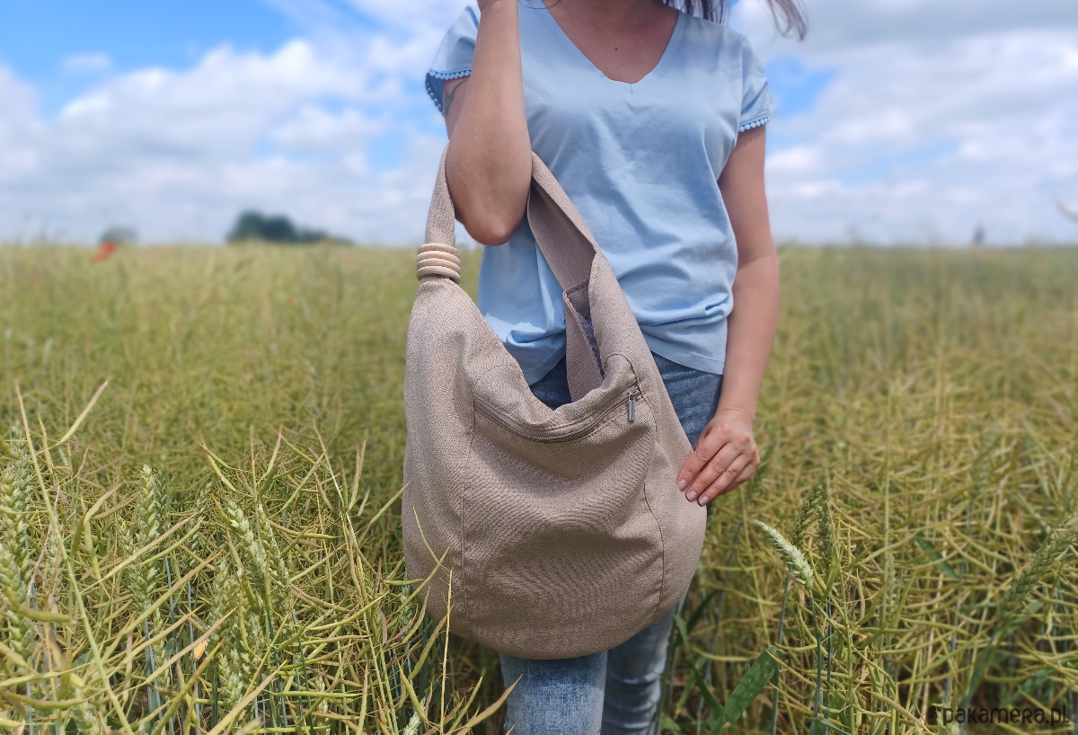 Duża torebka worek z plecionej tkaniny tapicerskiej przypominającej len.