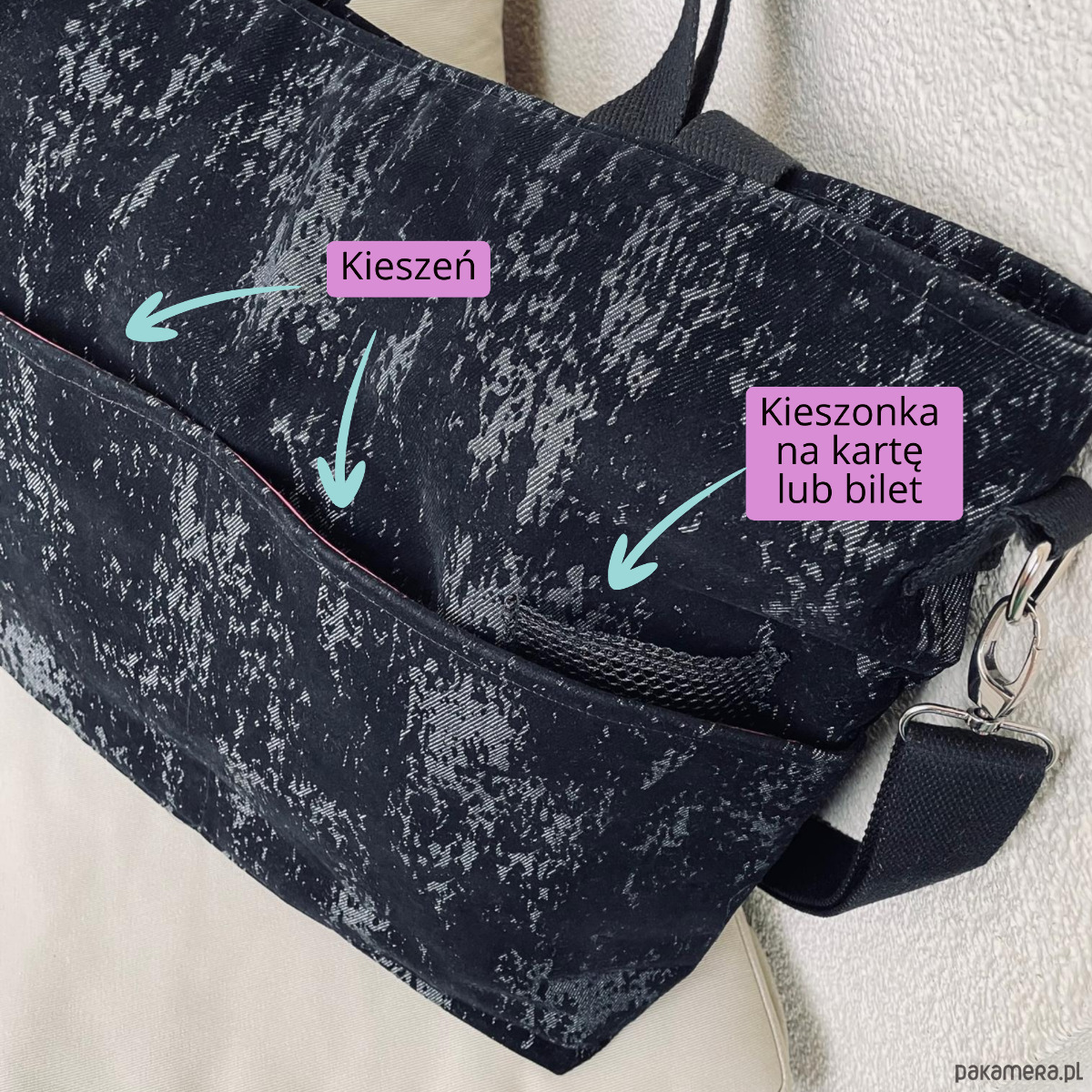 Na przedniej stronie torby duża kieszeń zasuwana na suwak. Na tylnej stronie dwie duże kieszenie. Torba posiada szerokie, bawełniane taśmy które nie wrzynają się w ramię. Na tylnej stronie torby podręczna kieszonka na bilet. Na froncie torebki znajduje się metka z logo marki.