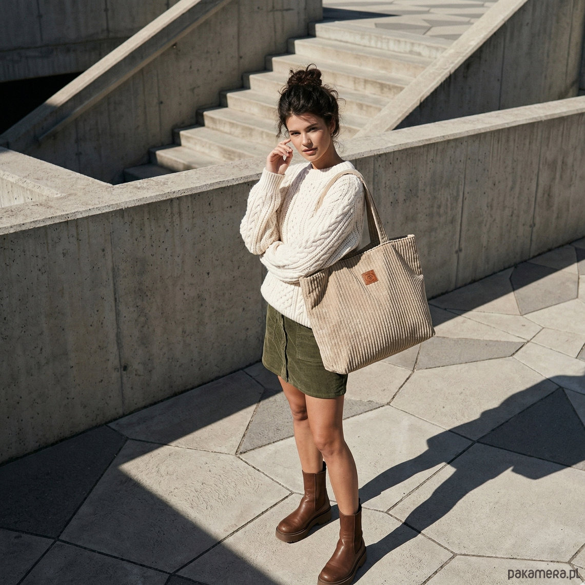 Jej klasyczny krój shopperki zyskuje zupełnie nowy, miejsko-sportowy charakter dzięki wyrazistej fakturze sztruksu. To materiał, który nie tylko świetnie wygląda i przyciąga wzrok, ale jest też niezwykle wytrzymały i przyjemny w codziennym użytkowaniu.