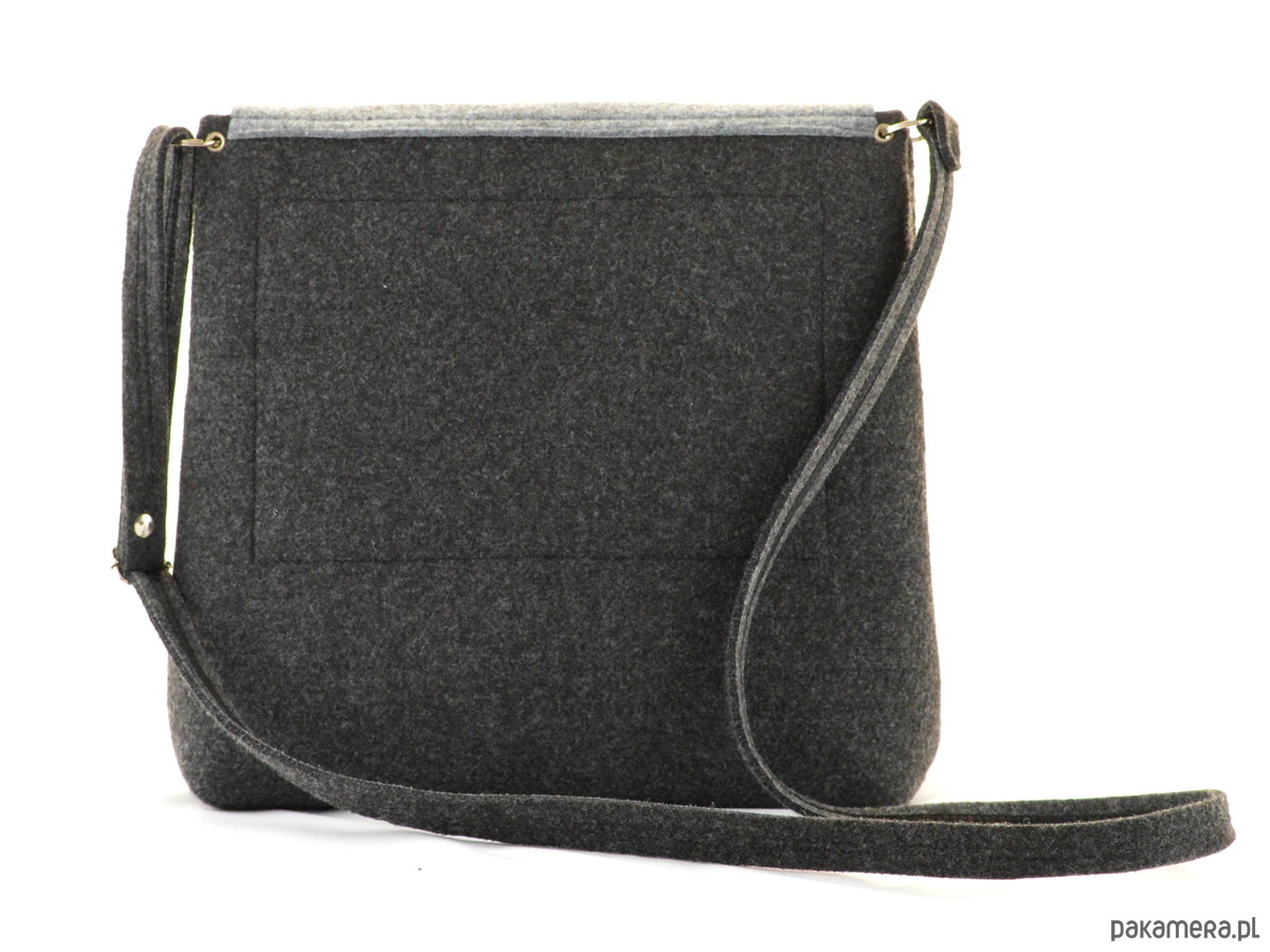 Torebka została wykonana z grubego, mocnego, impregnowanego filcu w kolorze szarym i grafitowym. Torebka jest naprawdę bardzo urocza! Szerokość torebki - około 31 cm, wysokość około 29 cm, głębokość około 10 cm. Torebka nie mieści formatu A4. Została wykonana z dbałością o każdy szczegół - klapa zapinana na magnes. Pod klapą jest kieszonka na telefon, a w środku duża kieszonka z zapięciem na suwak. Pasek do przewieszenia torebki przez ramię o długości około 145cm posiada regulator długości. Pasek został od lewej strony podszyty tasiemką satynową, co sprawiło, że jest bardzo mocny.