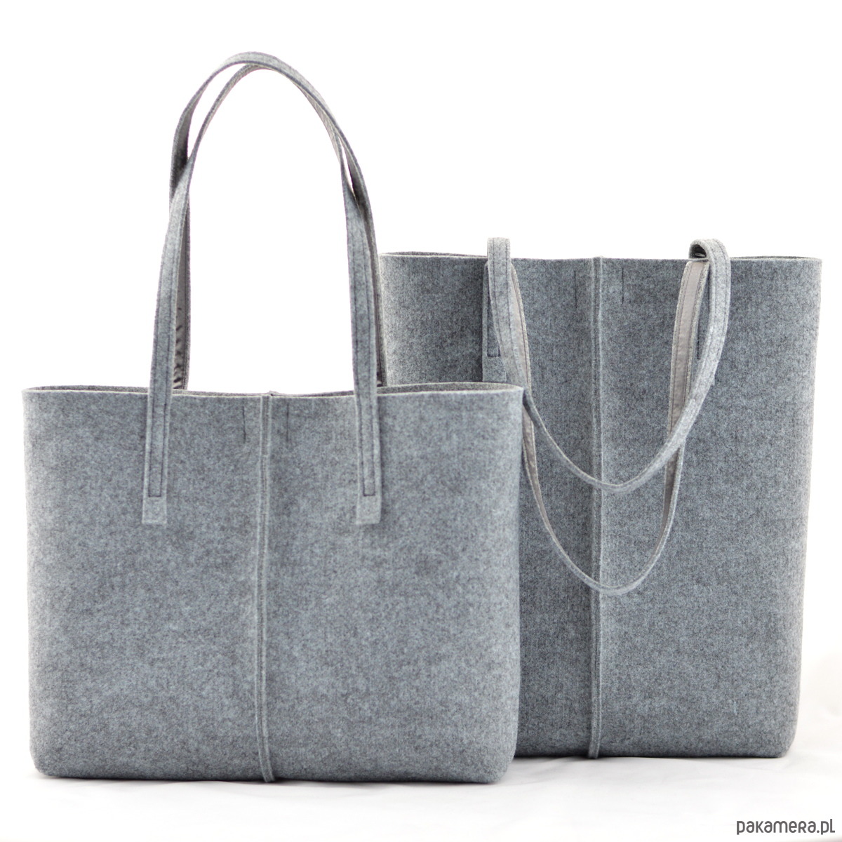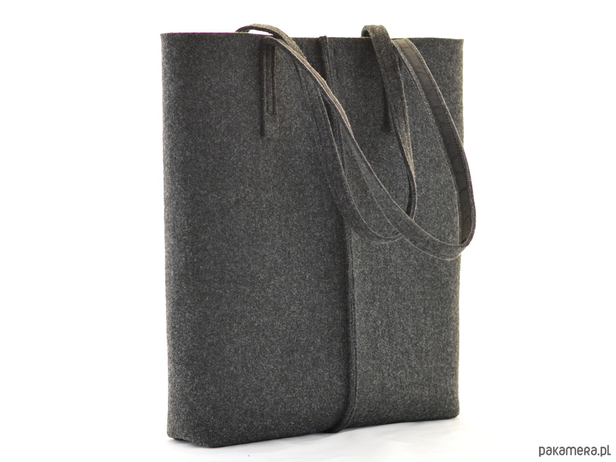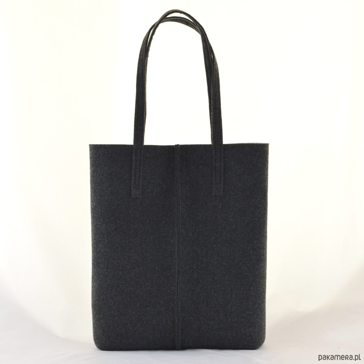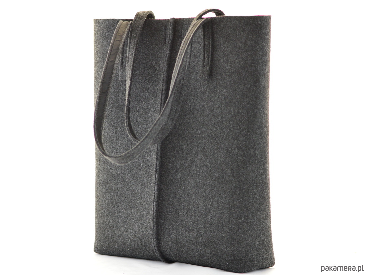 Torebka została wykonana z wytrzymałego, mocnego, polskiego filcu w kolorze grafitowym. Prosta, minimalistyczna forma. Rączki torebki zostały wzmocnione poprzez podszycie ich taśmą satynową. Torebka wygląda naprawdę ładnie! Szerokość torebki 36cm, wysokość bez rączki - około 41 cm, głebokość - 8cm, długość rączki od brzegu do brzegu torebki- 60cm. Została wykonana z dbałością o każdy szczegół. W środku znajdują się 2 filcowe kieszonki. Jedna na telefon, a druga jest zamykana na suwak. Torebka posiada zapięcie na magnes.