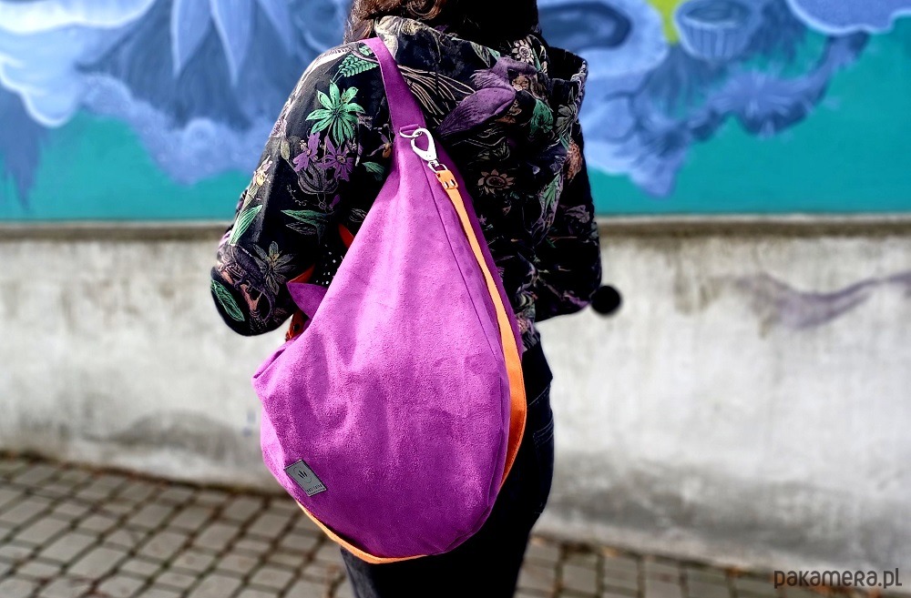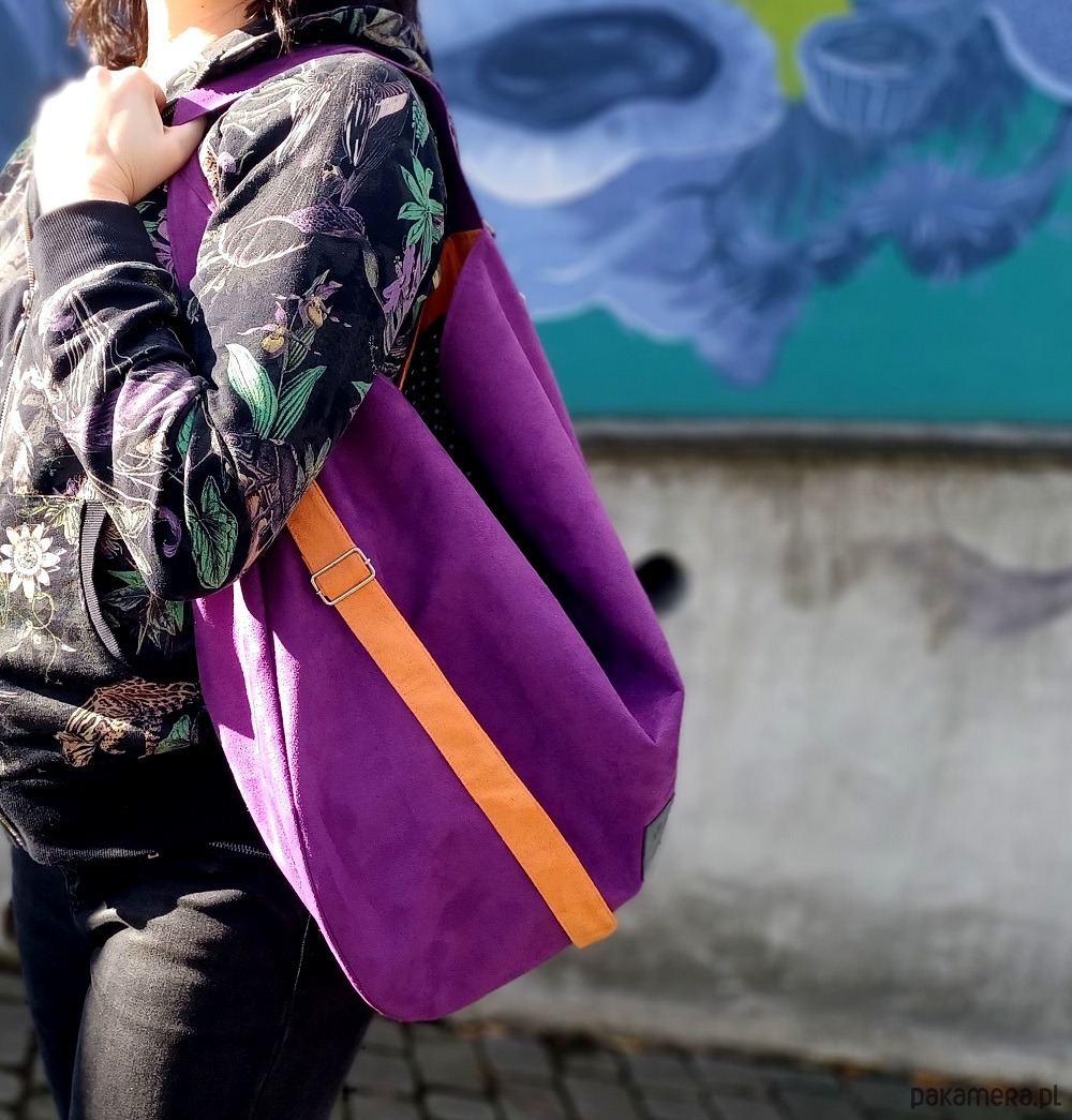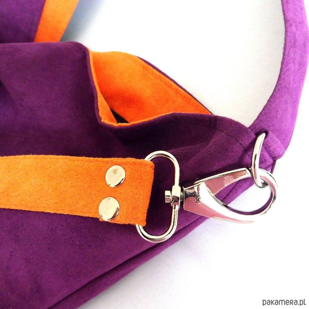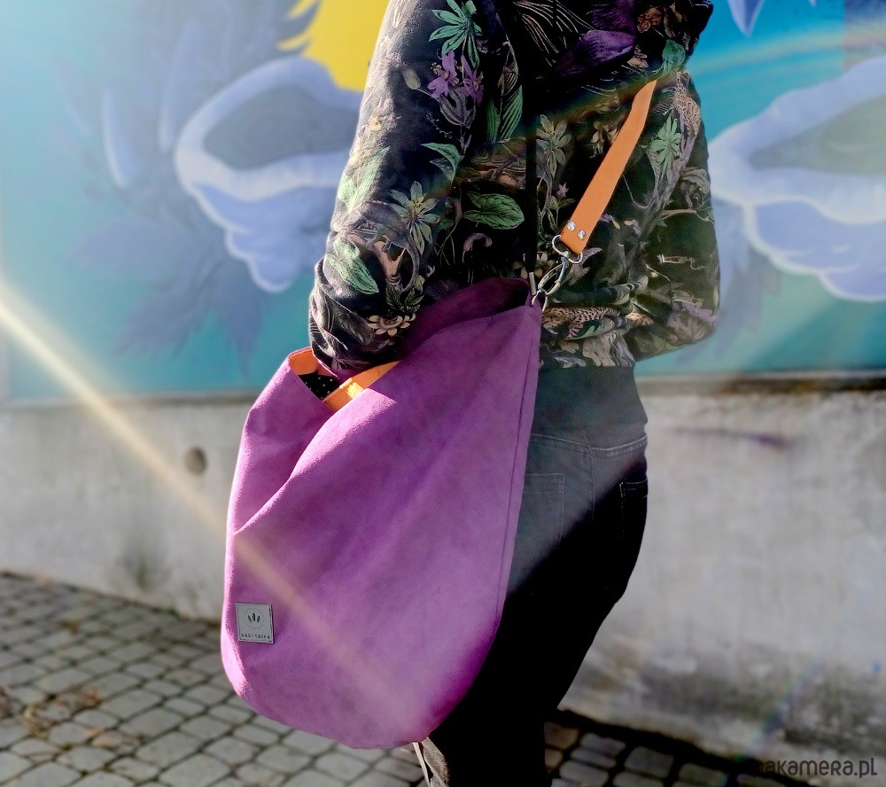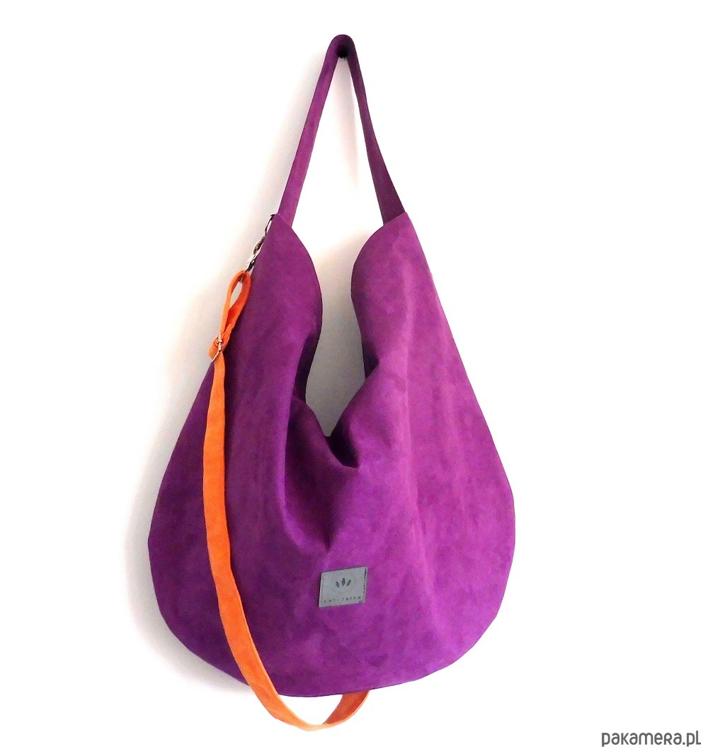 Miękka torebka worek w pięknym, nasyconym kolorze fioletowym z pomarańczowymi elementami.